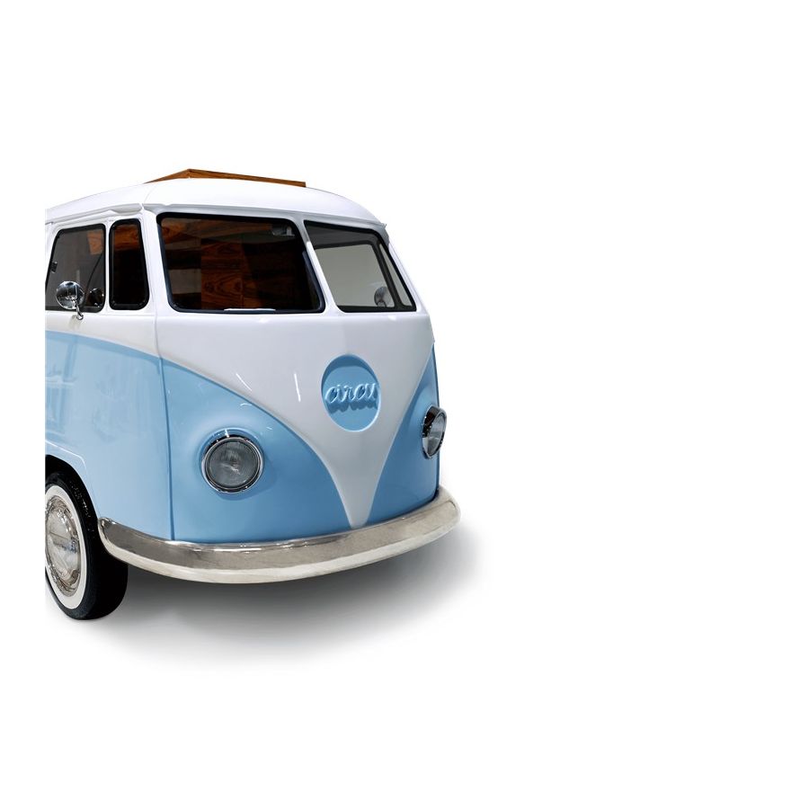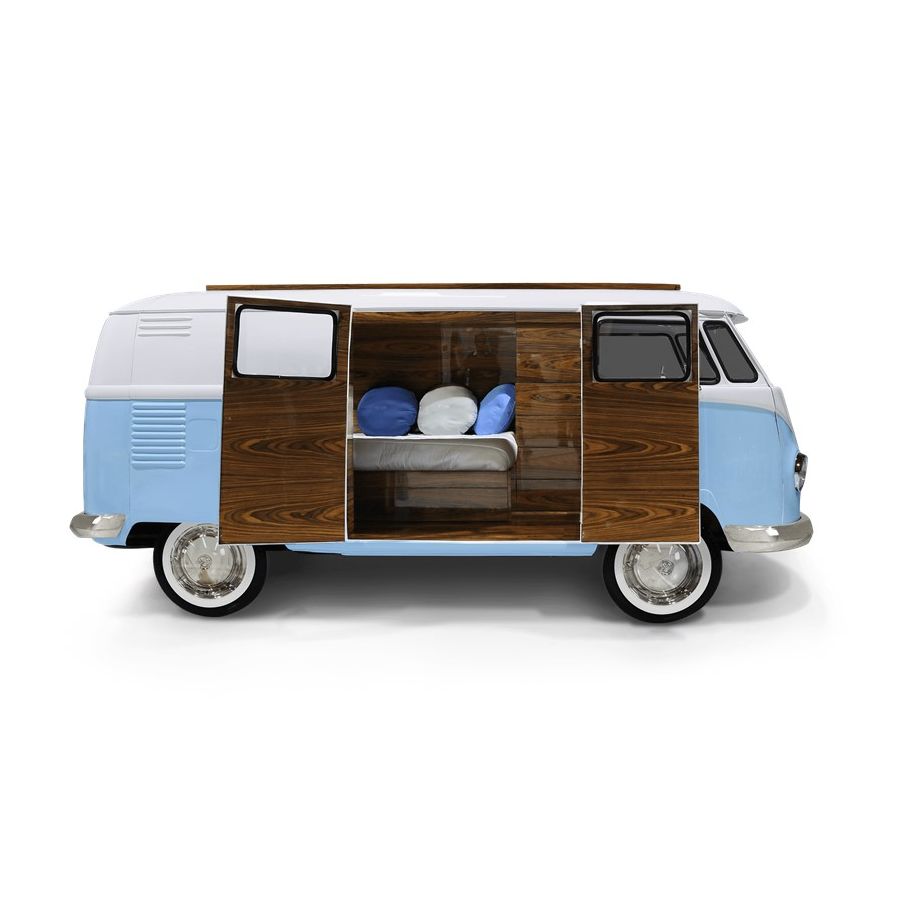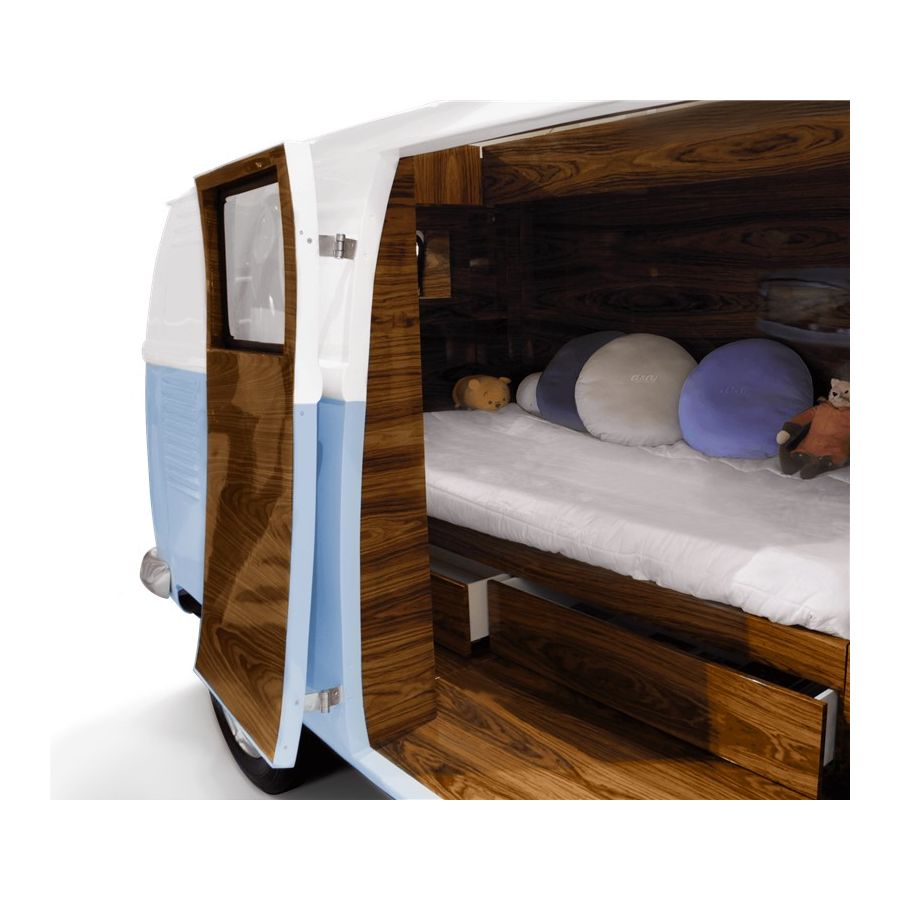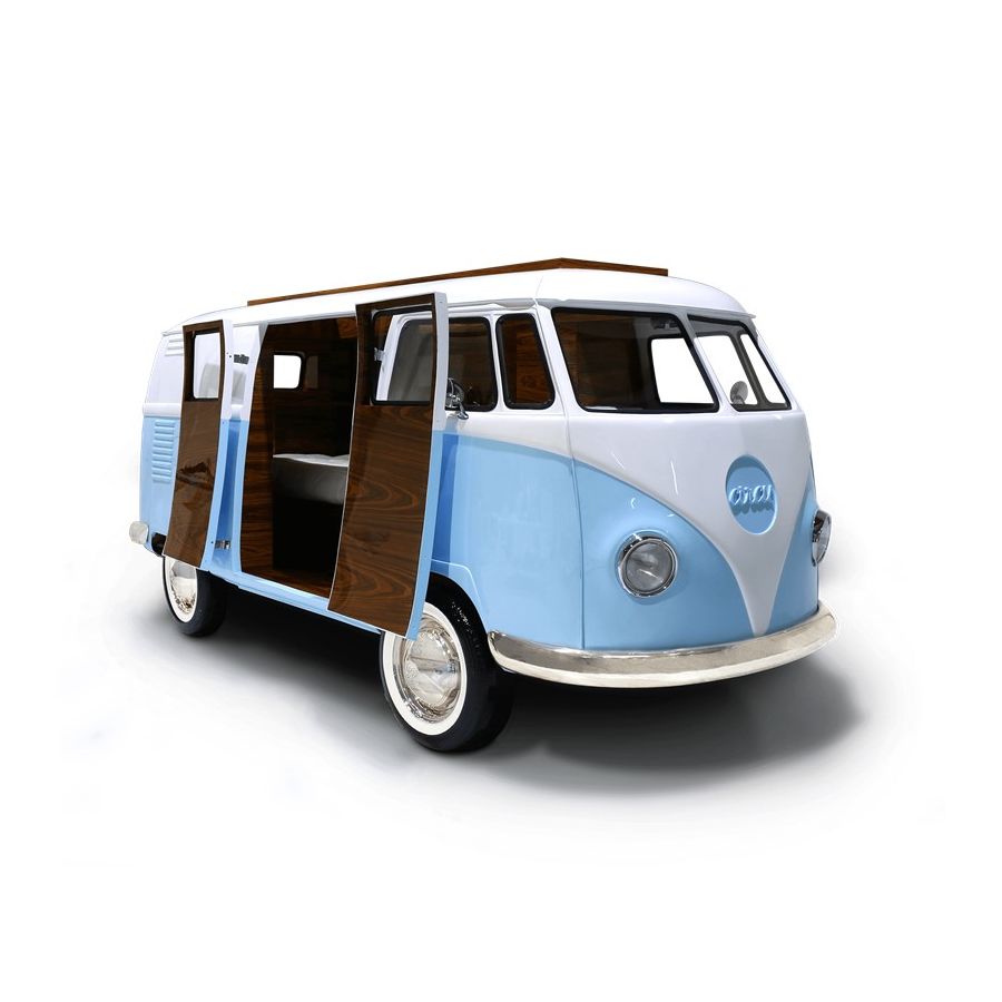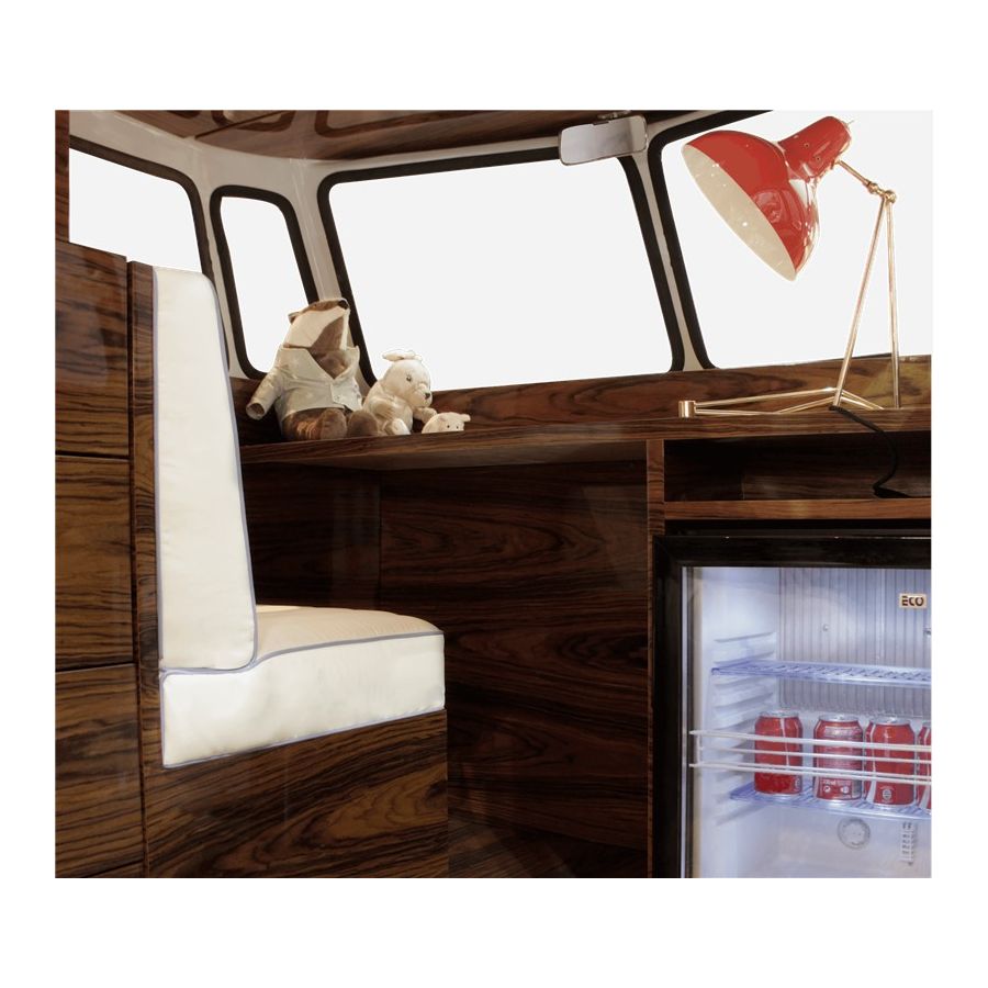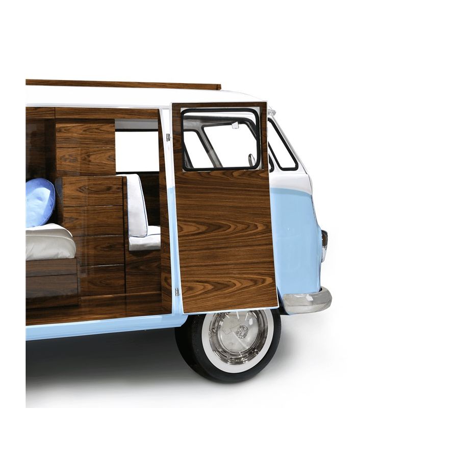 Bun Van is a unique kids bed inspired by the iconic 60’s camper van Fillmore from the Disney movie “Cars”. Is perfect to bring a total experience of fun and play to the children’s rooms. With the Bun Van, bedtime will be like an adventurous road trip. The exterior is produced in fiberglass with chrome-plated finishes and the inside is made of palisander wood veneer, containing several storage compartments, a bed, a TV, desk, mini bar and a sofa. It is a complete bedroom set for a children’s space.