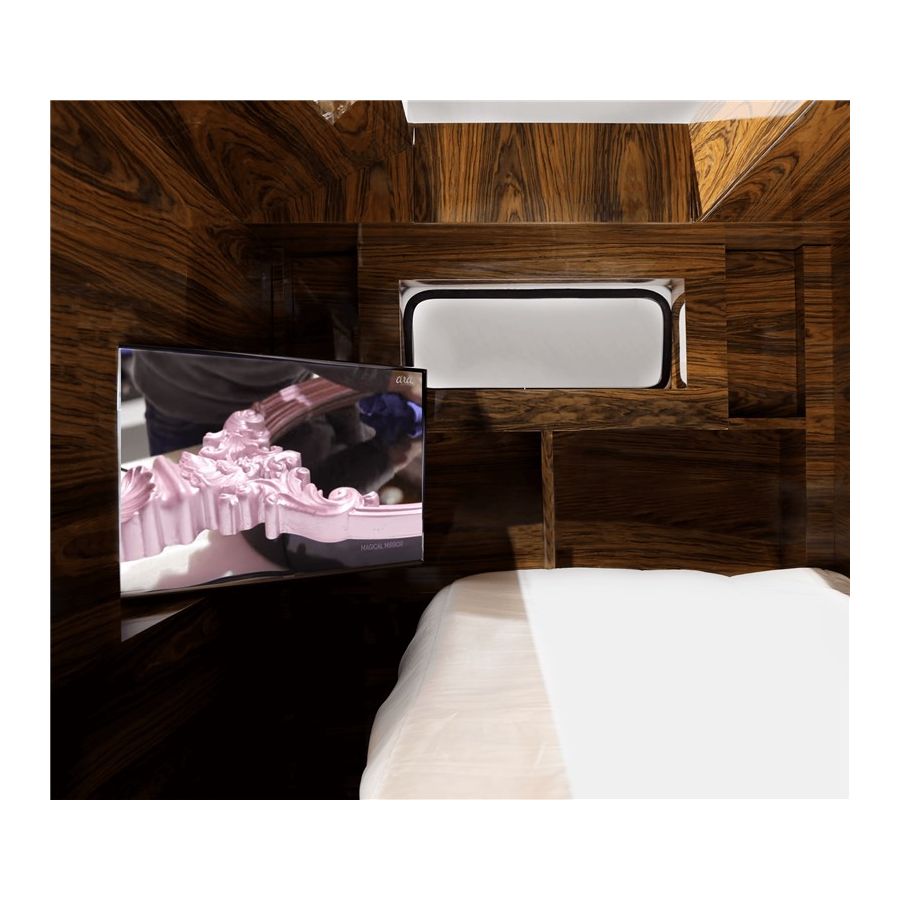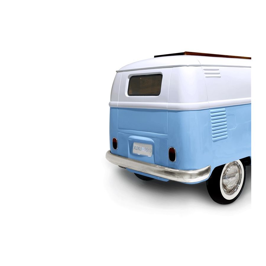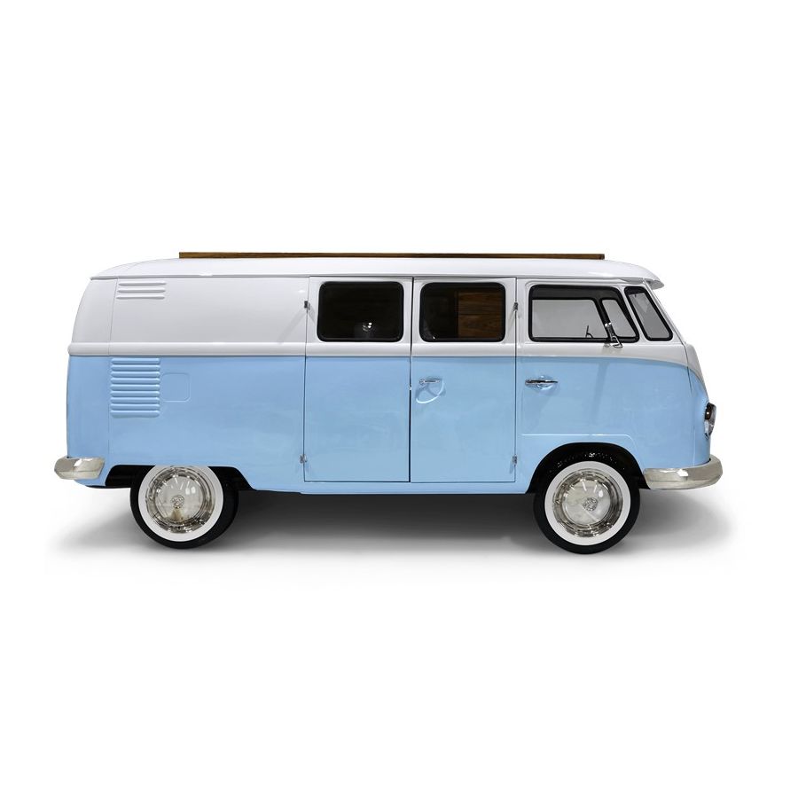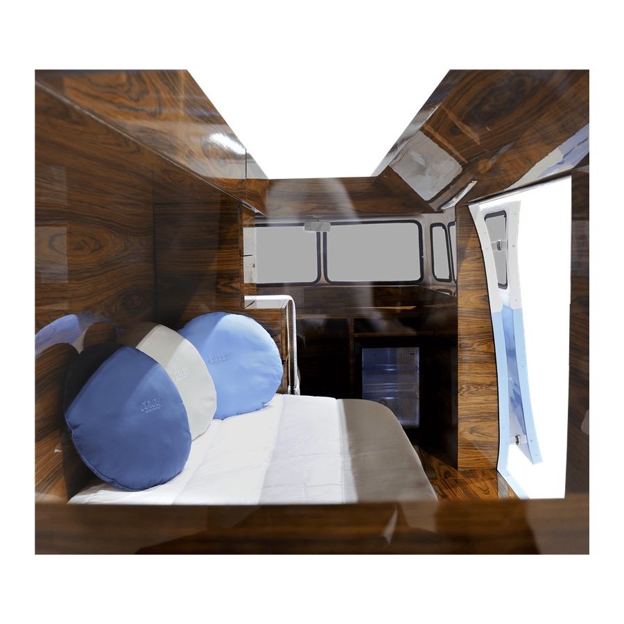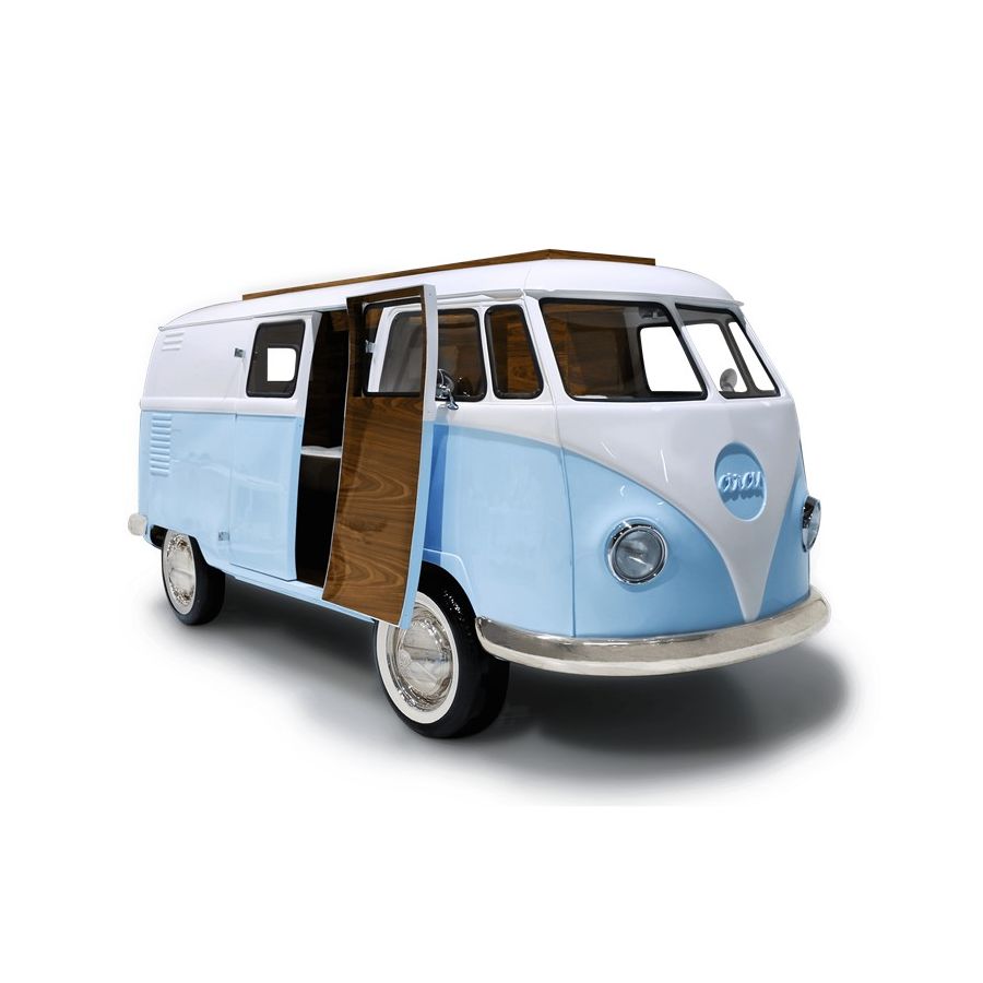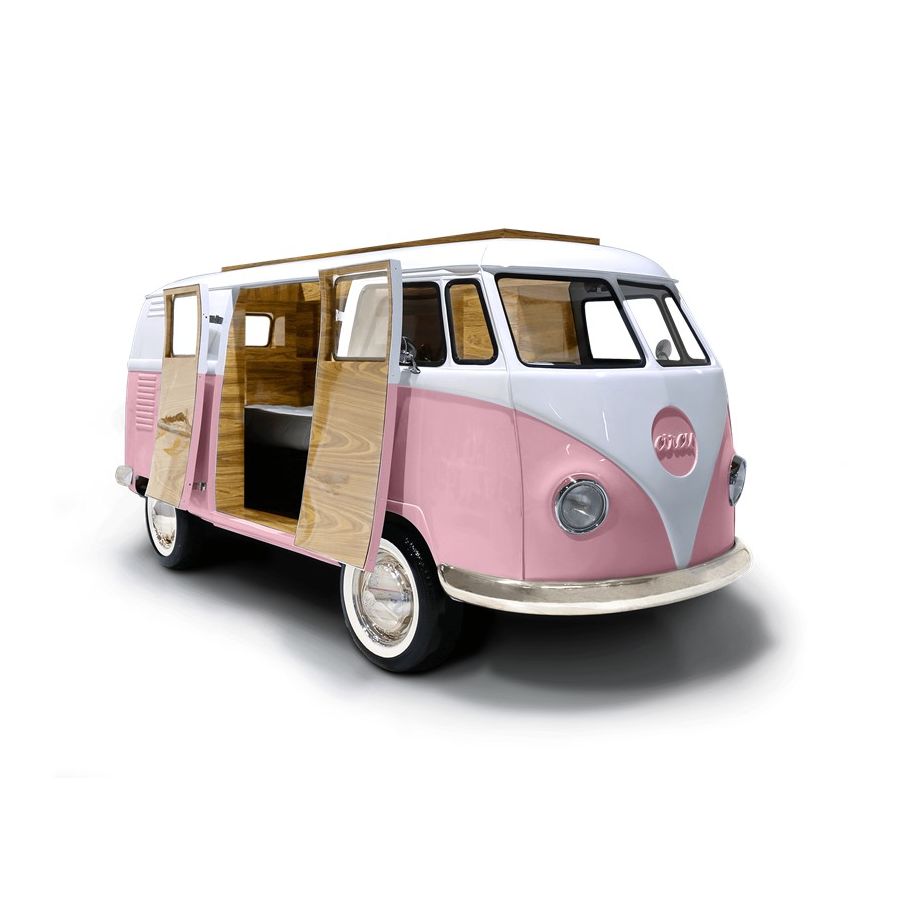 Bun Van is a unique kids bed inspired by the iconic 60’s camper van Fillmore from the Disney movie “Cars”. Is perfect to bring a total experience of fun and play to the children’s rooms. With the Bun Van, bedtime will be like an adventurous road trip. The exterior is produced in fiberglass with chrome-plated finishes and the inside is made of palisander wood veneer, containing several storage compartments, a bed, a TV, desk, mini bar and a sofa. It is a complete bedroom set for a children’s space.