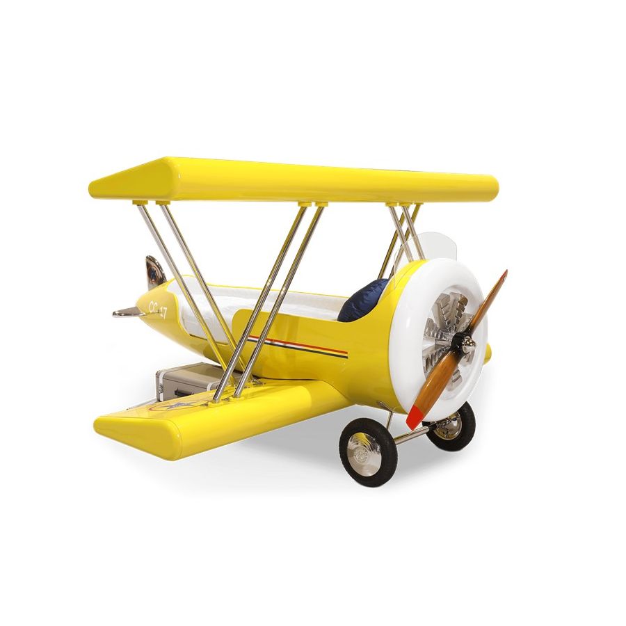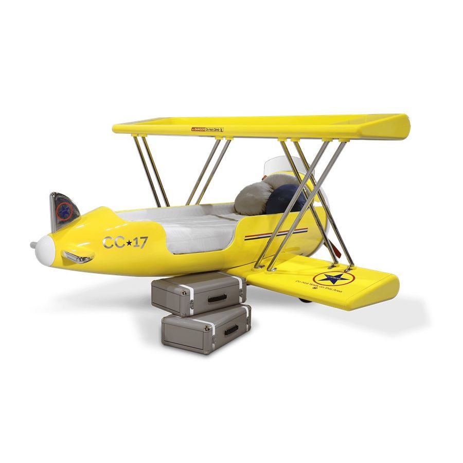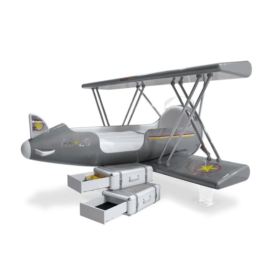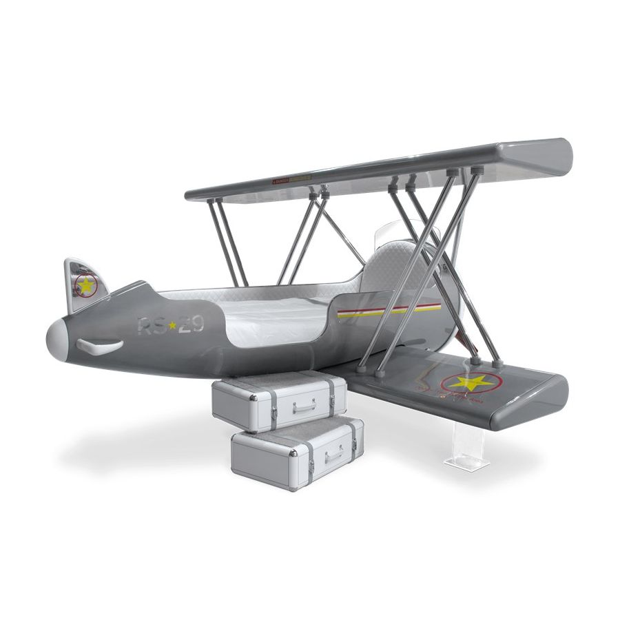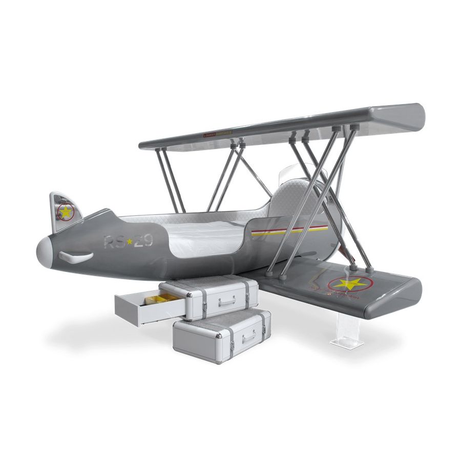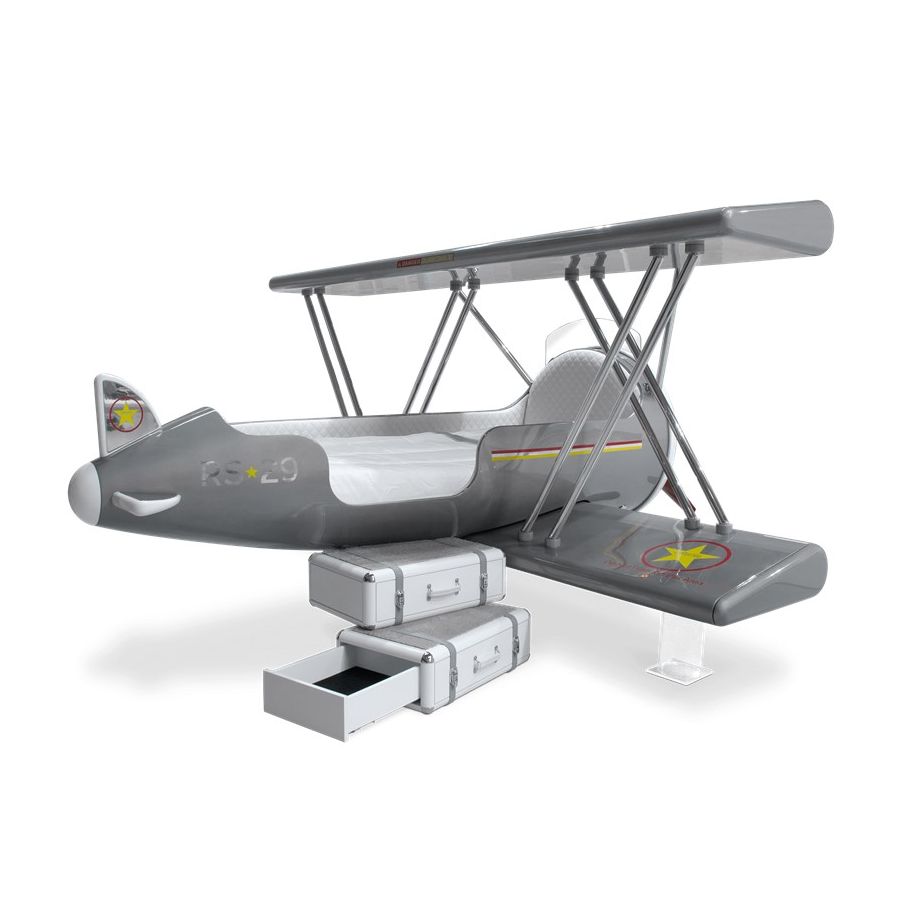 The Sky B Plane is an airplane kids bed with an aviation-inspired design that it’s meant to be educational and engaging. An airplane theme decoration for kids’ rooms is perfect to encourage the adventurous spirit of children.Inspired by kids’ fantasy world, they will easily relate this kids’ themed bed to the Disney movie “Planes” character Leadbottom, an iconic biplane wing aircraft used in the early years of aviation.The body is entirely made of fiberglass with glossy varnish applied and chrome plated finishes in the engine and wheels. The Sky B Plane has several storage compartments and the top wing is designed to be used as a bookshelf. The decorative suitcases include secret storage compartments and allow an easy access to the bed.