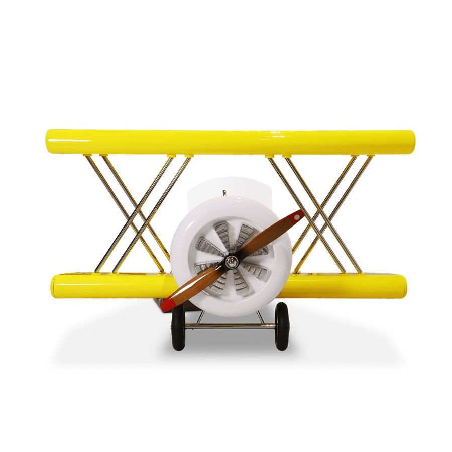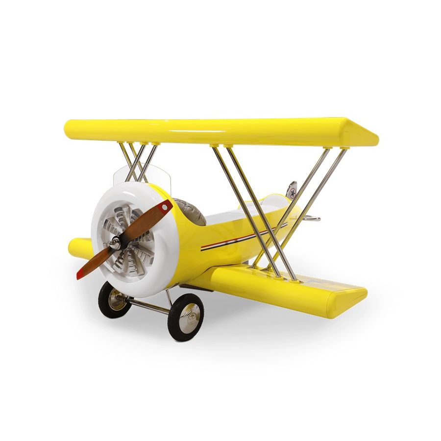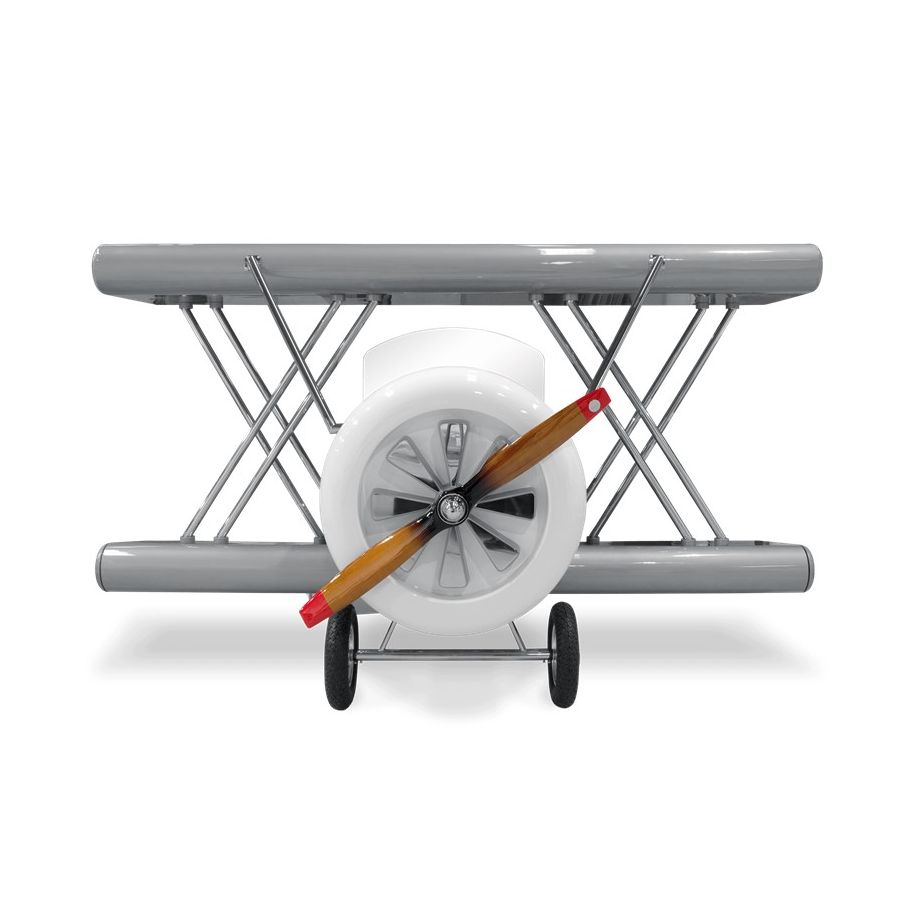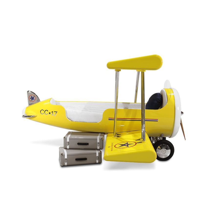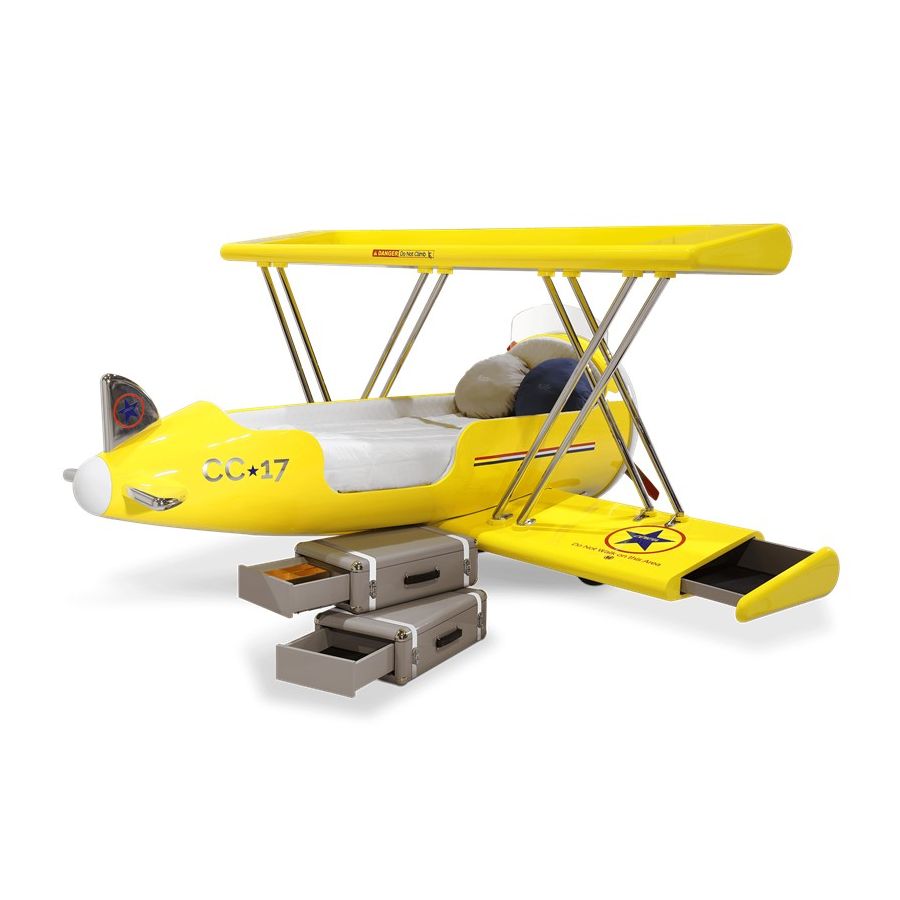 The Sky B Plane is an airplane kids bed with an aviation-inspired design that it’s meant to be educational and engaging. An airplane theme decoration for kids’ rooms is perfect to encourage the adventurous spirit of children.Inspired by kids’ fantasy world, they will easily relate this kids’ themed bed to the Disney movie “Planes” character Leadbottom, an iconic biplane wing aircraft used in the early years of aviation.The body is entirely made of fiberglass with glossy varnish applied and chrome plated finishes in the engine and wheels. The Sky B Plane has several storage compartments and the top wing is designed to be used as a bookshelf. The decorative suitcases include secret storage compartments and allow an easy access to the bed.
