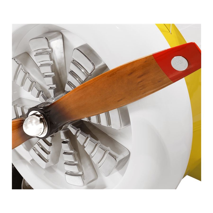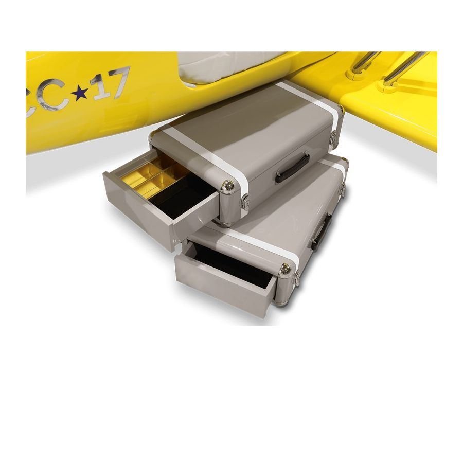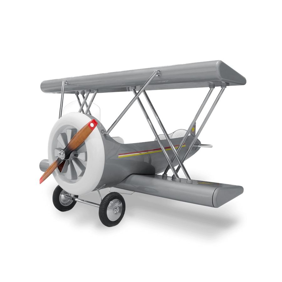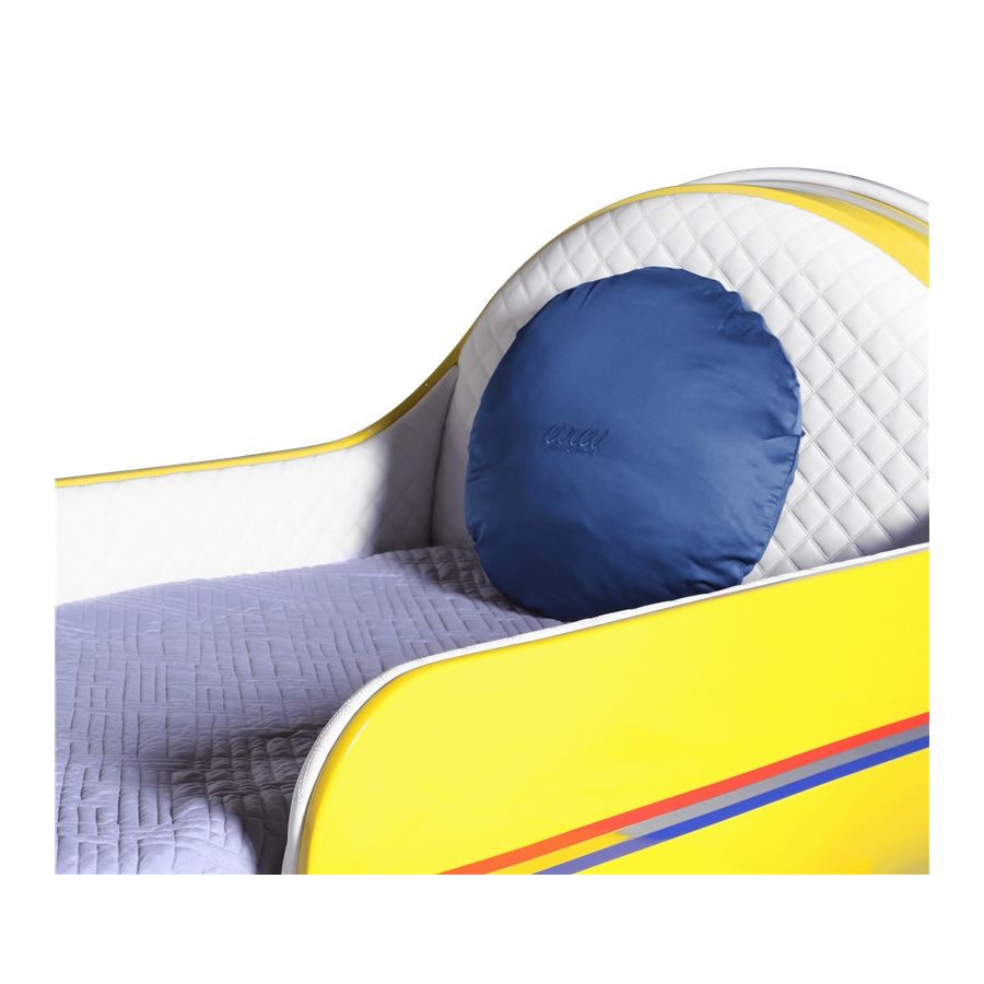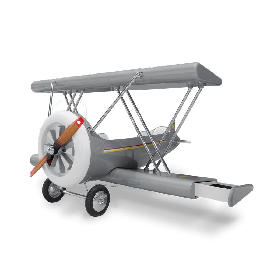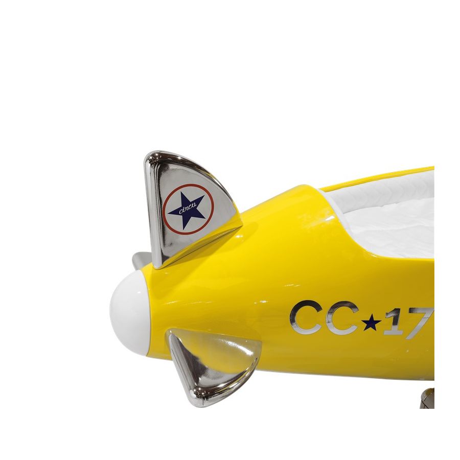 The Sky B Plane is an airplane kids bed with an aviation-inspired design that it’s meant to be educational and engaging. An airplane theme decoration for kids’ rooms is perfect to encourage the adventurous spirit of children.Inspired by kids’ fantasy world, they will easily relate this kids’ themed bed to the Disney movie “Planes” character Leadbottom, an iconic biplane wing aircraft used in the early years of aviation.The body is entirely made of fiberglass with glossy varnish applied and chrome plated finishes in the engine and wheels. The Sky B Plane has several storage compartments and the top wing is designed to be used as a bookshelf. The decorative suitcases include secret storage compartments and allow an easy access to the bed.
