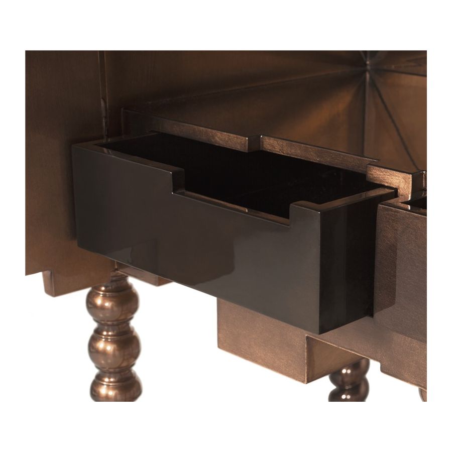 This unique cabinet features a unique finishes and remarkable design elements, inspired in the classic Manueline style. The cabinet body is covered in hand painted azulejo tiles and mirrors. Its legs are made from solid mahogany, and are crafted to a traditional form, finished in high gloss browjn lacquer gradient.