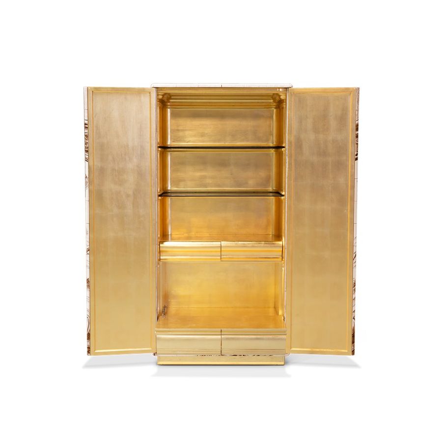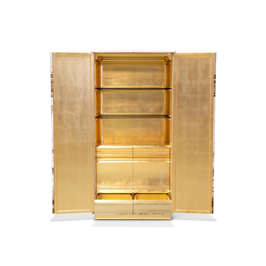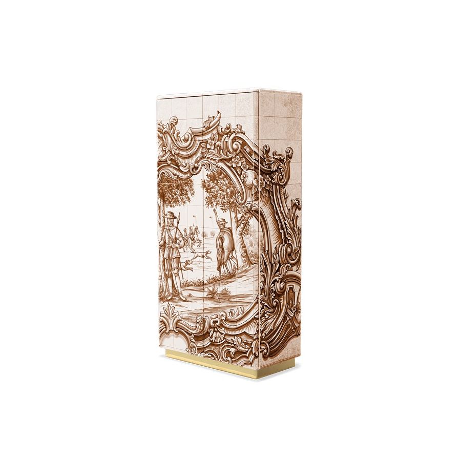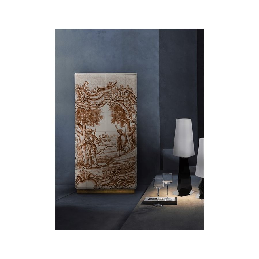 The Heritage Cabinet is a magnificent journey through Portuguese legacy. Covered in Azulejos, traditional hand painted tiles and one of the most representative art forms of Portuguese culture, the architectural cabinet portrays different scenes from the country’s Discoveries era. Centuries of history are gathered in a single final panel, and each layer is enhanced by vertical mirrors on the lateral surfaces. The hint of wander through the rich legacy continues when two doors open to a lined glossy gold leaf interior, and a classical ornament trim reminds the inside of churches and rich buildings. A clear glass shelve can be seen on the two individual divisions of the sideboard. A statement cabinet, the Heritage can take center stage in the most elegant rooms since its back is also fully hand painted. A lengthy tradition of bespoke and exclusivity to make one-of-kind design pieces.