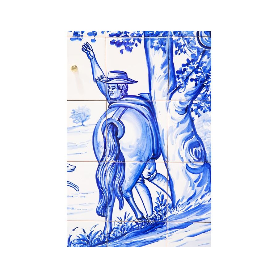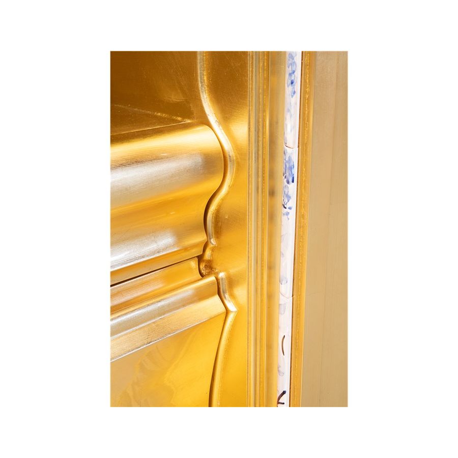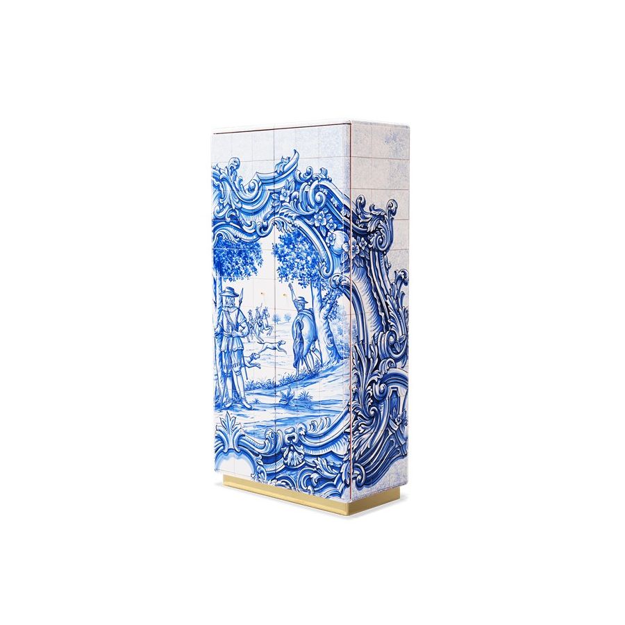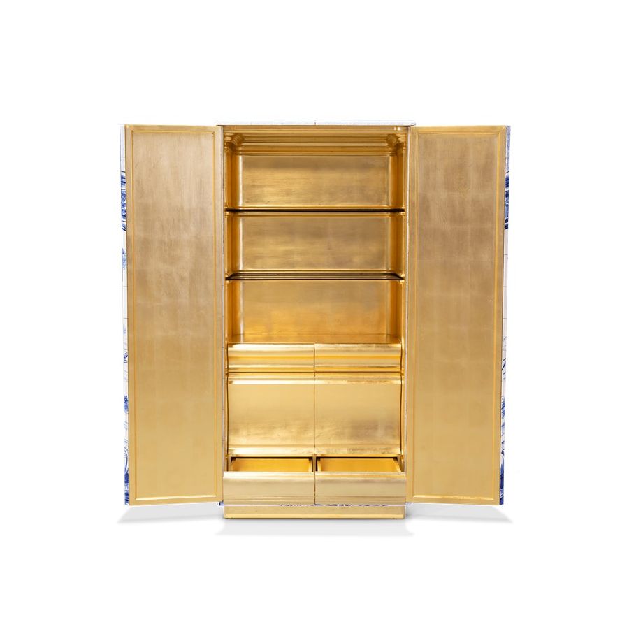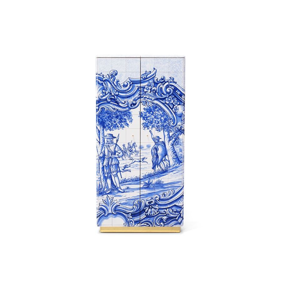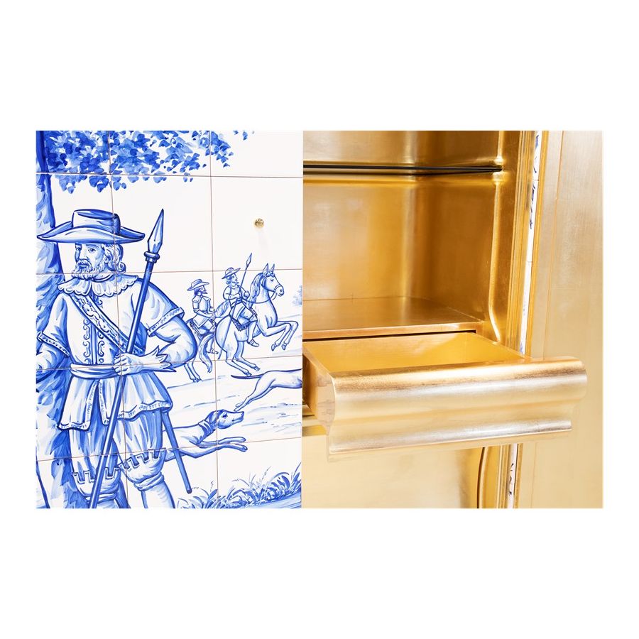 The Heritage Cabinet is a magnificent journey through Portuguese legacy. Covered in Azulejos, traditional hand painted tiles and one of the most representative art forms of Portuguese culture, the architectural cabinet portrays different scenes from the country’s Discoveries era. Centuries of history are gathered in a single final panel, and each layer is enhanced by vertical mirrors on the lateral surfaces. The hint of wander through the rich legacy continues when two doors open to a lined glossy gold leaf interior, and a classical ornament trim reminds the inside of churches and rich buildings. A clear glass shelve can be seen on the two individual divisions of the sideboard. A statement cabinet, the Heritage can take center stage in the most elegant rooms since its back is also fully hand painted. A lengthy tradition of bespoke and exclusivity to make one-of-kind design pieces.