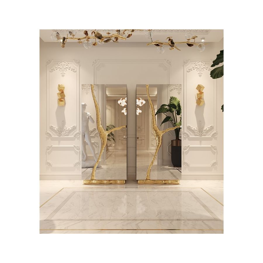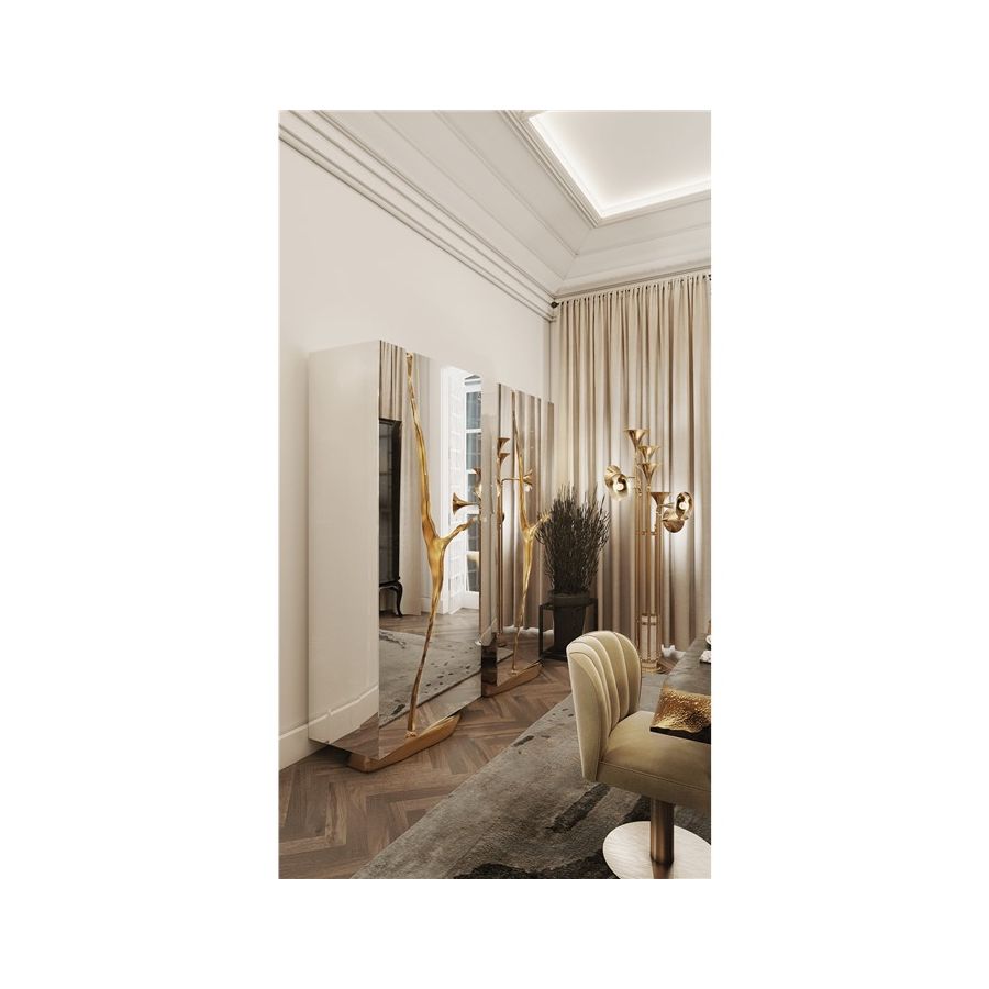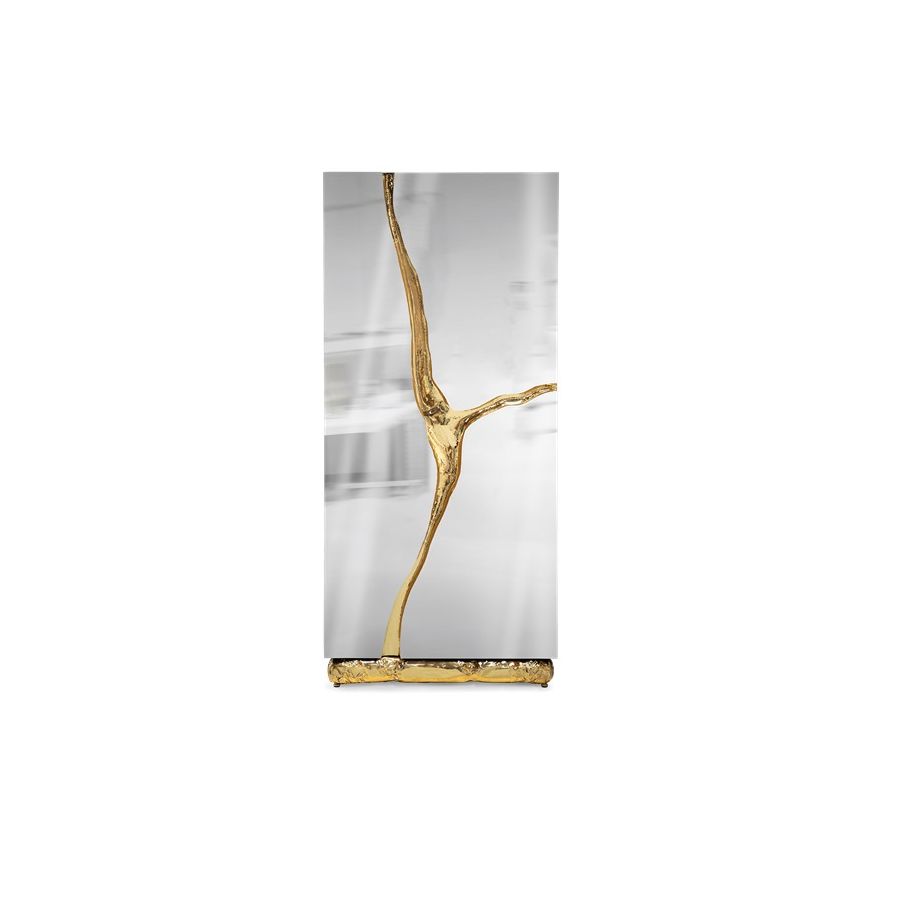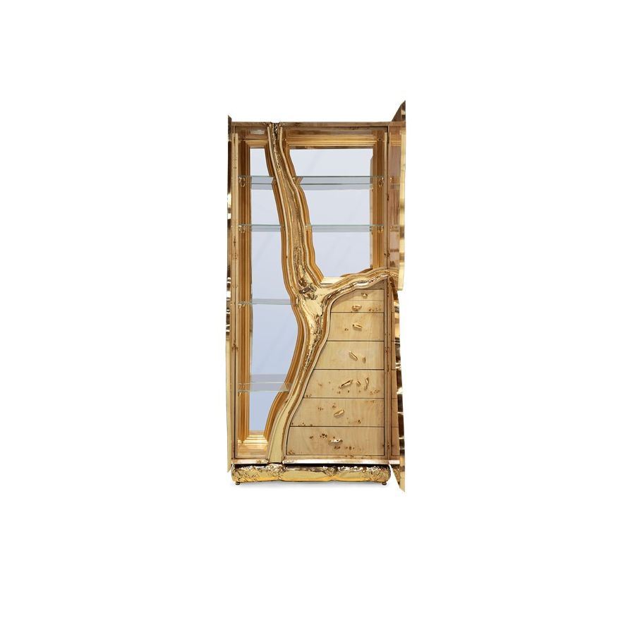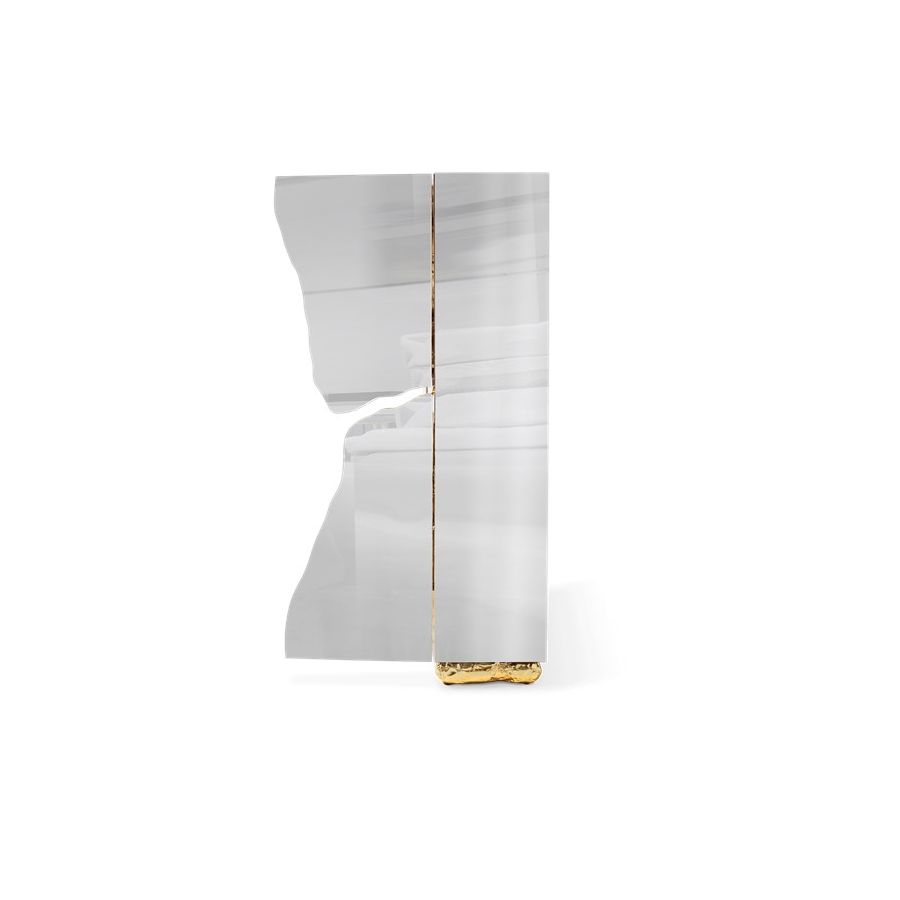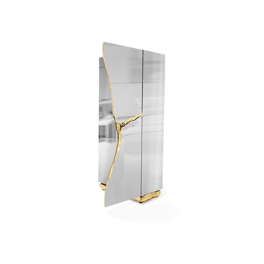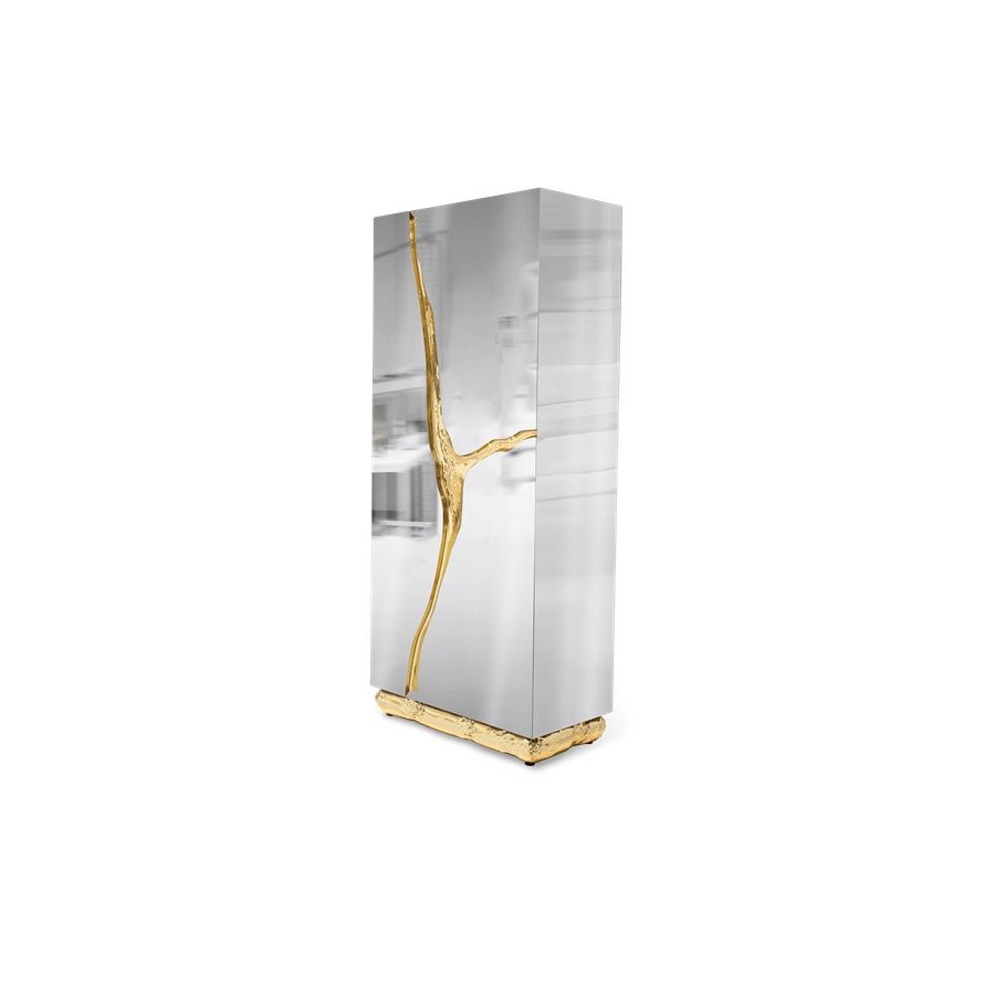 Lapiaz cabinet takes exceptional craftsmanship and design to a new realm. Finding beauty in the most unexpected places, this contemporary design piece is inspired by authentic karst formations. Its organic features are achieved through the manual fitting of polished brass, and a sharp finish in polished stainless steel that portrays a perfect mirror. Different-shaped doors and drawer open to a distinct poplar root wood veneer interior. The hammered gold details and the mirrored façade conveys both dynamics and elegance, a beautiful duality between power and refinement to bring a new contemporary verve into interior design. A functional artwork piece born from cold and freshly cracked to showing off the world rich, golden details.