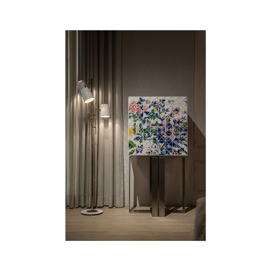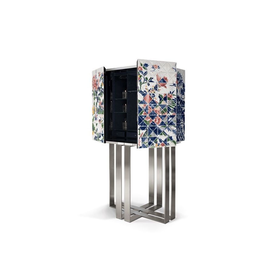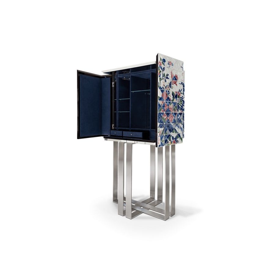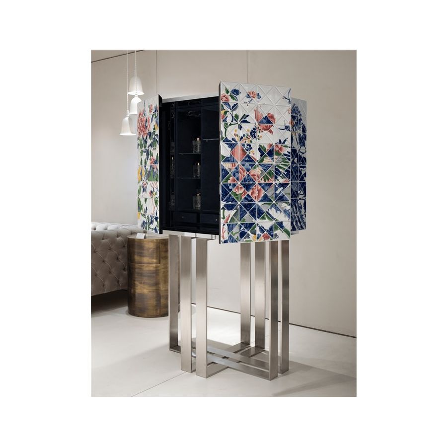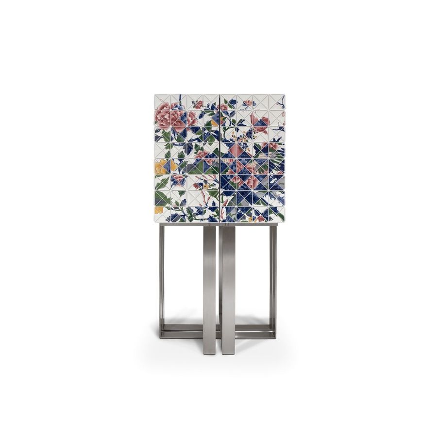 The elegant bar cabinet is covered by 1090 small porcelain triangles, 741 of which are hand-painted by the Vista Alegre manufacturing team. Precious floral and colorful details in shades of blue, pink, yellow, and green, that took 500 work-hours of the most skilled master artisans. A garden full of Paeonia flowers, where mythic Chinese birds live. Two upholstered doors in blue velvet fabric open for a mirrored storage space with three interior small drawers. The geometrical base in brushed steel gives this statement piece a unique and sophisticated character. One-of-a-kind piece for those who appreciate the exclusive design, daring the next generation to own it.