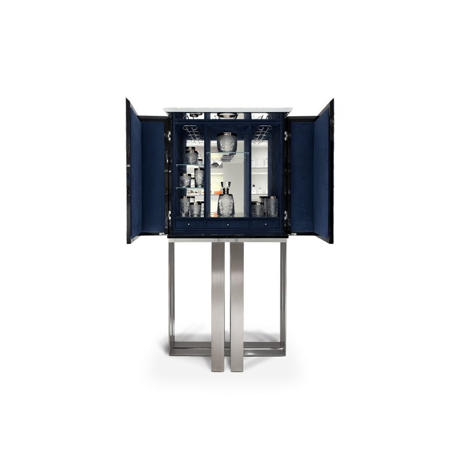 Contemporary bar cabinet covered of 1090 hand-painted ceramic triangles. Two upholstered doors in blue velvet fabric open for a mirrored storage space with three interior small drawers. Geometrical base in brushed steel.