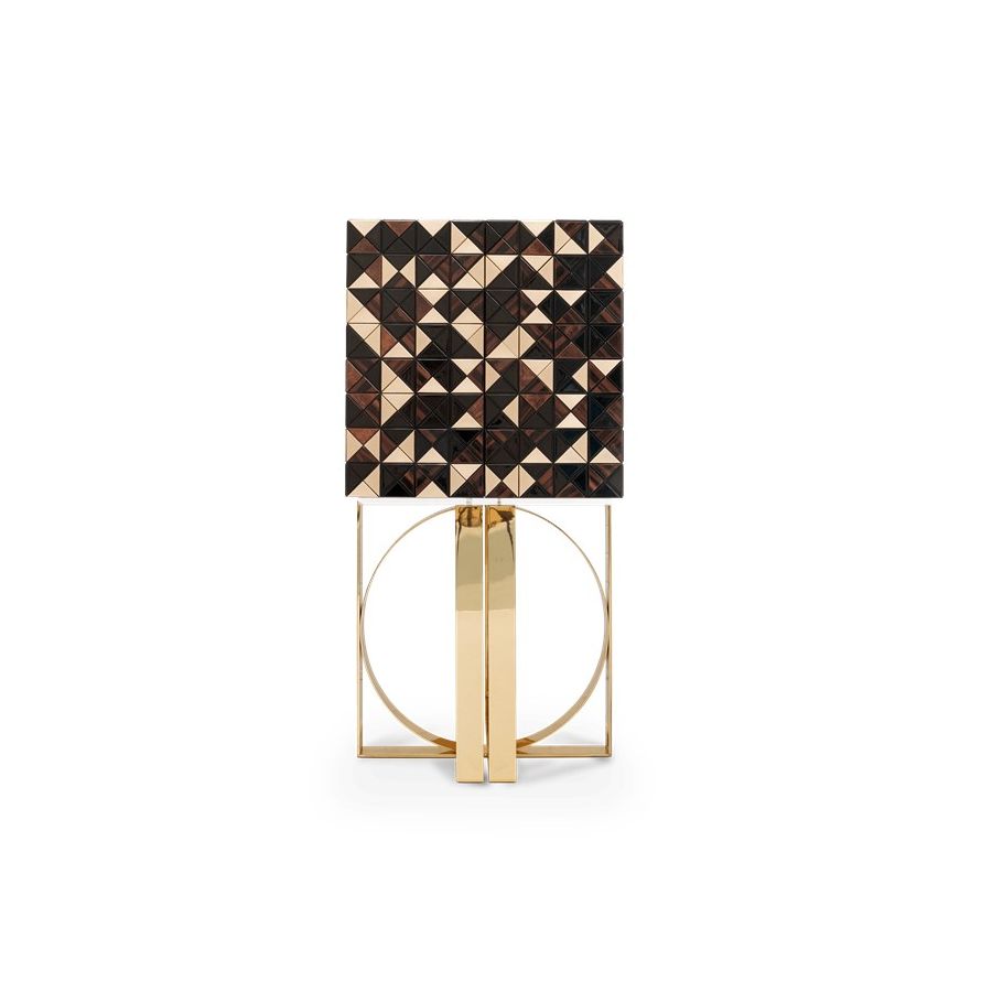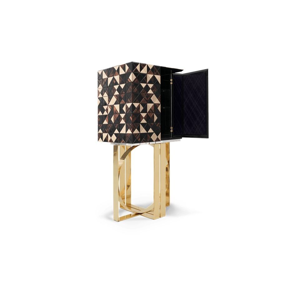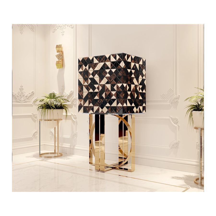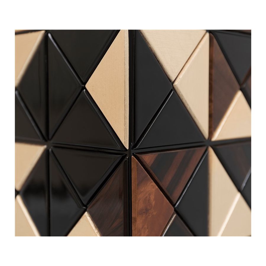 Luxury cabinet bar made of 1088 wooden triangles in a diversity of wood and finishes: walnut root veneer, gold leaf, and black lacquer. Two doors open for a timeless combination of aged mirror covering an open space containing nine interior drawers, each one with its own golden exquisite knob. The doors are upholstered by a diamond quilted cream velvet fabric. Polished brass base.