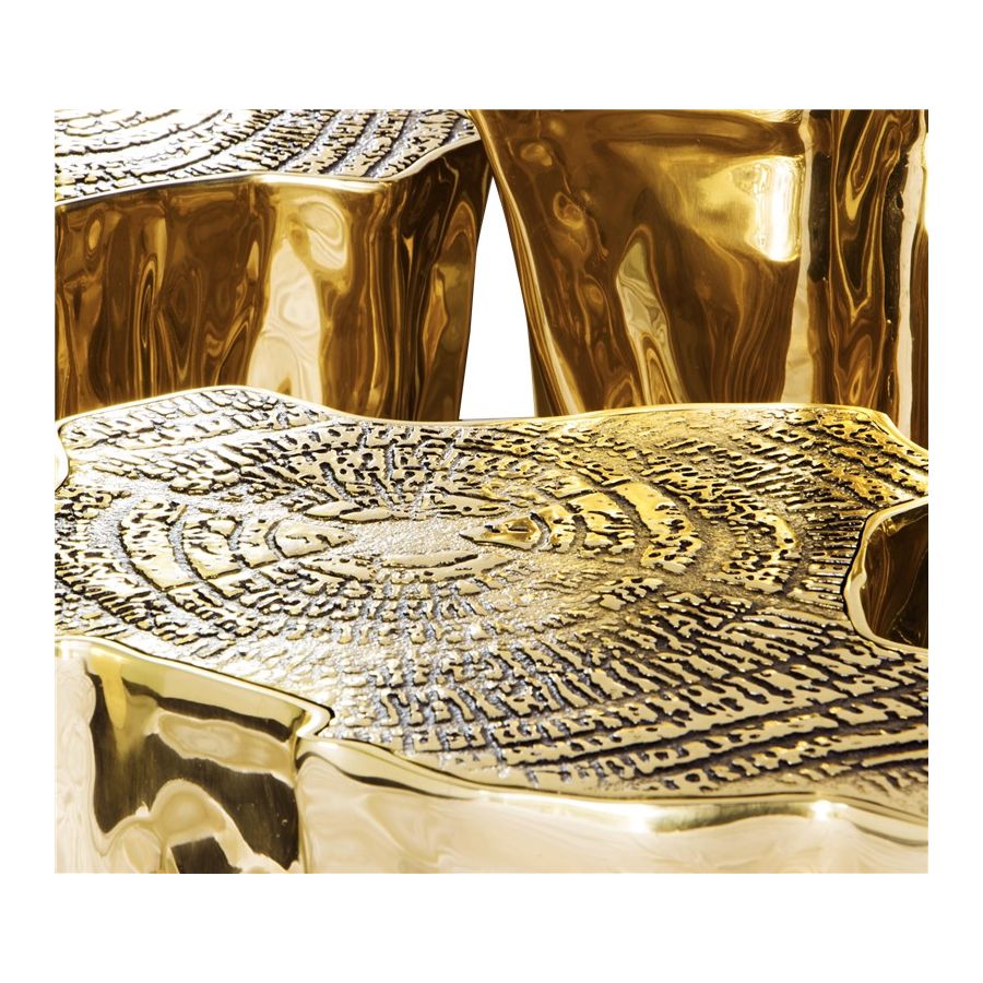 The mystic behind the name inspires Eden. A slice of the tree of life that fell from the Garden of Eden, this accent coffee table set awakens desire and curiosity with its intriguing cut. Born from master artisans and the ancient technique of polished cast brass, these statement design pieces incorporate nature-inspired design with industrious welding techniques, being manually assembled, making each piece unique. With delicate lines and bold details, a manually engraved top exposes the heart of a golden tree, boasting a sinuous gold plated base that stood the test of time. It is available in groups of 7, 8 or 14 pieces, with different heights, for unexpected combinations. The remarkable and already time-honoured piece, Eden coffee table series combine with both contemporary and modern design styles, classy rooms waiting for superior craftsmanship and iconic design.