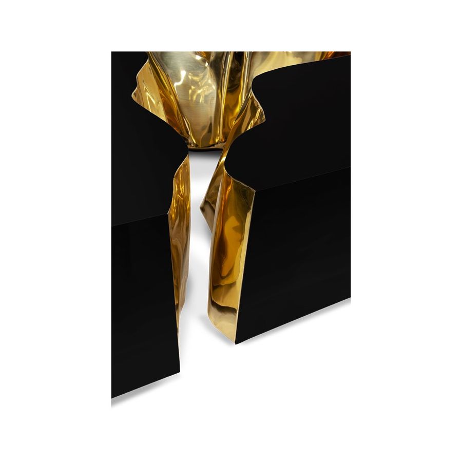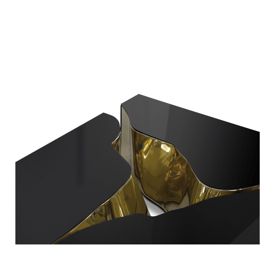 Lapiaz center table takes exceptional craftsmanship and design to a new realm. A functional artwork conceived in three modules for unexpected combinations. Its organic features are achieved through the manual fitting of the polished brass sheet, and a sharp exterior finished in glossy black lacquer. The hammered brass details convey both dynamics and elegance to bring a new contemporary verve into refined interiors. Finding beauty in the most unexpected places, this contemporary coffee table is inspired by authentic karst formations created by surface dissolution, freezing, or thawing of dolomite rocks. Born from cold and freshly cracked to showing off the world rich, golden interior.
