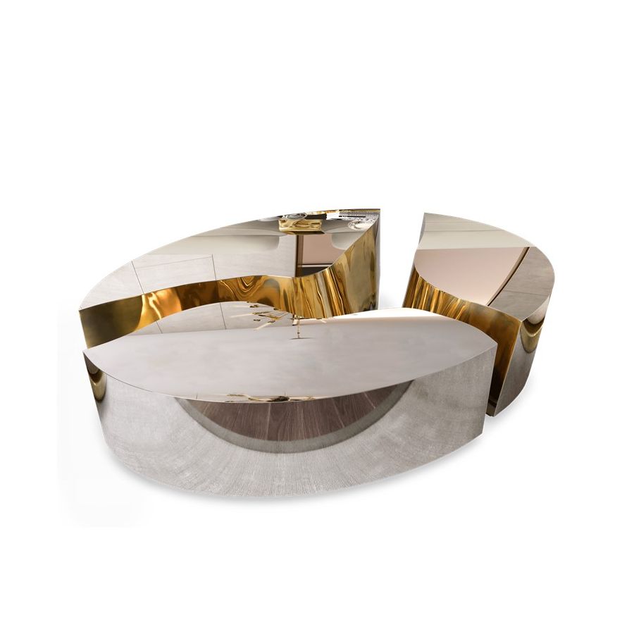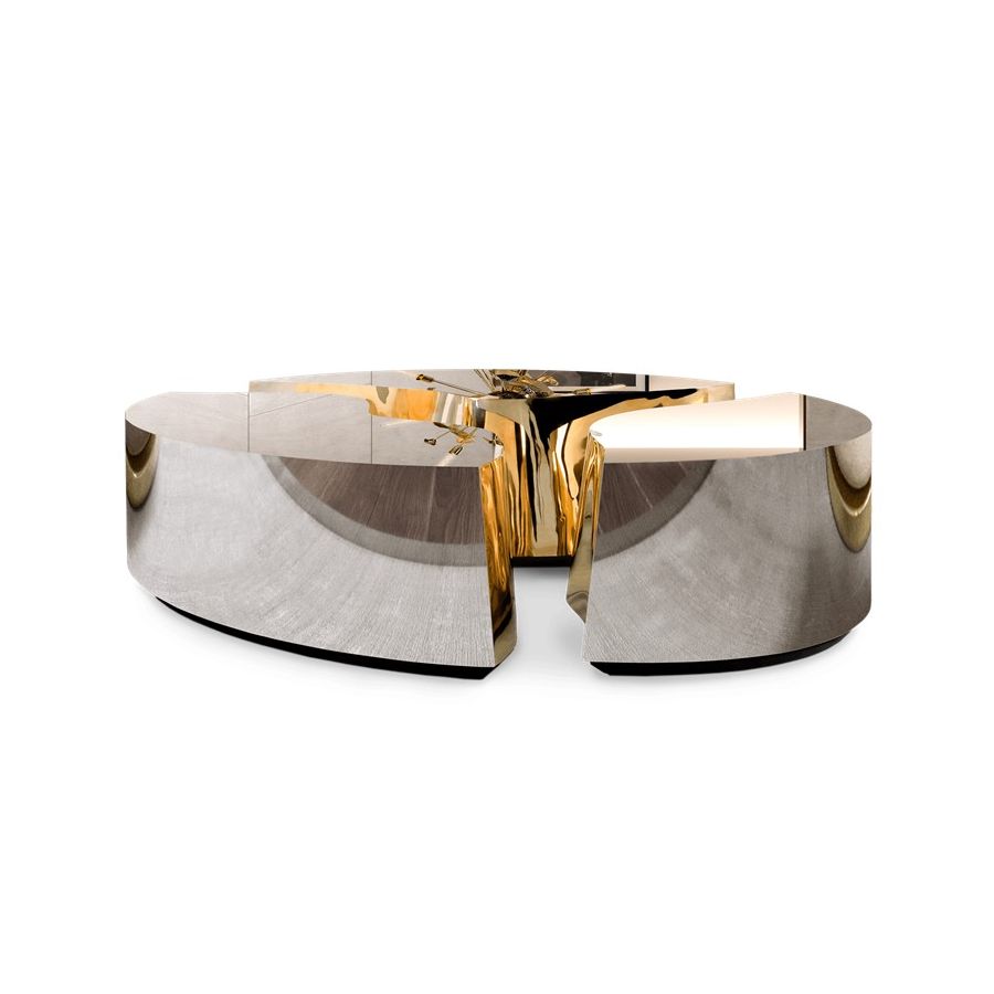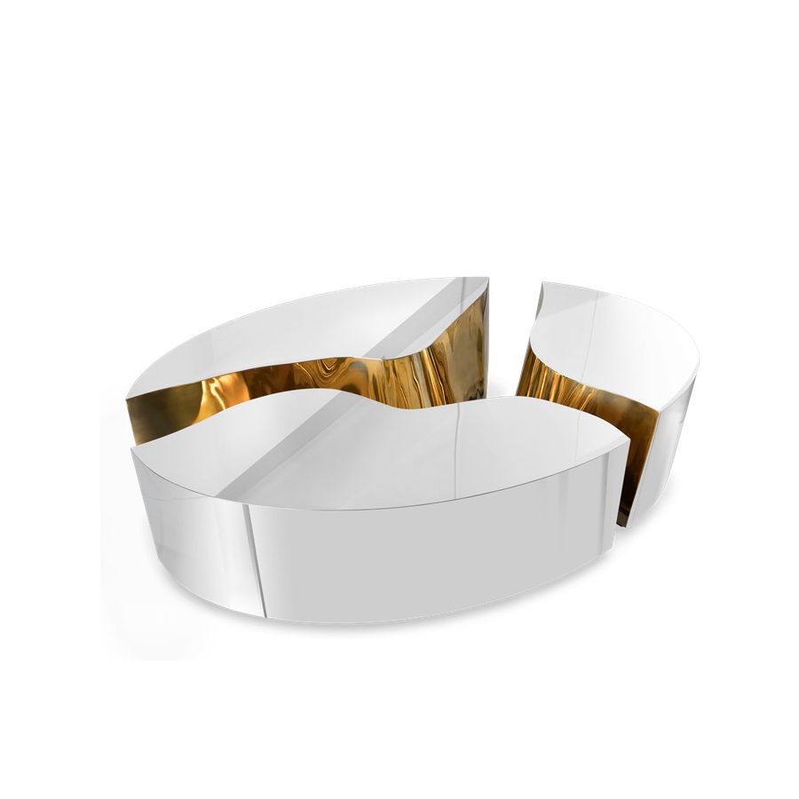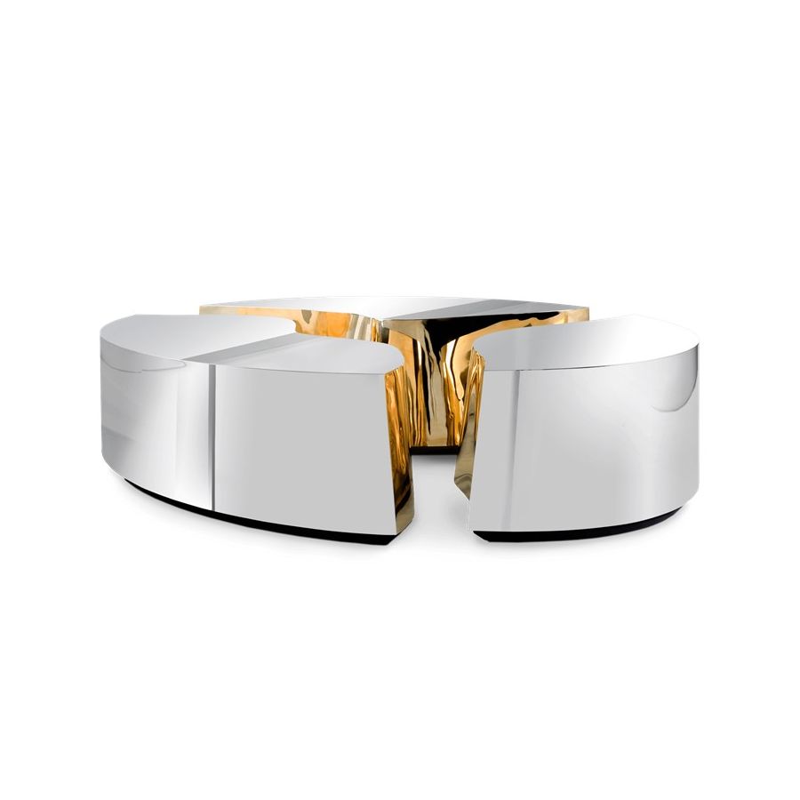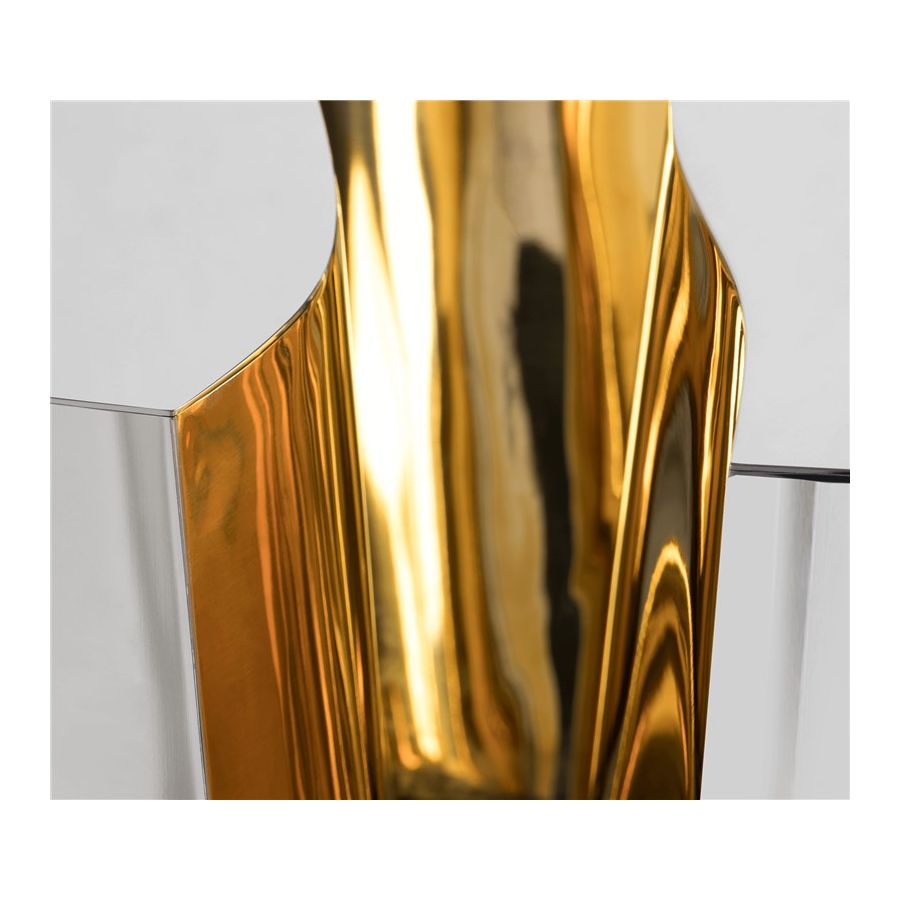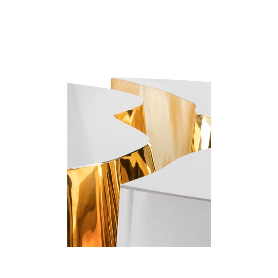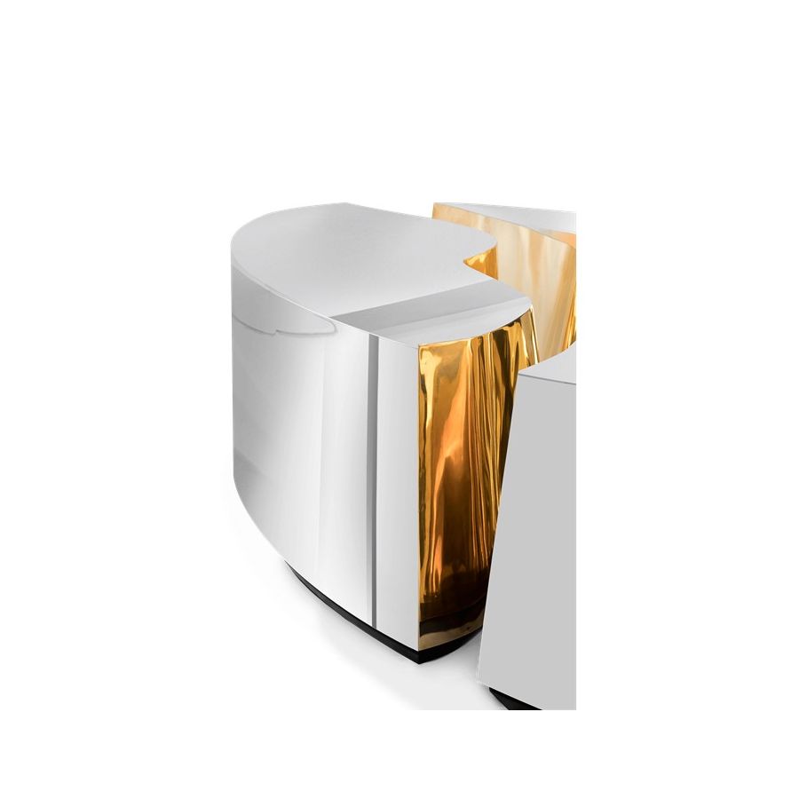 Its organic features are achieved through the manual fitting of the polished brass sheet, and a sharp exterior finished in polished stainless steel that portrays a perfect mirror. The hammered brass details and mirrored sides conveys both dynamics and elegance, a beautiful duality between power and refinement to bring a new contemporary verve into interior design.