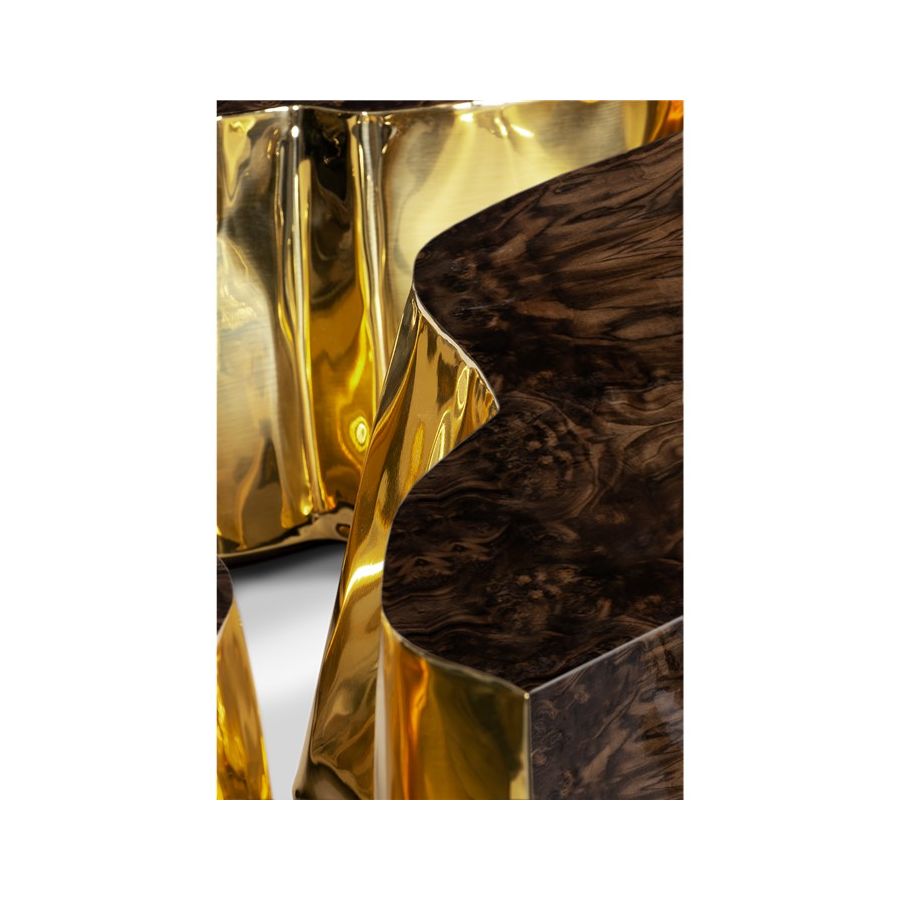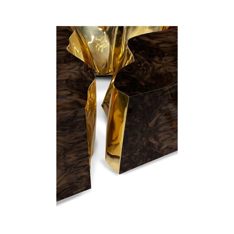 Lapiaz center table takes exceptional craftsmanship and design to a new realm. A functional artwork conceived in three modules for unexpected combinations. Its organic features are achieved through the manual fitting of the polished brass sheet, and finished by a warmth poplar root veneer. The hammered brass details convey both dynamics and elegance to bring a new contemporary verve into refined interiors. Finding beauty in the most unexpected places, this contemporary coffee table is inspired by authentic karst formations created by surface dissolution, freezing, or thawing of dolomite rocks.