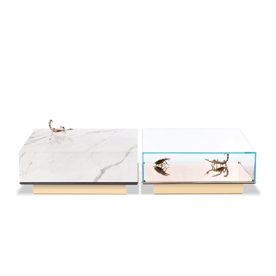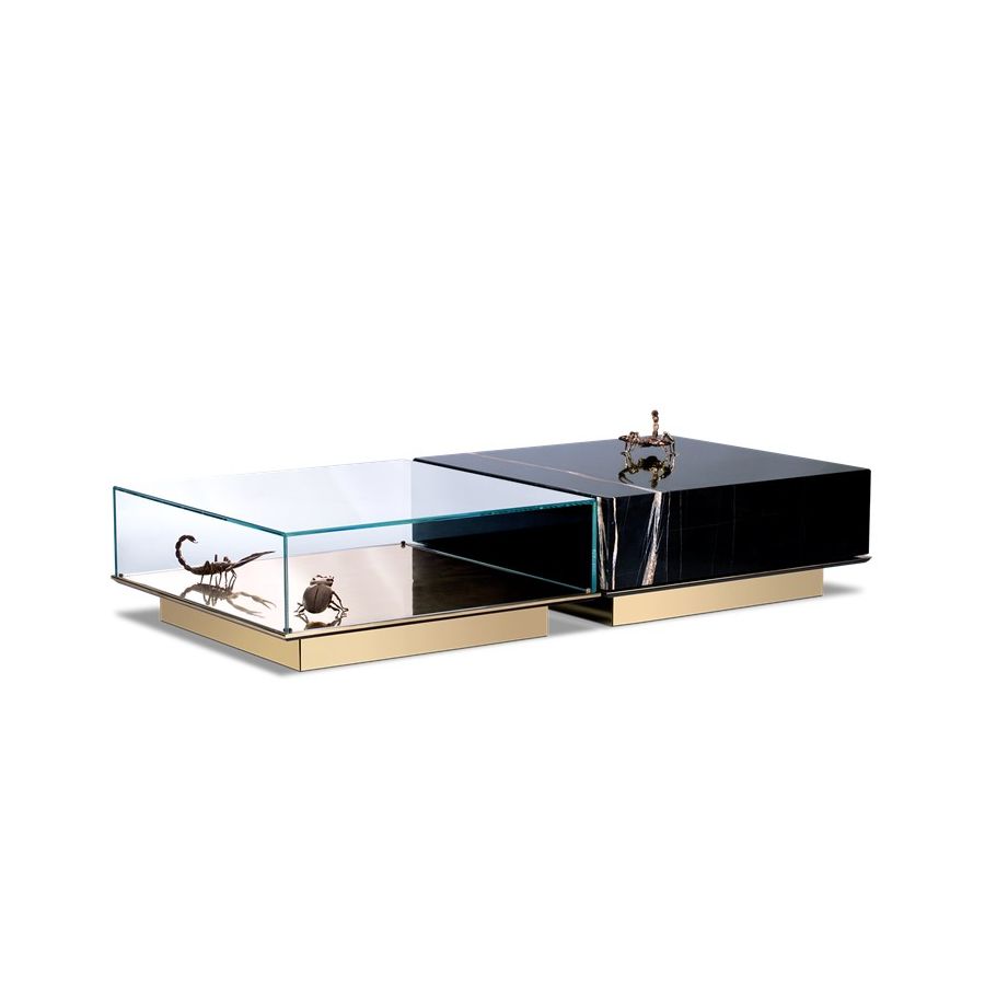 A set of two tables. One module is composed of a glass box which envelopes 3 gold plated elements of 2x scorpion and 1x pollock beatle, laying in a base of gold plated brass. The second module is composed of marble box over wood structure, gold plated base.