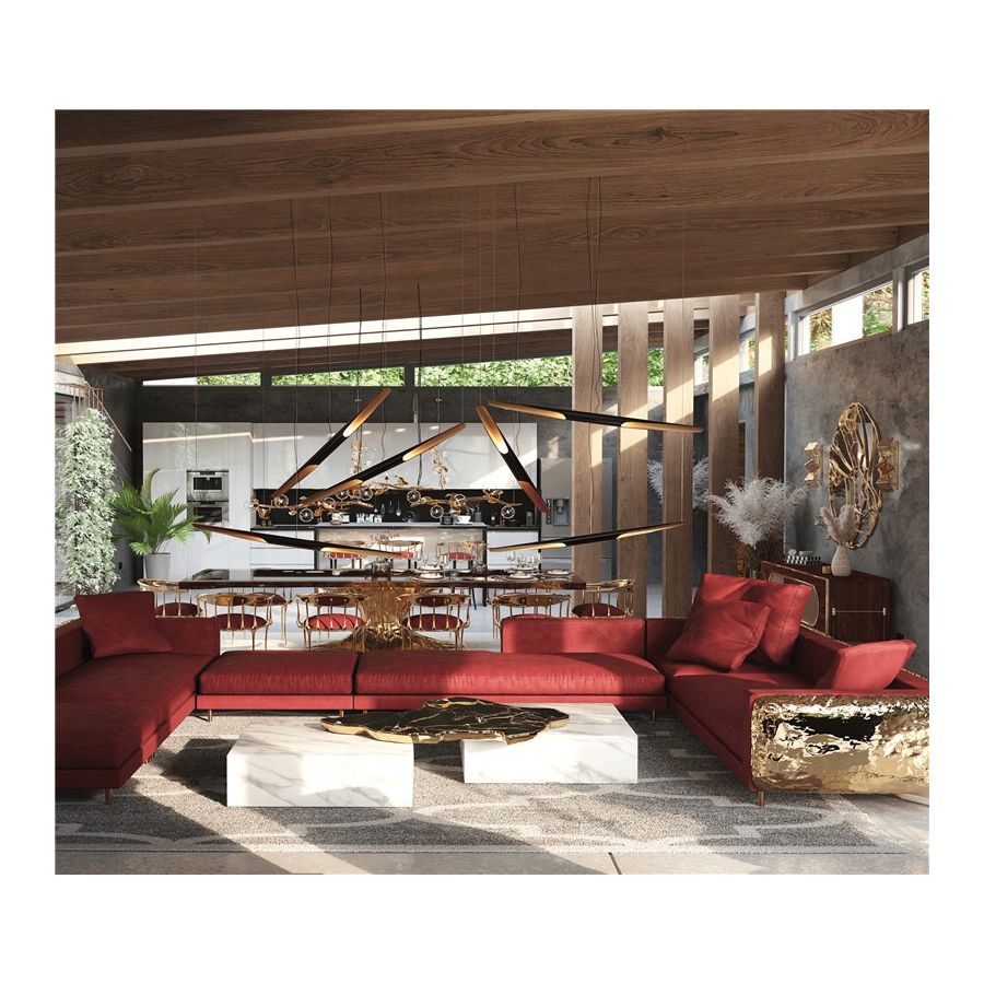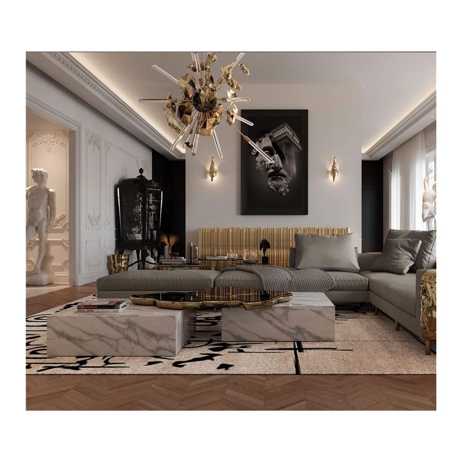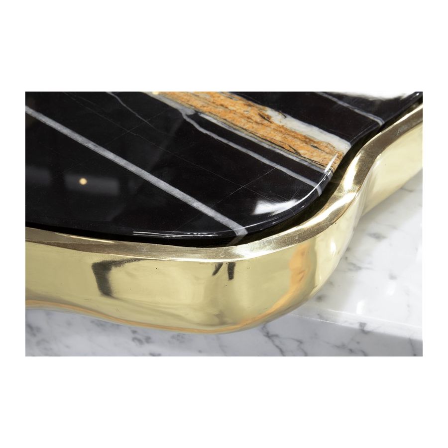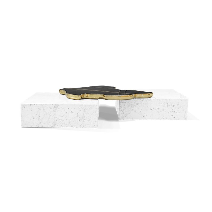 The design of Navarra modern center table captures unique Spanish warmth and finest craftsmanship. The rich colour background set off by thick and thin veins alike carries the eyes to the top of this table, framed by brass. Taking inspiration from its homeland, the Navarra coffee table brings an elegant flair into your home decoration. It is a contemporary center table composed by two square marble modules, linked by an organic marble surface element on top enveloped by casted brass. An exclusive design piece and polished choice for luxury home interiors.
