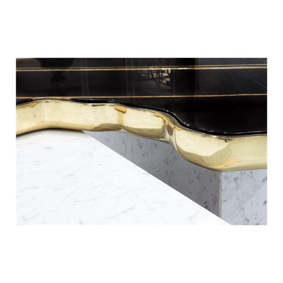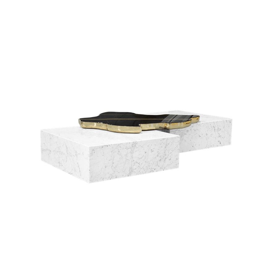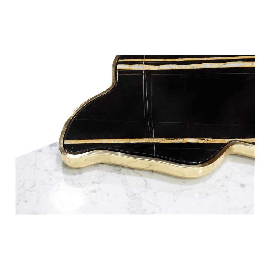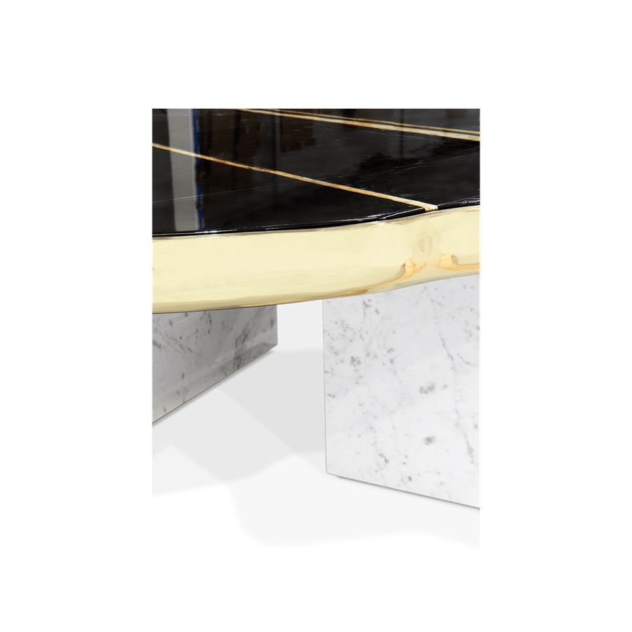 A contemporary center table composed by two square marble modules, linked by an organic marble surface element on top enveloped by casted brass.