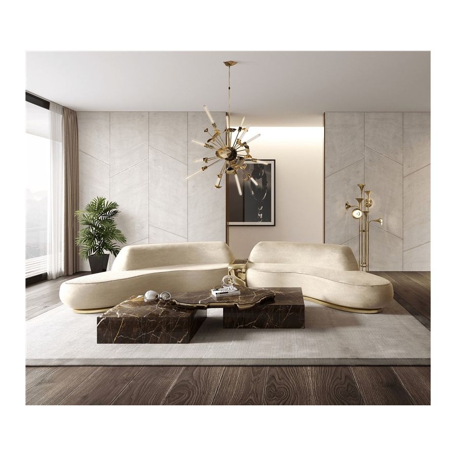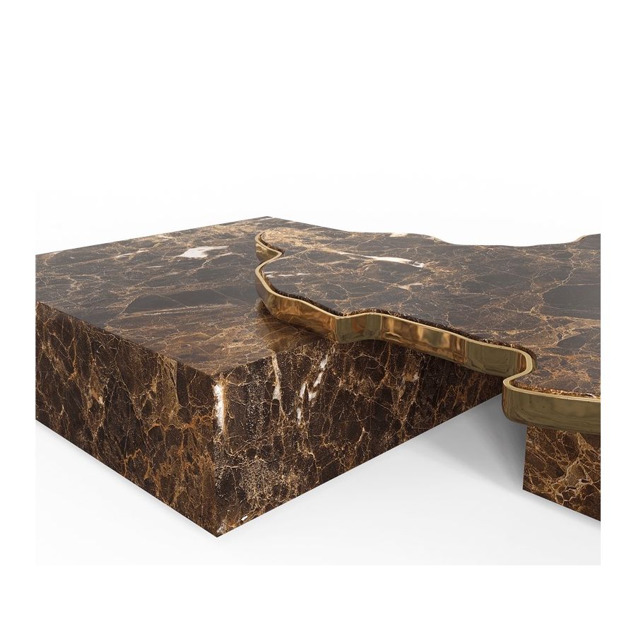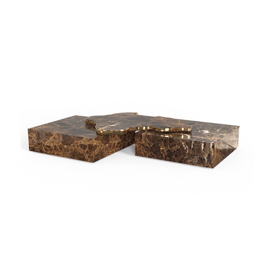 The design of Navarra modern center table captures unique Spanish warmth and finest craftsmanship. The rich colour background set off by thick and thin veins alike carries the eyes to the top of this table, framed by brass. Taking inspiration from its homeland, the Navarra coffee table brings an elegant flair into your home decoration. It is a contemporary center table composed by two square marble modules, linked by an organic marble surface element on top enveloped by casted brass. An exclusive design piece and polished choice for luxury home interiors.