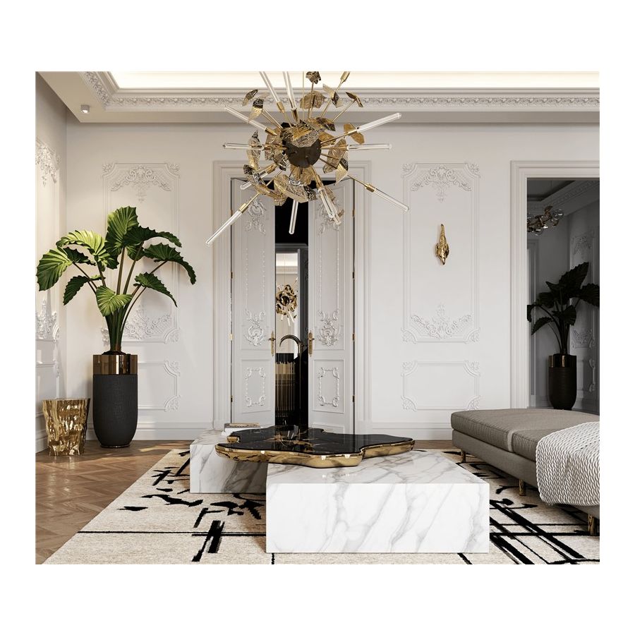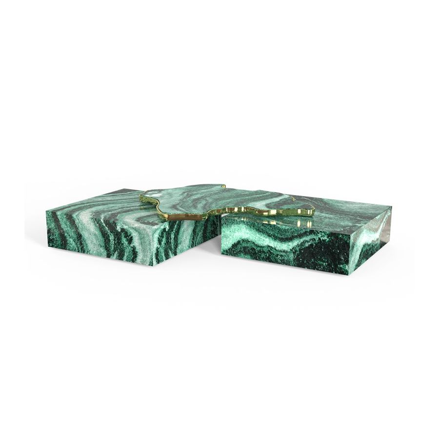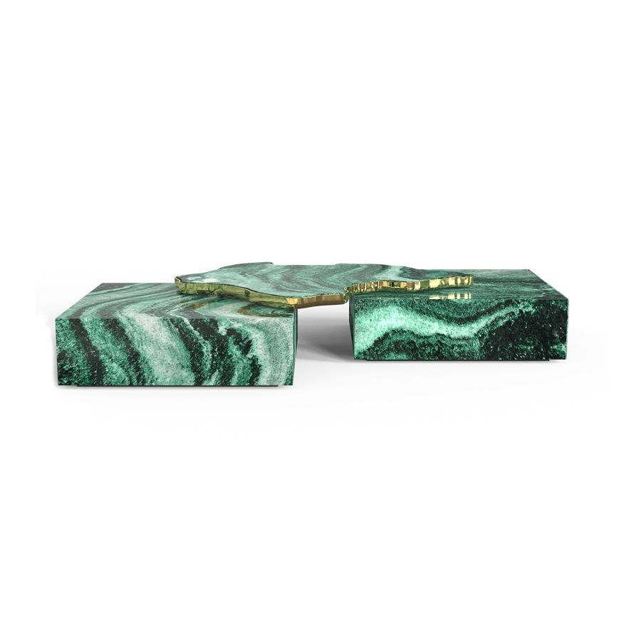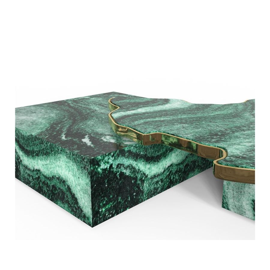 The design of Navarra modern center table captures unique Spanish warmth and finest craftsmanship. The rich colour background set off by thick and thin veins alike carries the eyes to the top of this table, framed by brass. Taking inspiration from its homeland, the Navarra coffee table brings an elegant flair into your home decoration. It is a contemporary center table composed by two square marble modules, linked by an organic marble surface element on top enveloped by casted brass. An exclusive design piece and polished choice for luxury home interiors.