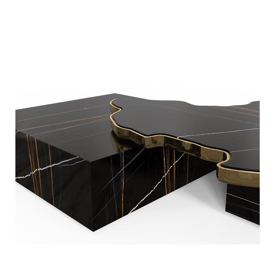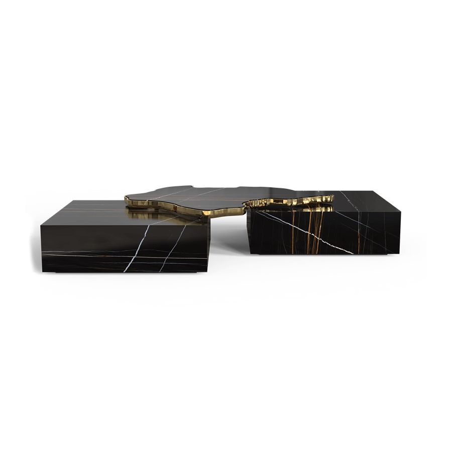 The design of Navarra modern center table captures unique Spanish warmth and finest craftsmanship. The rich colour background set off by thick and thin veins alike carries the eyes to the top of this table, framed by brass. Taking inspiration from its homeland, the Navarra coffee table brings an elegant flair into your home decoration. It is a contemporary center table composed by two square marble modules, linked by an organic marble surface element on top enveloped by casted brass. An exclusive design piece and polished choice for luxury home interiors.