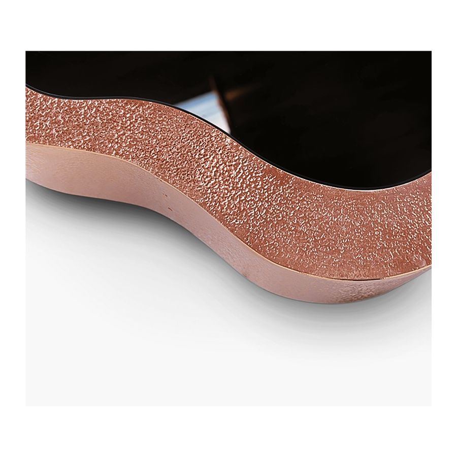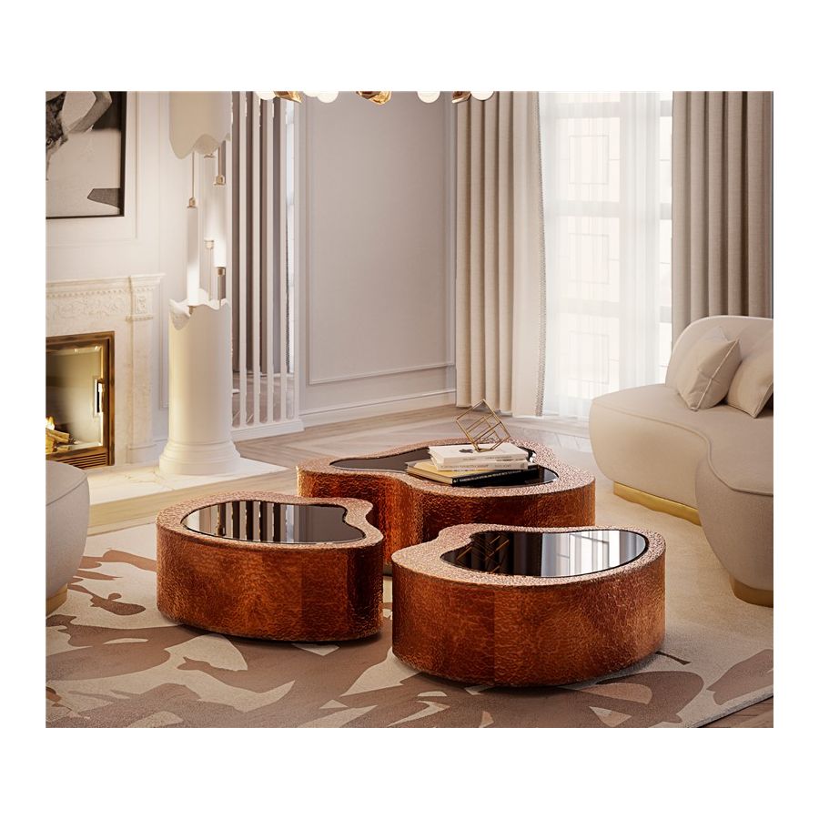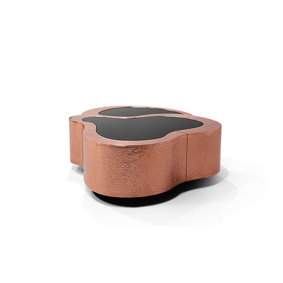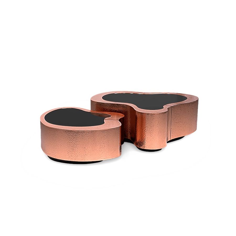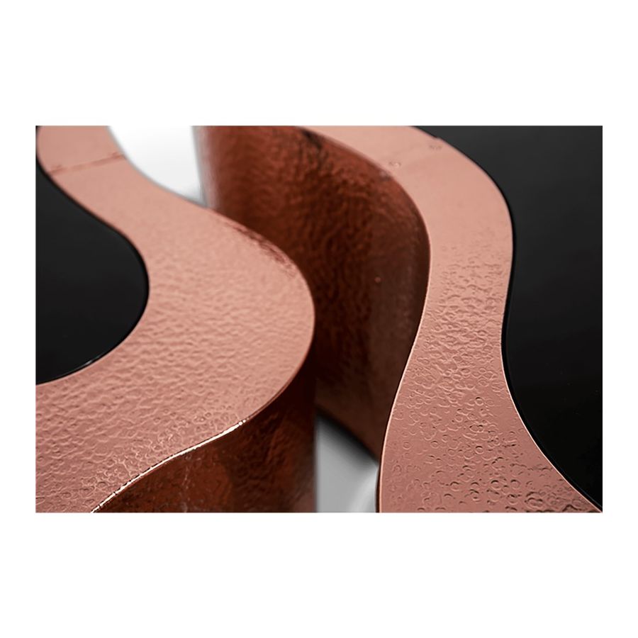 The Wave Center Table is a statement piece that draws inspiration from coastal rock formations the waves have sculpted, curving their rough shapes through thousands of years of a timed collision. Made in wood and coated in either manually hammered copper or brass, this contemporary coffee table incorporates industrious metalworking techniques that test the skill of our artisans, while the top joins a black mirror shell that emulates the accumulation of water. A black lacquered base is finished with a high gloss varnish. An elegant center table that brings a timeless touch to the most sophisticated rooms. Wave is available as a set of two tables with different shapes that suit modern sitting and living rooms alike.
