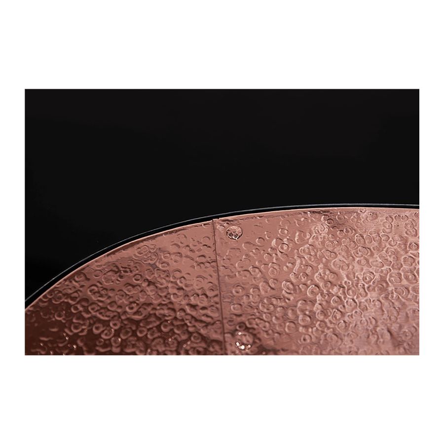 Table made in wood finished with manually hammered copper, with a curvilinear top made from black mirror. The base is lacquered in black finished with a high gloss varnish.