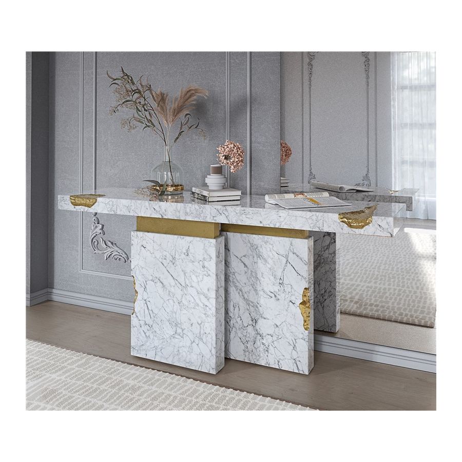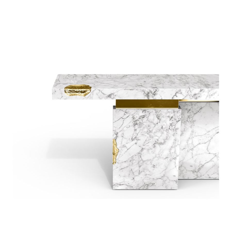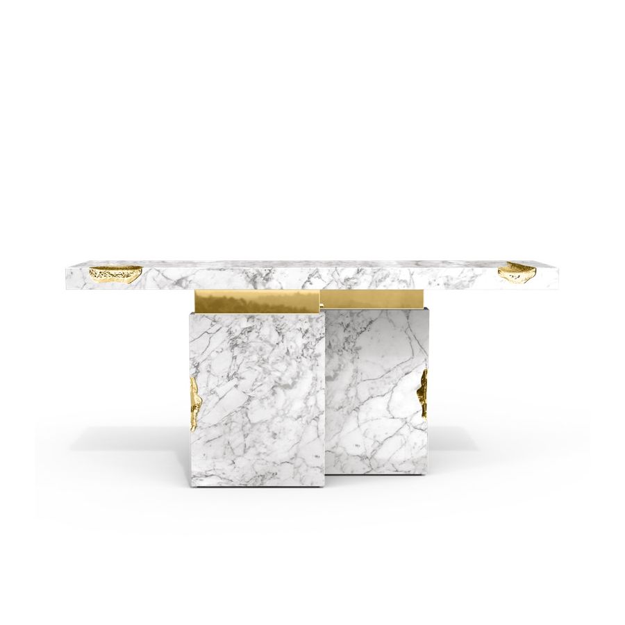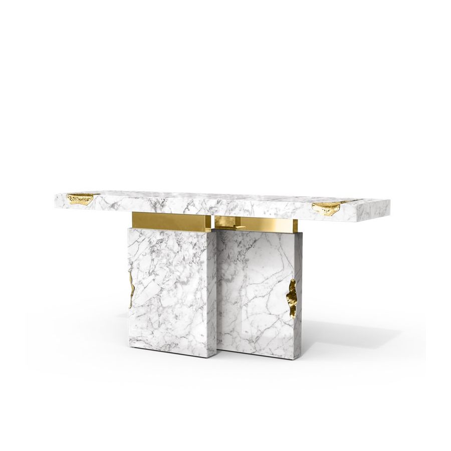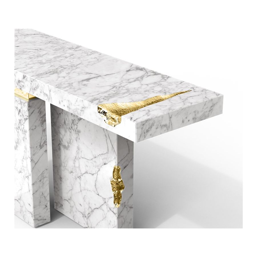 The Empire is a sublime console built in marble with polished brass details. Its cracks are hand-carved and inserted through polished brass sheets, which are hand-hammered for a unique finish. Designed to make an impression, this unique console is a unique masterpiece that will fit perfectly in exclusive entryways or hallways and empowering spaces. A refined statement piece made for those with refined minds and taste.