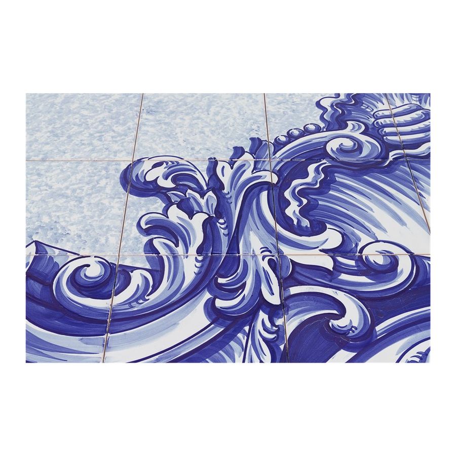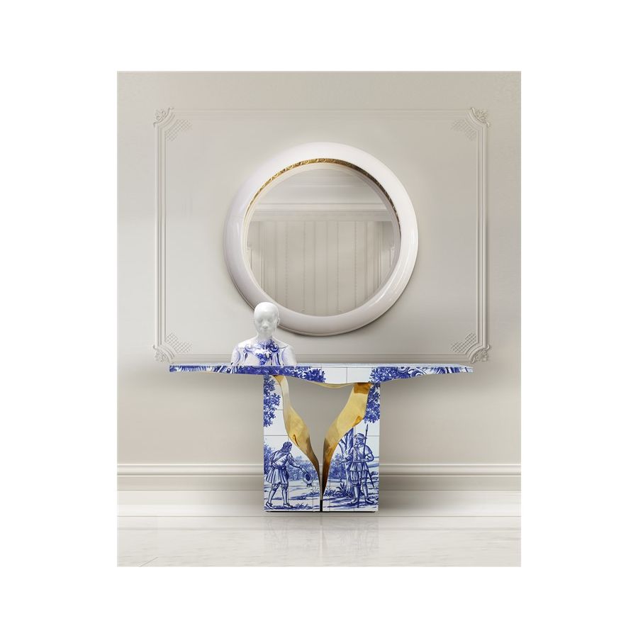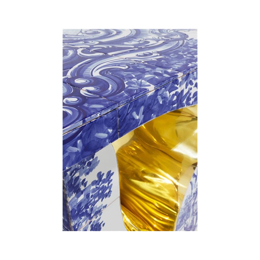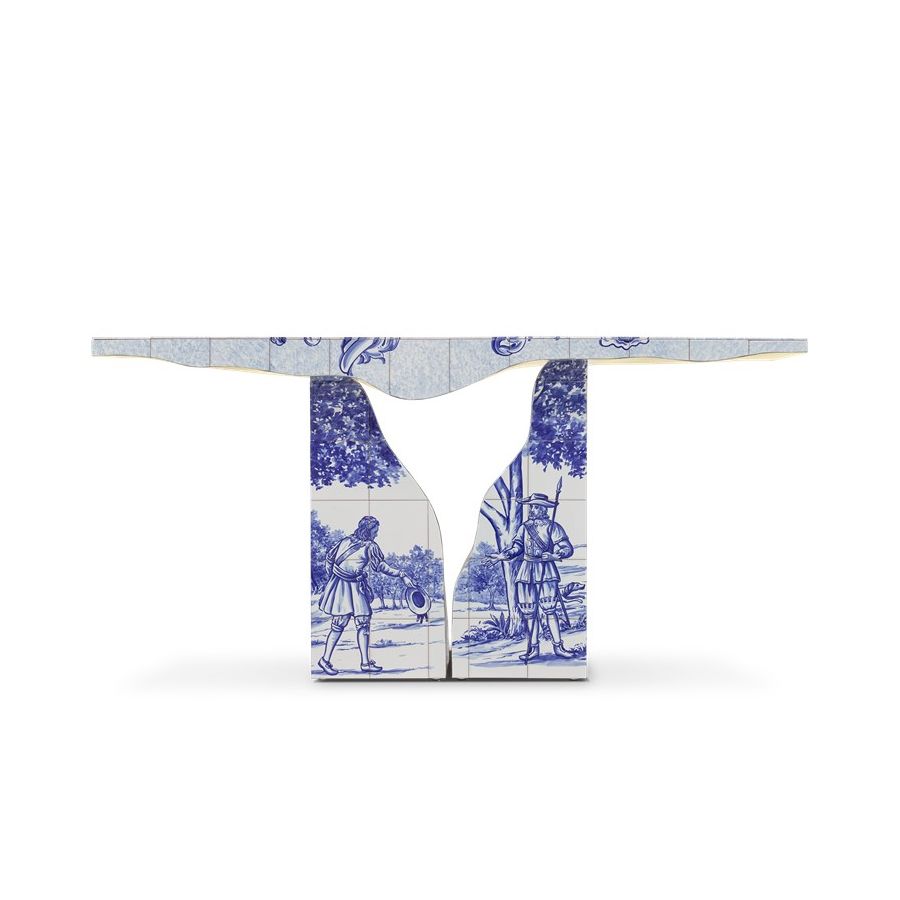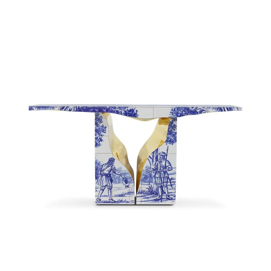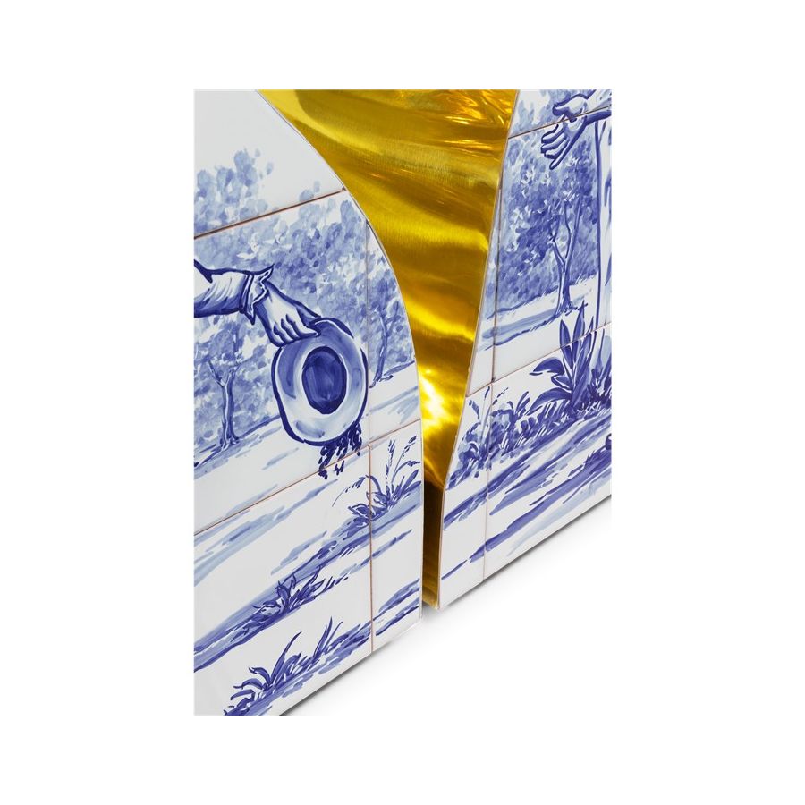 Lapiaz console takes exceptional craftsmanship and design to a new realm. This contemporary console is masterfully covered by white and blue Azulejos, the traditional hand painted tiles, one of the most representative art forms of Portuguese culture. Its organic feature is achieved through the manual fitting of the polished brass sheet, freshly cracked to show a rich golden interior. Finding beauty in the most unexpected places, this elegant console is inspired by authentic karst formations, a true masterpiece to bring a new contemporary verve into interior design.