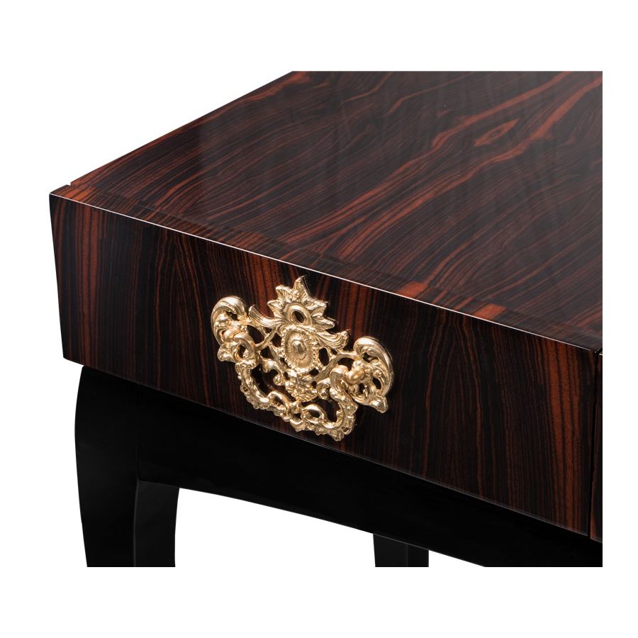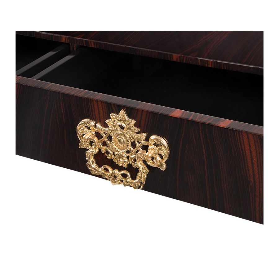 Mahogany Wood, Gold, Silver or Copper leaf, Polished Brass, Black Glass.