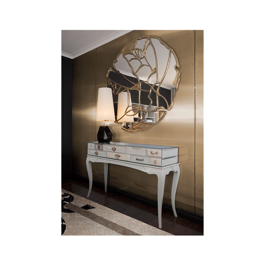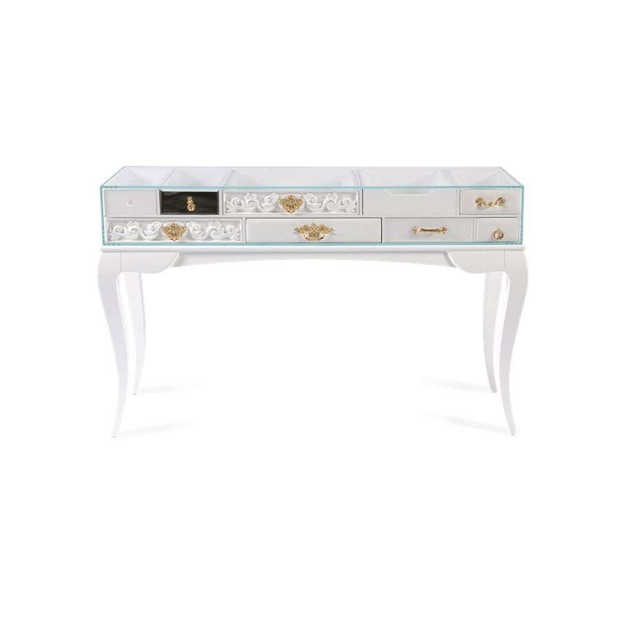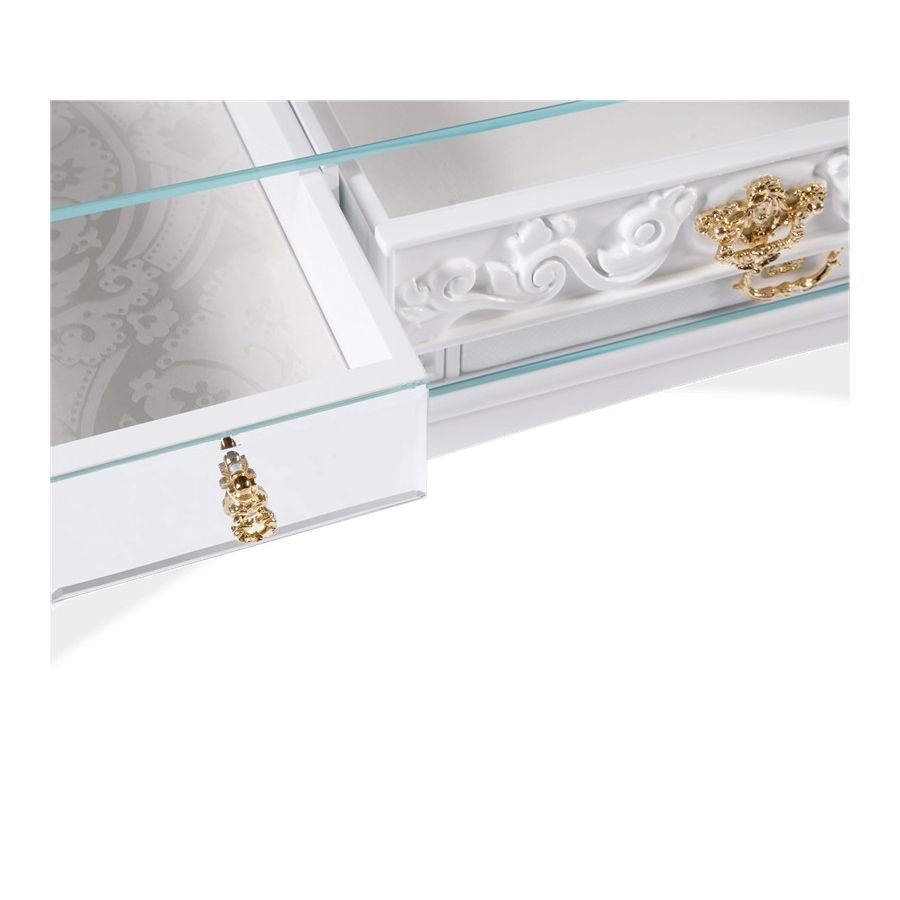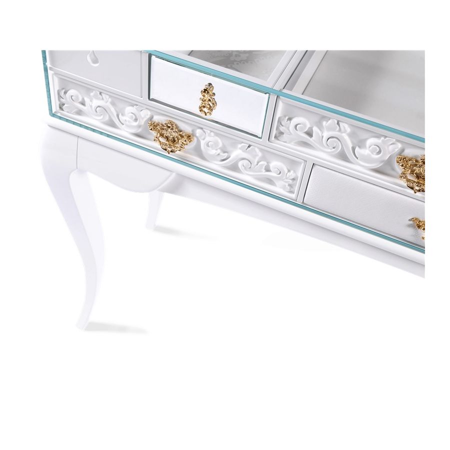 The base is composed by mahogany. The box is made by tempered glass with a frontal opening for the drawers. The structure is made in wood lacquered in white with a matt varnish; the drawers are handcrafted and contain wadding and a grey mirror. Handles are made through foundry process.