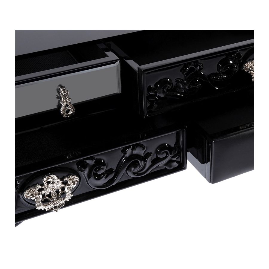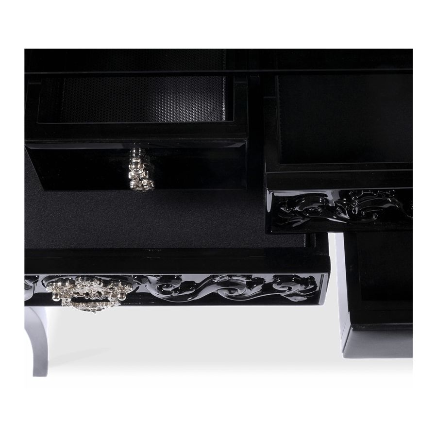 Mahogany Wood lacquered in black with a high gloss varnish, Grey Glass, Silver Plated Brass, Grey Mirror in Bevelling, Drawers: High gloss black lacquer and leather, glass lacquered in black, lacquered woodwork.