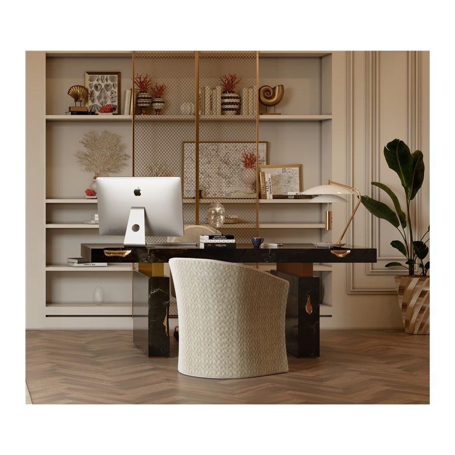 An elegant writing desk built in marble with polished brass details. Its cracks are hand-carved and inserted through polished brass sheets, which are hand-hammered for a unique finish.