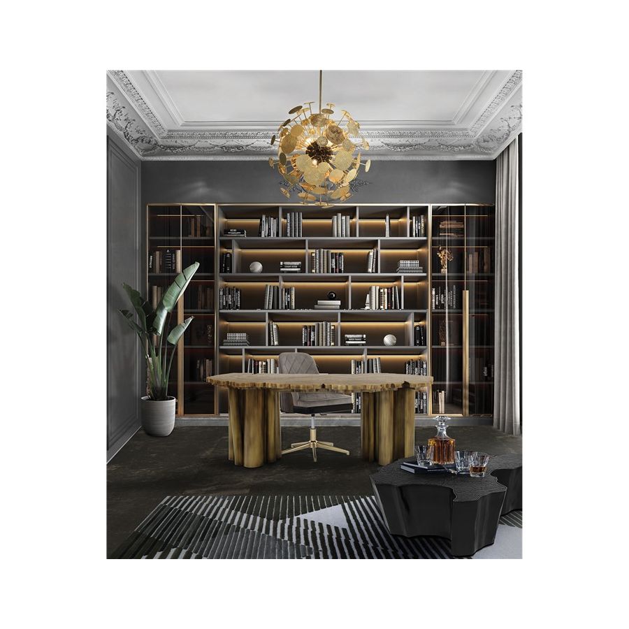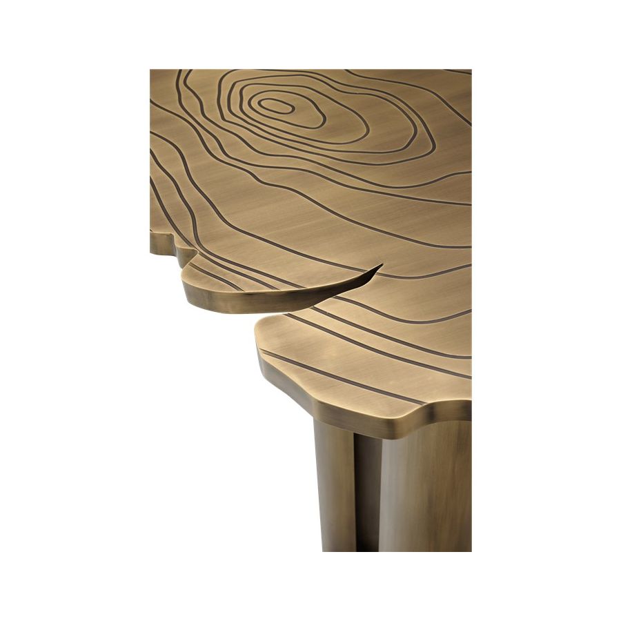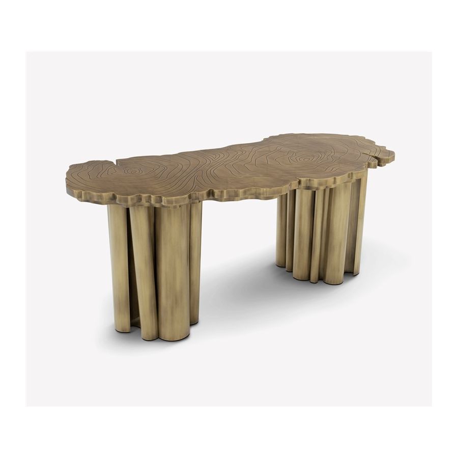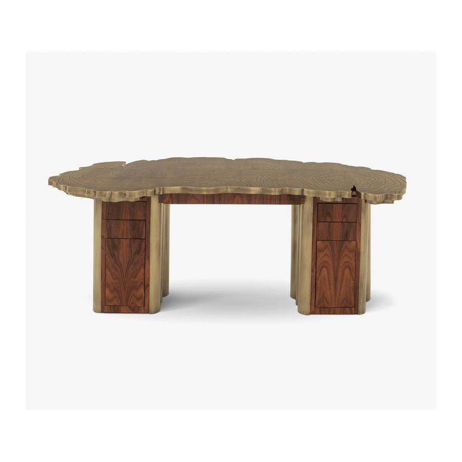 Fortuna is a contemporary office desk with a unique design aesthetic and refined statement to the most influential minds. This modern desk incorporates nature-inspired design, industrious welding techniques and a manually engraved top that emulates the outlines of log rings, reminding the timeline of a tree. Below the large desktop is an elegant composition of two scaled brass tubes, each one holding two drawers and one door covered by a sleek veneer, and a central drawer for files in between. Fortuna is a unique writing desk that embodies the fearless state mind of Boca do Lobo and the availability to customize the features to accommodate the most demanding client’s requirements.