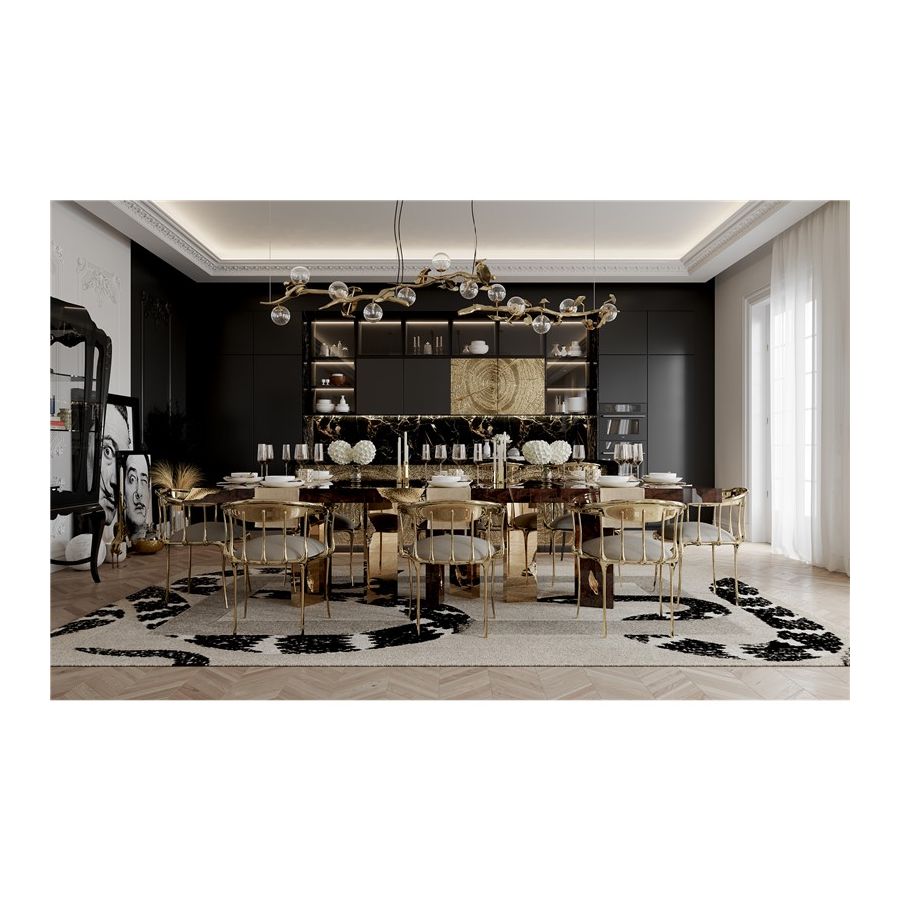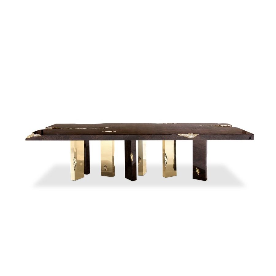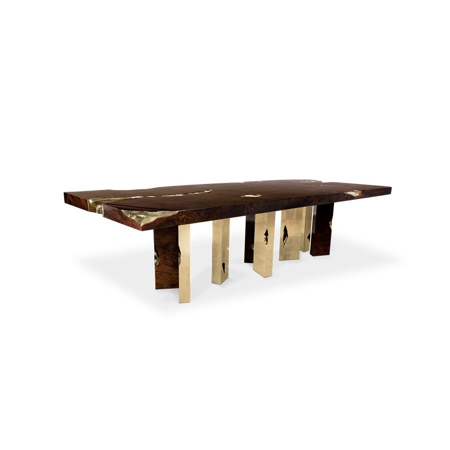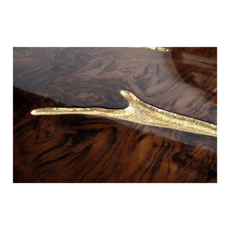The Empire dining table’s surface is made in mahogany, coated in a fine wood veneer, with high polished brass details to fill the cracks. Its legs, also made from mahogany are finished the same way, and with polished brass sheets.