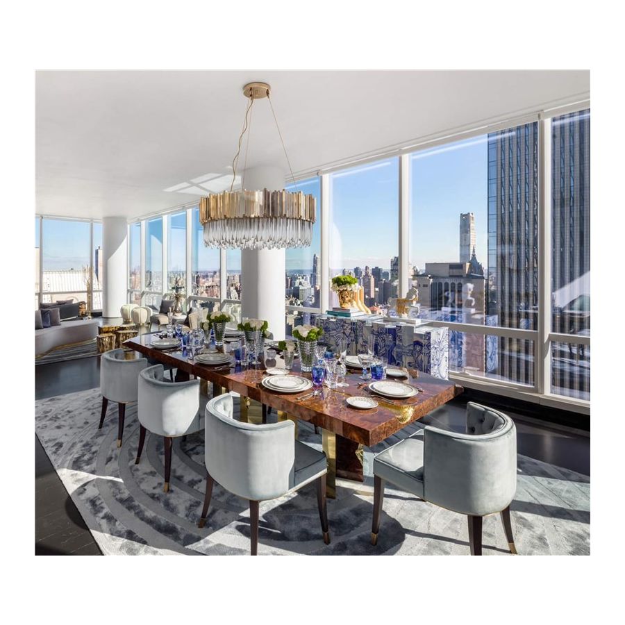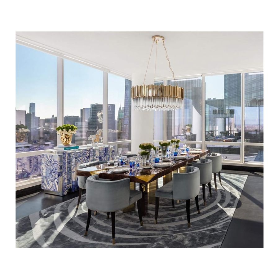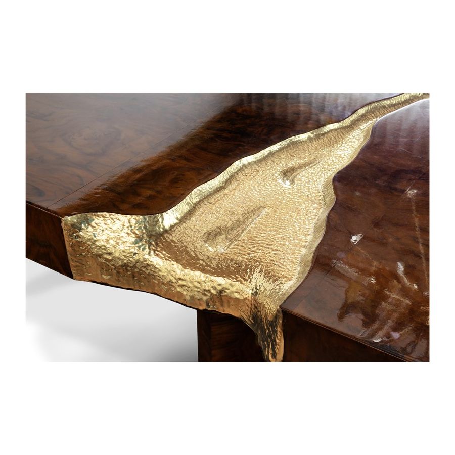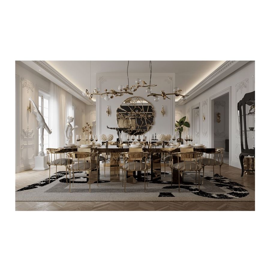 The Empire dining table’s surface is made in mahogany, coated in a fine wood veneer, with high polished brass details to fill the cracks. Its legs, also made from mahogany are finished the same way, and with polished brass sheets.
