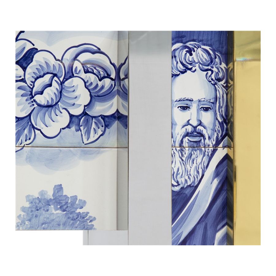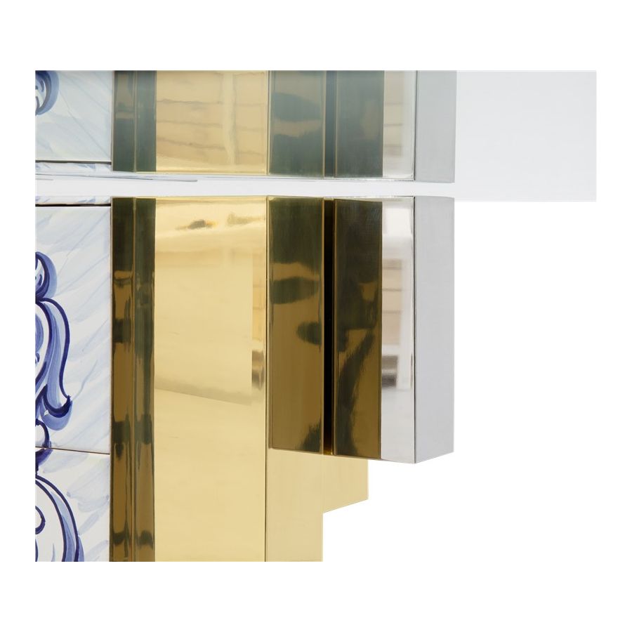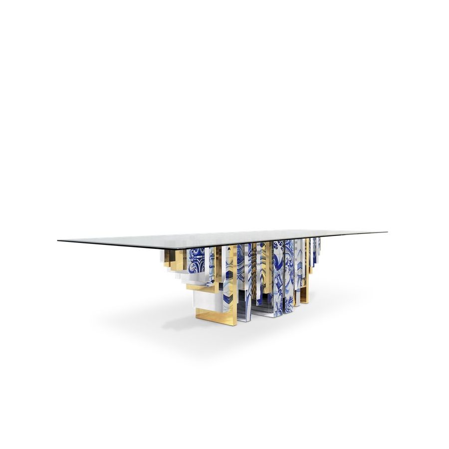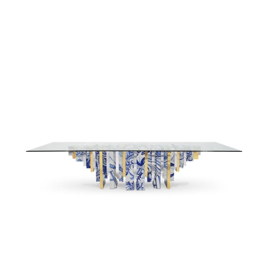 The Heritage Dining Table, much like its sibling Heritage Sideboard and Cabinet, is a highly sophisticated piece inspired by Portuguese history through the use of traditional hand painted azulejo tiles. Its noble design features bold lines, with alternating polished brass, bevelled mirror and azulejo strips and a tempered glass top, which reflect your dining room’s finest elements, yet adding a touch of warmth and finesse.
