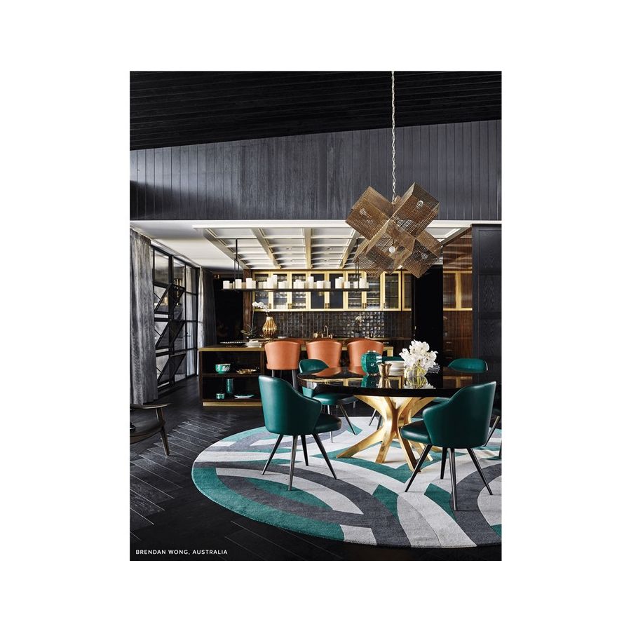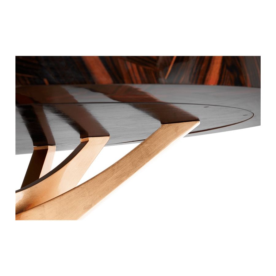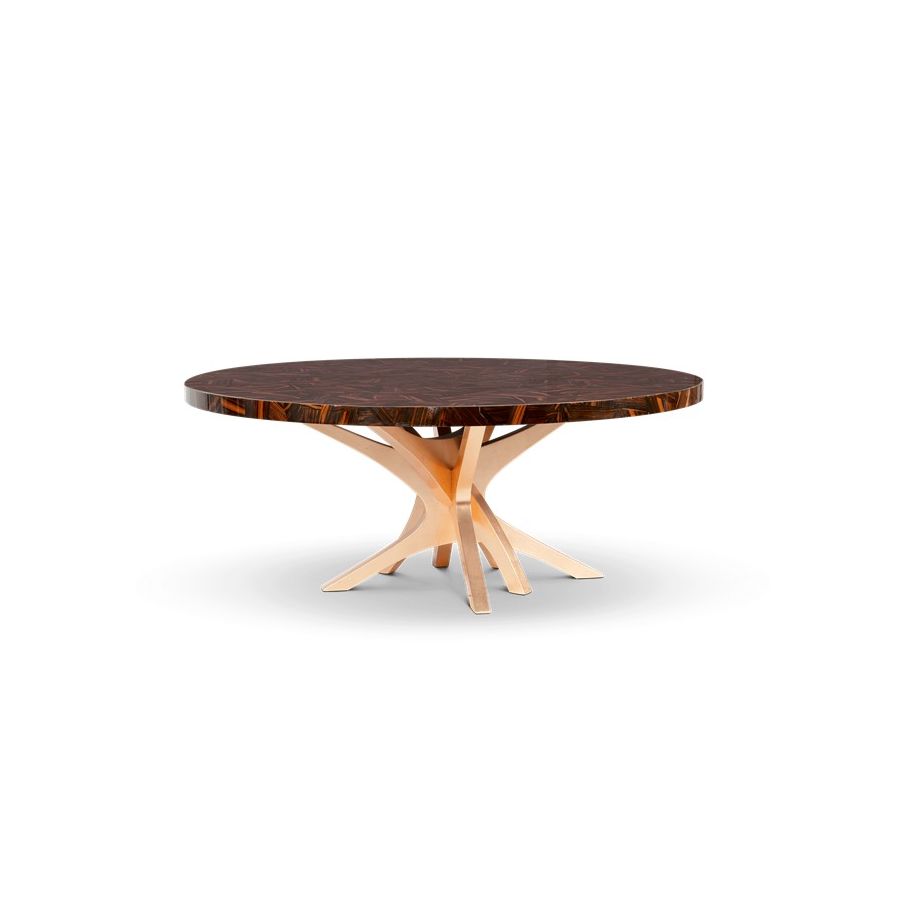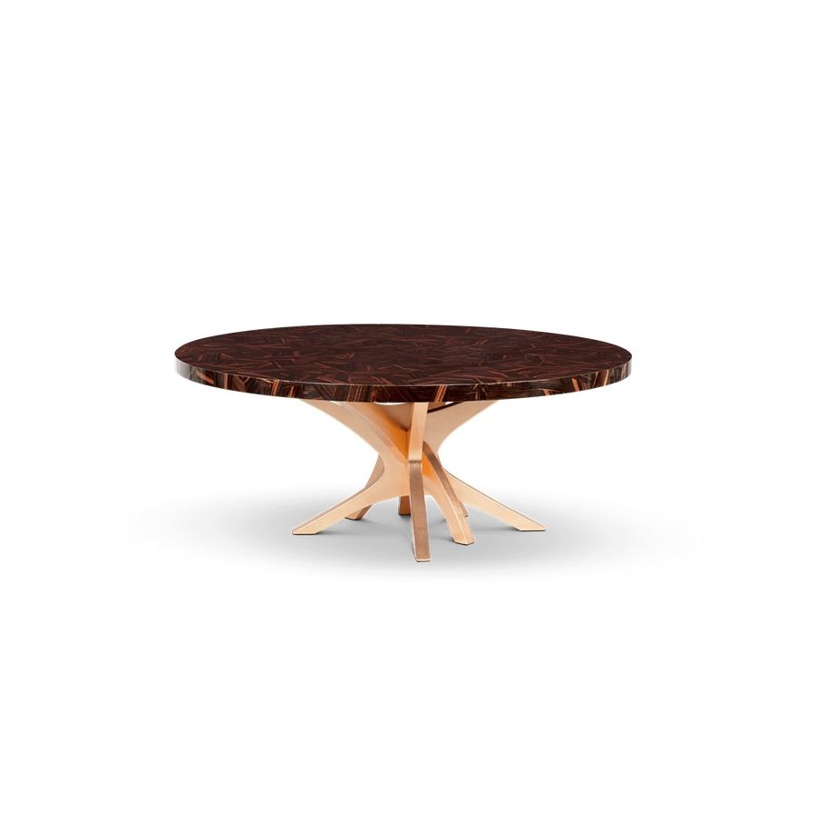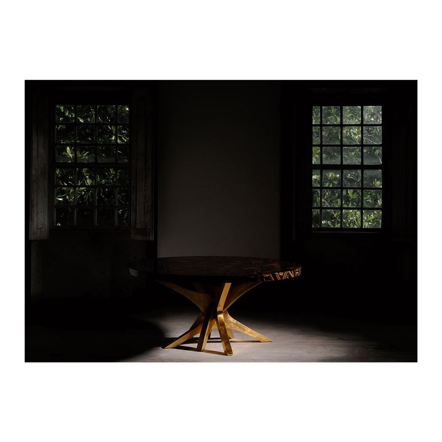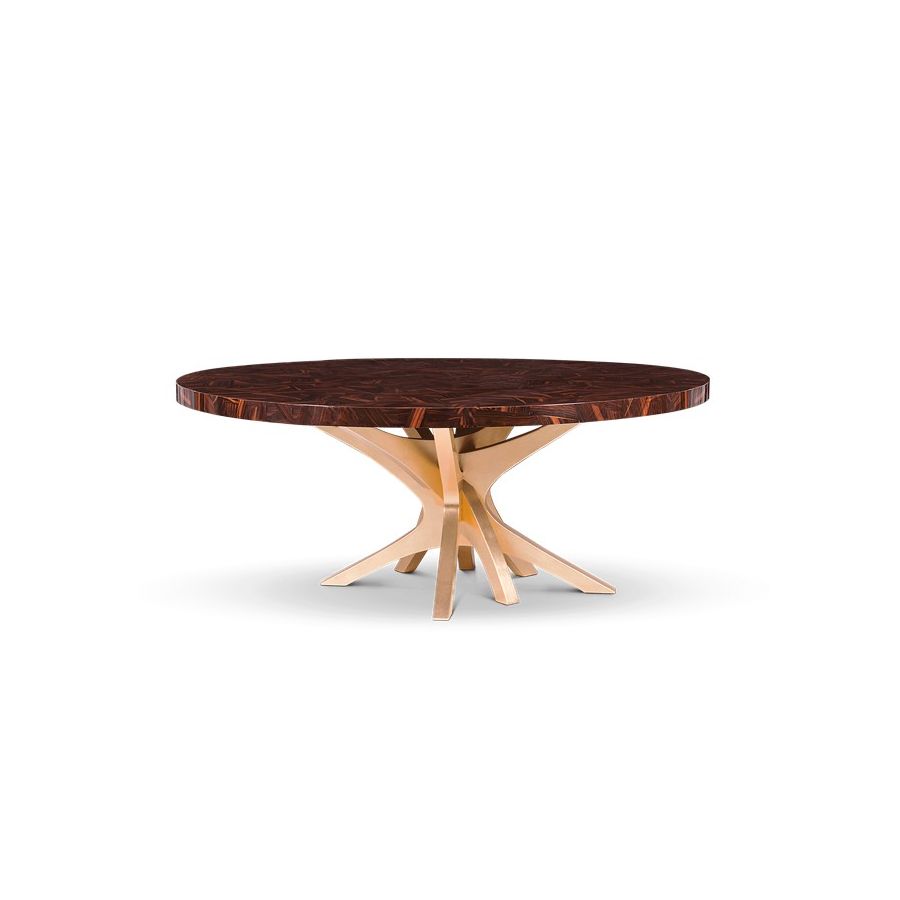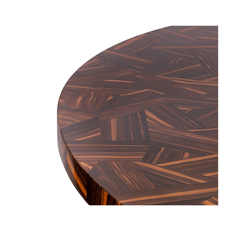 Boca do Lobo’s exclusive Patch Table has intricate wood veneer top and sculptural base for adding sophistication to any kind of home setting. Patch table fits on a contemporary living room or on a sophisticated kitchen. The top of this dining table is covered with an intriguing geometric mosaic of wood veneer and the base is made from oak. This round center table is then finished in high gloss varnish. It is 76 cm high and 160 long, perfectly crafted with the uniquely legged bottom matching any kind of home or flooring aesthetics.