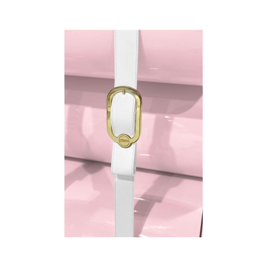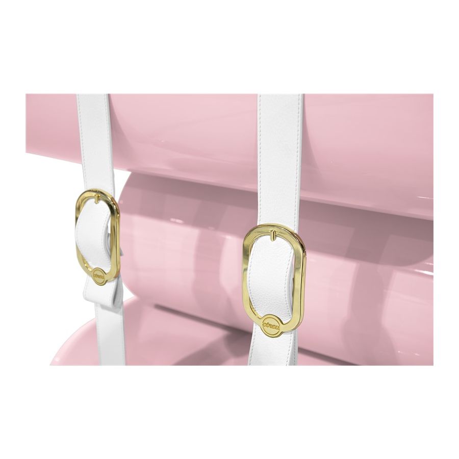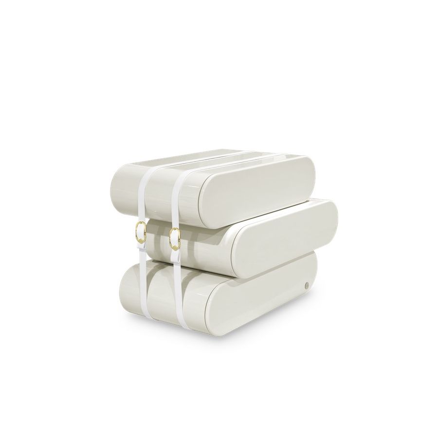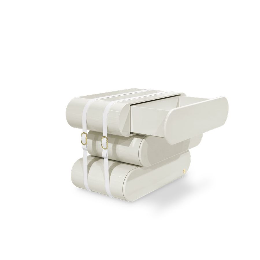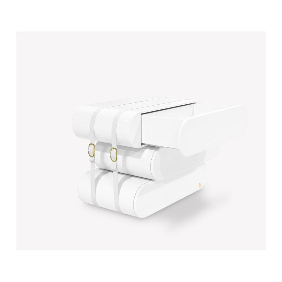 Built-in wood, lacquered in glossy white, with details in synthetic leather and gold plated finishes.