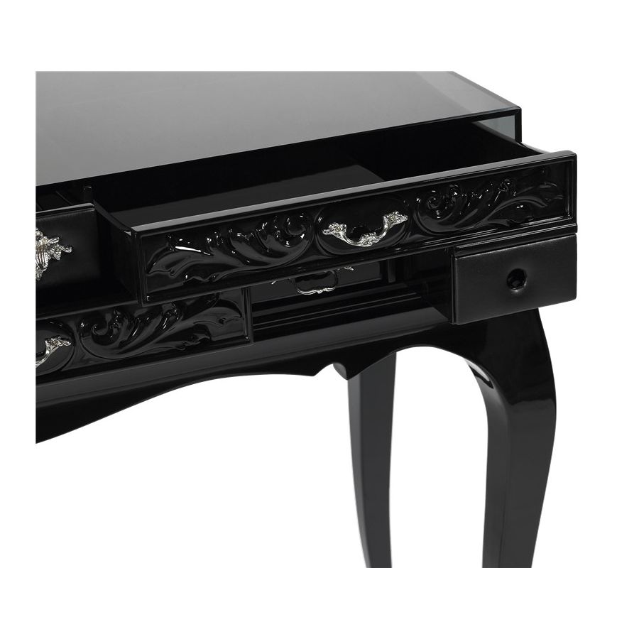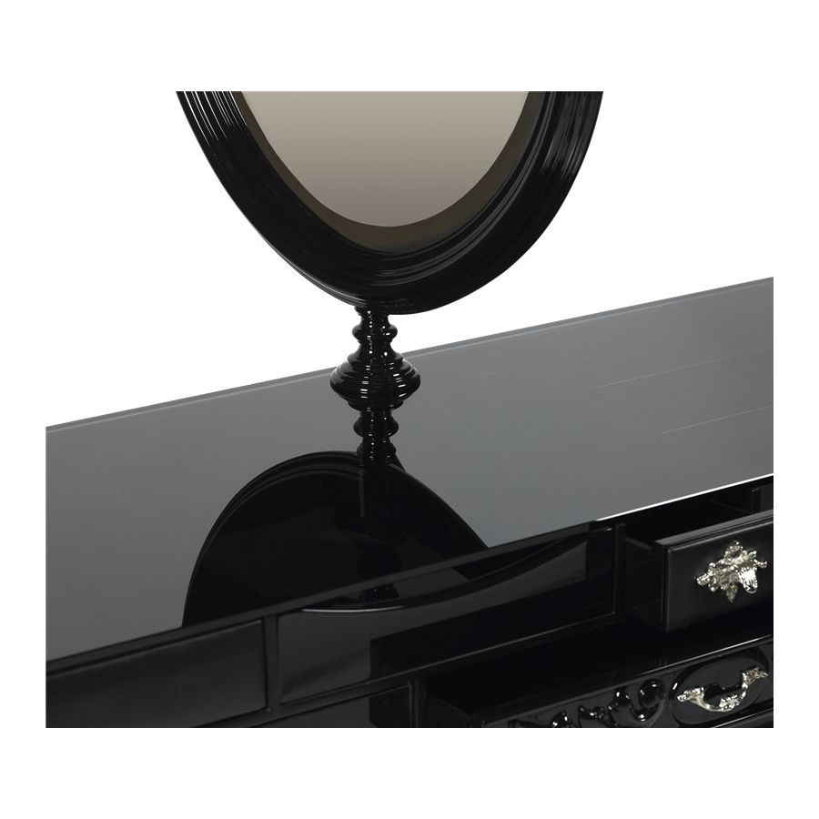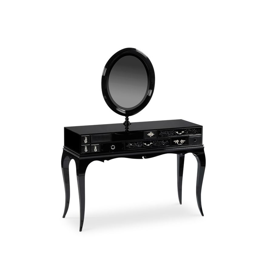 The base is composed by mahogany. The box is made by tempered glass with a frontal opening for the drawers. The structure is made in wood lacquered in black with a high gloss varnish; the drawers are handcrafted and contain wadding and a grey mirror. Handles are made through foundry process. Melrose’s top contains a hole to set an oval mirror that lets you adjust the viewing angle while rotating around a vertical axis, allowing a rotation of 360º.