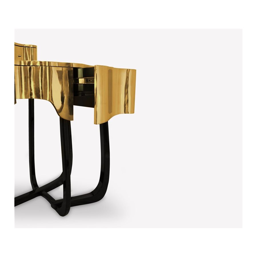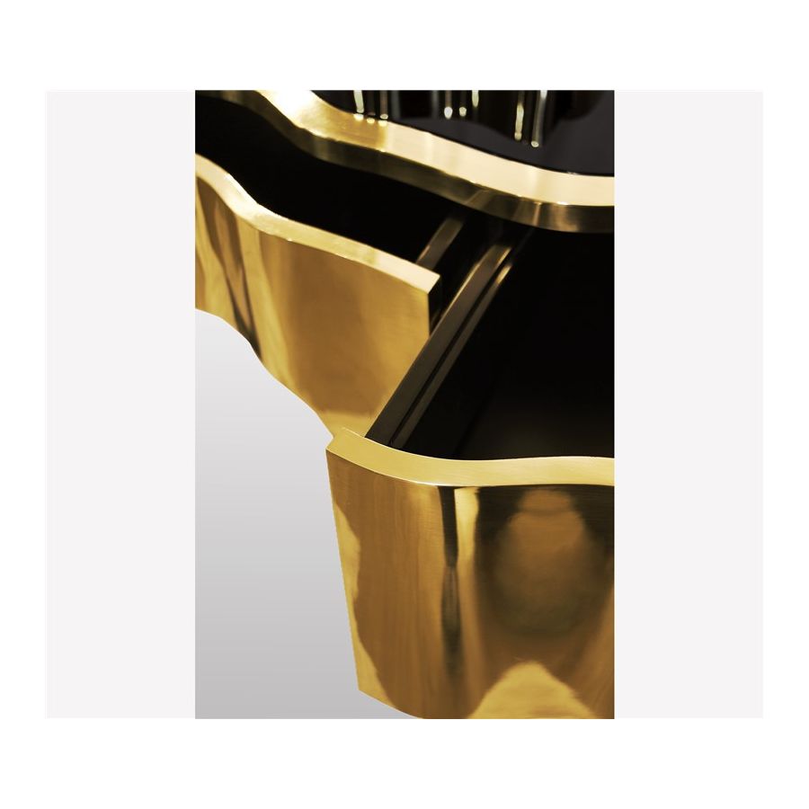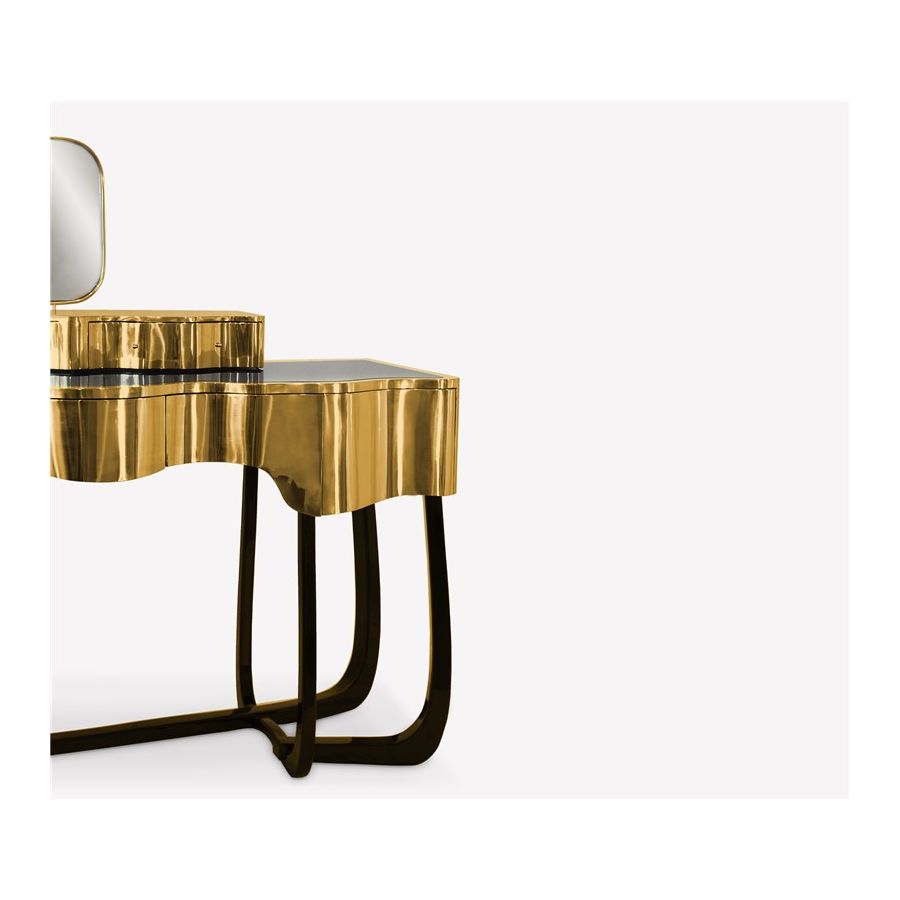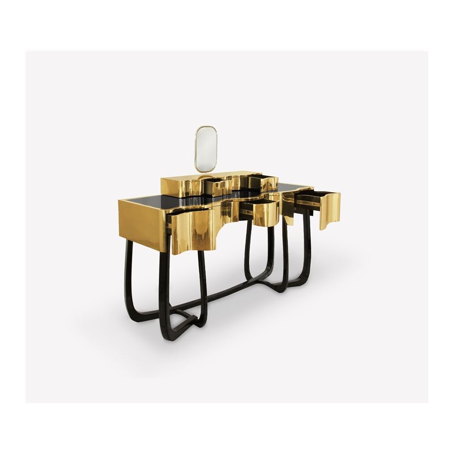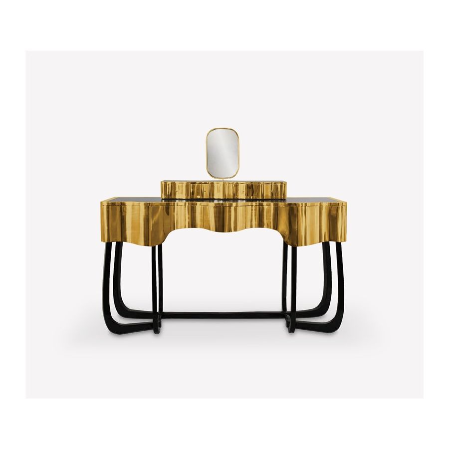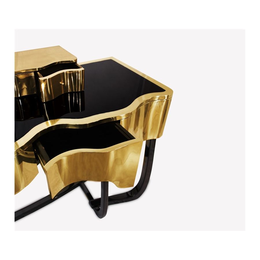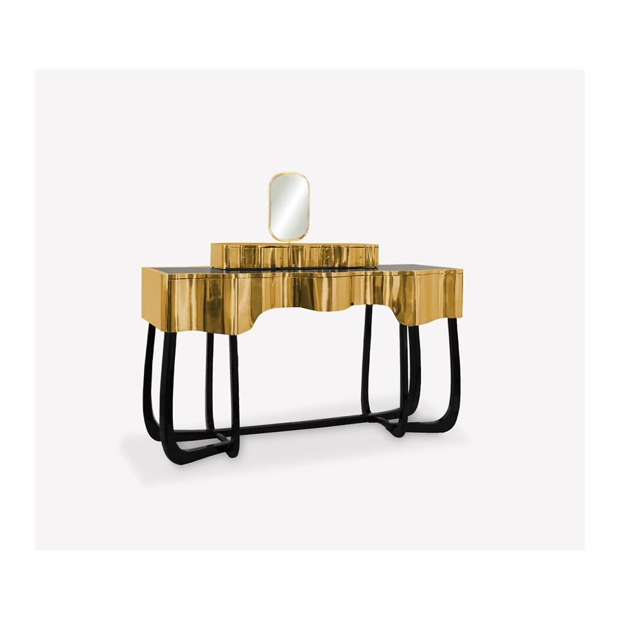 Sinuous is a vanity table designed with a modern and glamorous touch perfect for your bedroom or master bathroom set. Produced in wood, it is covered in black high gloss varnish and polished brass. It offers a lot of storage space, with four drawers on the top and five on the bottom, and a mirror accentuated by a gold plated rim. Its curved design will improve any bathroom design.