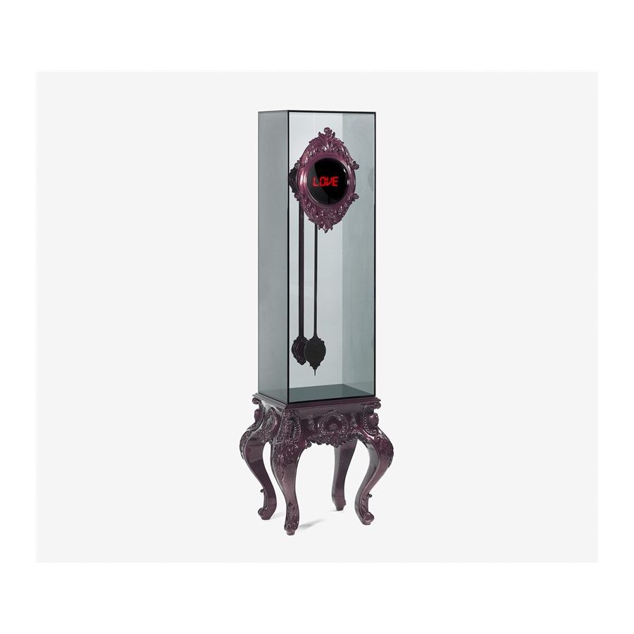 Carved digital clock made from mahogany. The pendulum is composed by stainless steel and inside by a tempered glass box. Hand carved mahogany base covered in silver leaf and finished with a combination of high gloss amethyst and smoked black translucent varnish. Base: hand carved mahogany covered in silver leaf and finished with a combination of high gloss amethyst and smoked black translucent varnish.