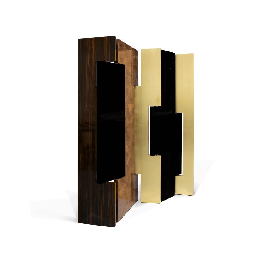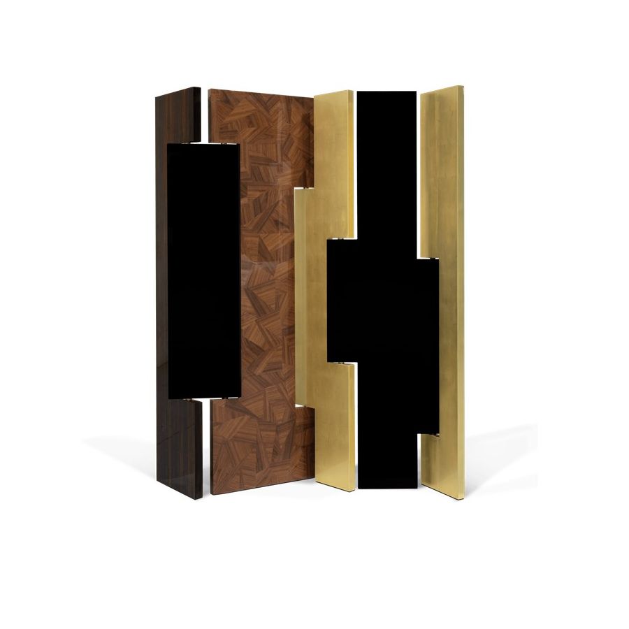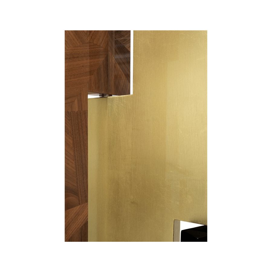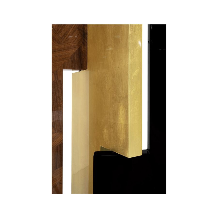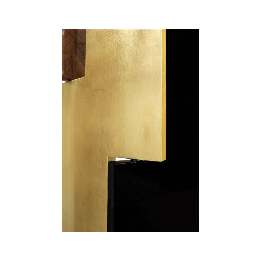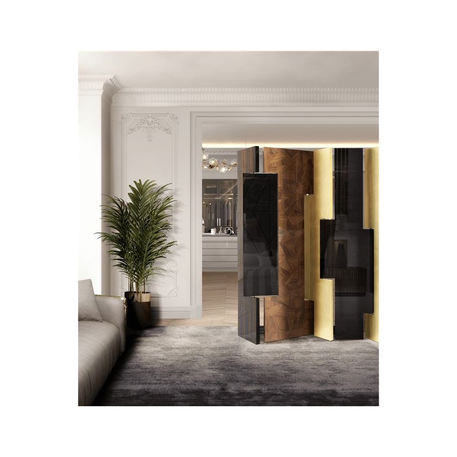 This distinctive folding screen is so elegant that can be easily placed in your home. Avenue is a striking piece that attracts attention and lightens the mood in any space. Its unique characteristics allow it to become a work of art by itself, or it can serve a functional purpose as a room divider. Place Avenue in your bedroom, in your entrance hall or in your living room. It will look beautifully in all of these spaces. Composed of six rotating panels finished in gold leaf with a high gloss varnish, black high gloss lacquer, and a geometric mosaic of walnut veneer and a book matched ebony veneer covered with high gloss varnish.
