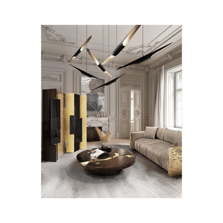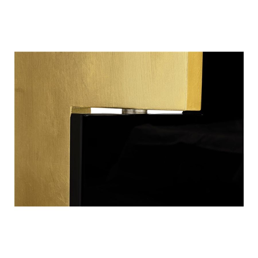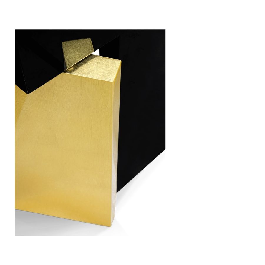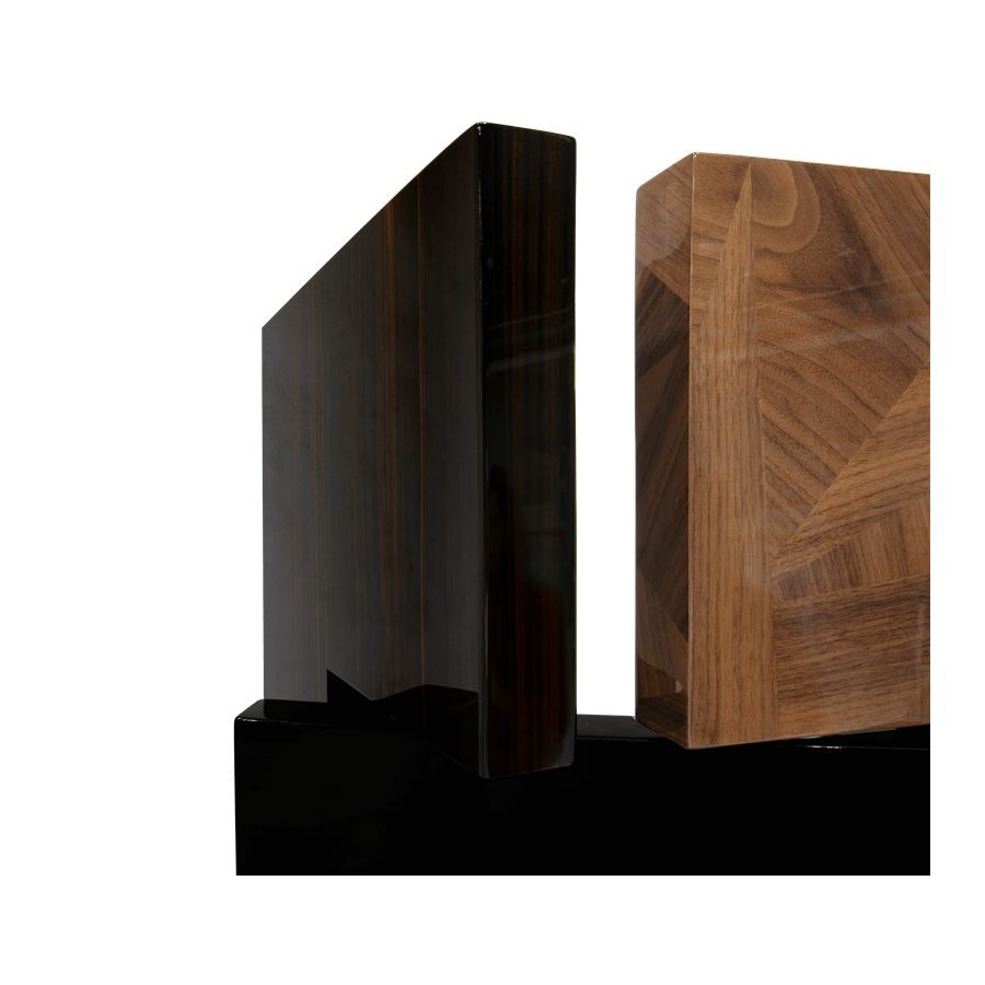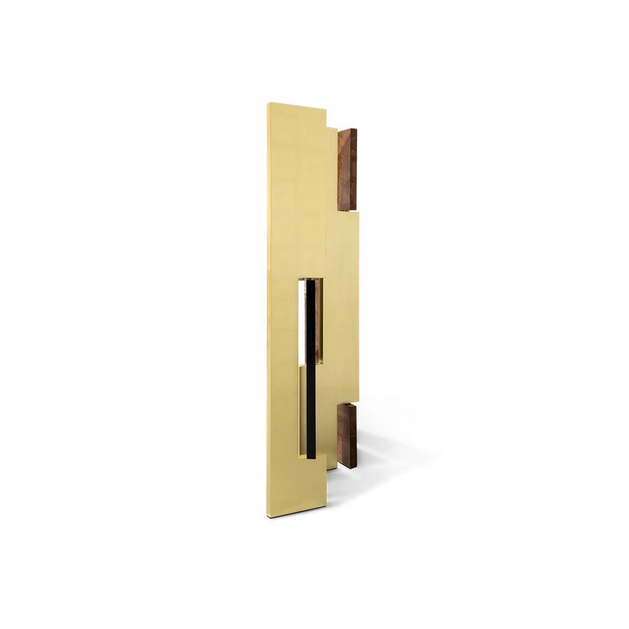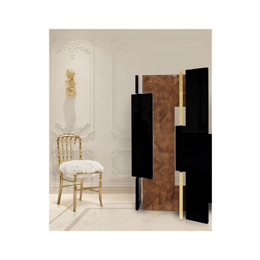This distinctive folding screen is so elegant that can be easily placed in your home. Avenue is a striking piece that attracts attention and lightens the mood in any space. Its unique characteristics allow it to become a work of art by itself, or it can serve a functional purpose as a room divider. Place Avenue in your bedroom, in your entrance hall or in your living room. It will look beautifully in all of these spaces. Composed of six rotating panels finished in gold leaf with a high gloss varnish, black high gloss lacquer, and a geometric mosaic of walnut veneer and a book matched ebony veneer covered with high gloss varnish.