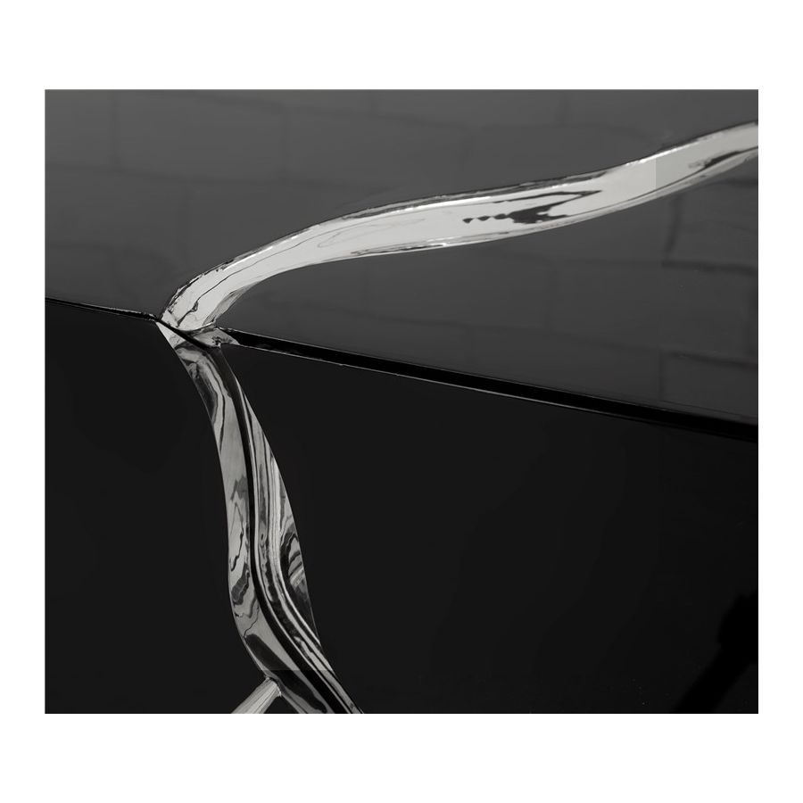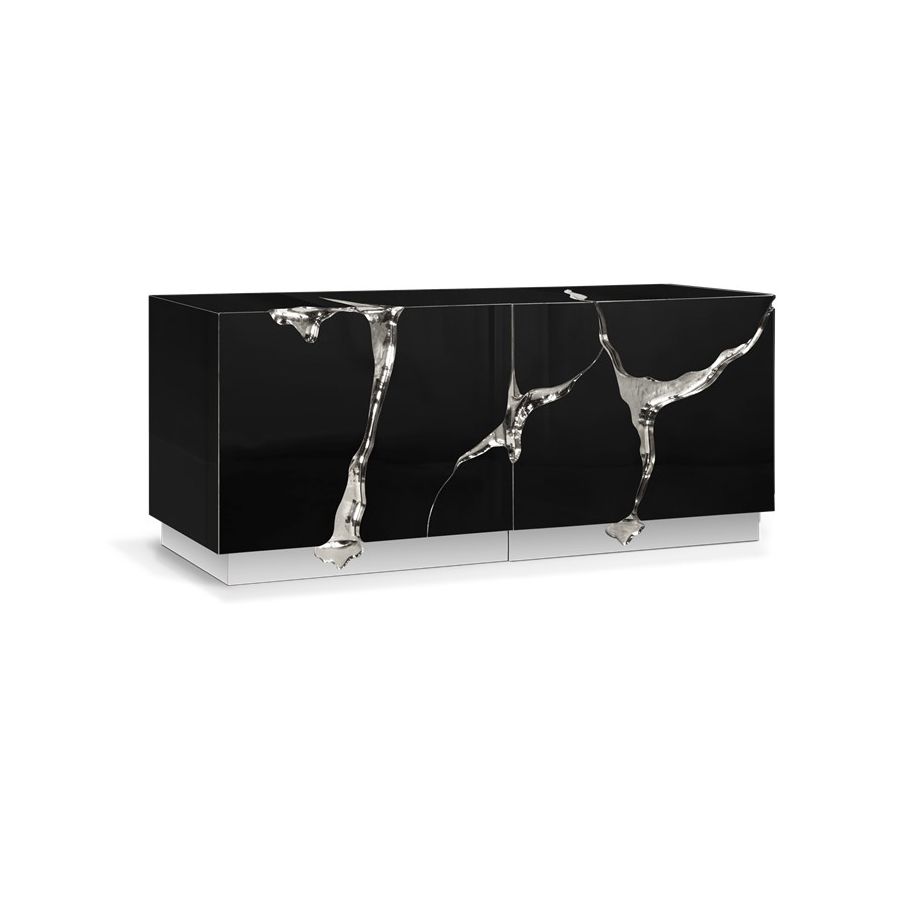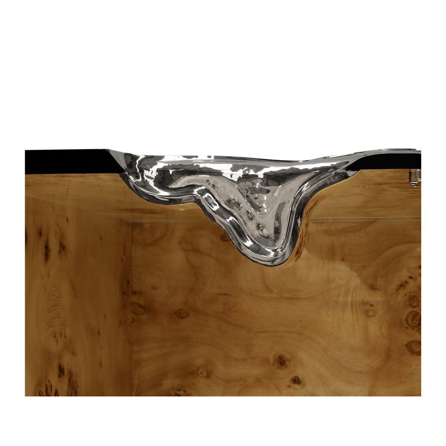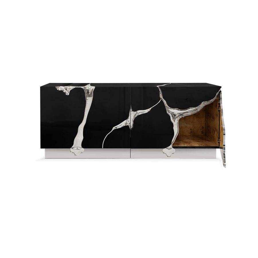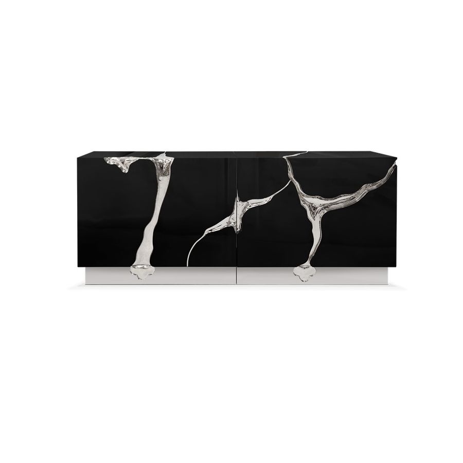 Its organic features are achieved through the manual fitting of stainless steel, and a glossy black lacquer finish that bursts from the inside to the distinct exterior façades. Different-shaped doors and drawer are embellished by hammered silver details, conveying both sophistication and elegance to bring a new contemporary verve into refined interiors.