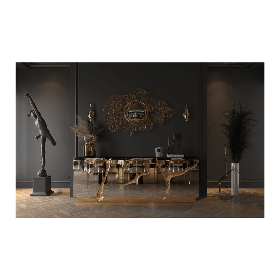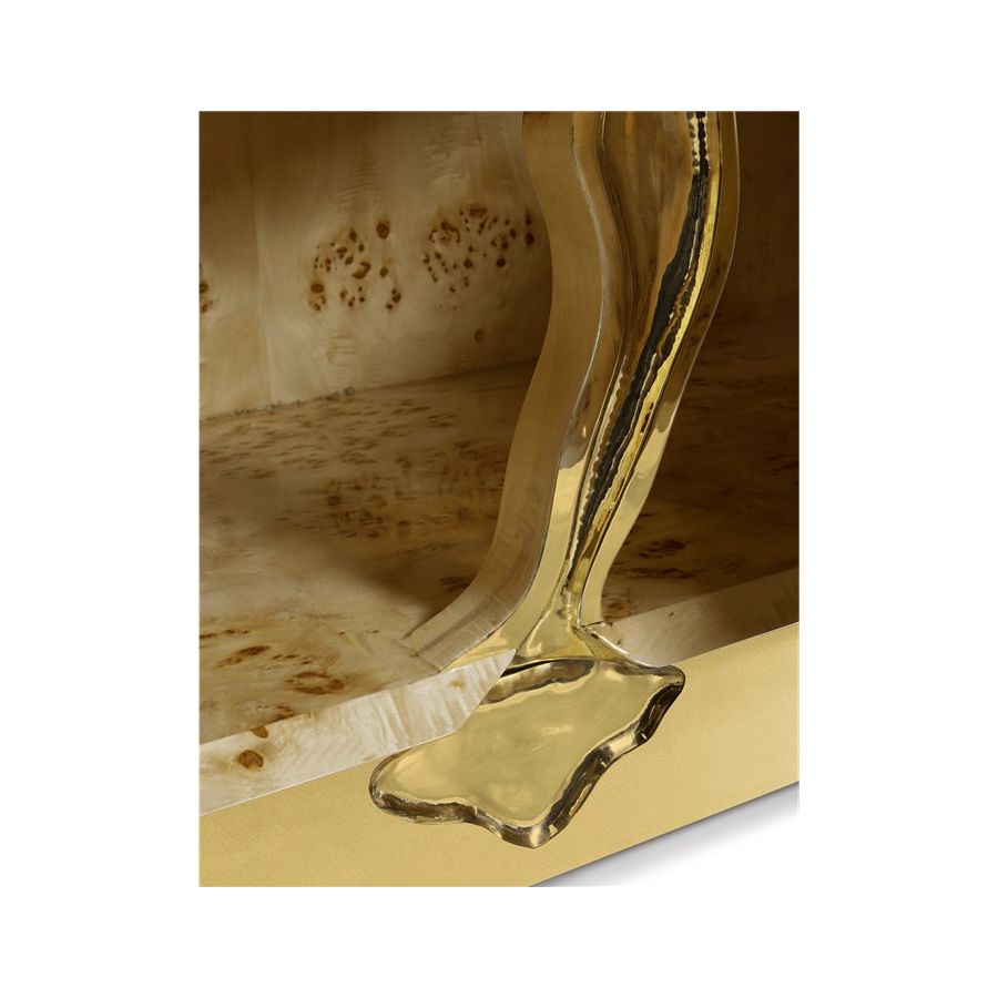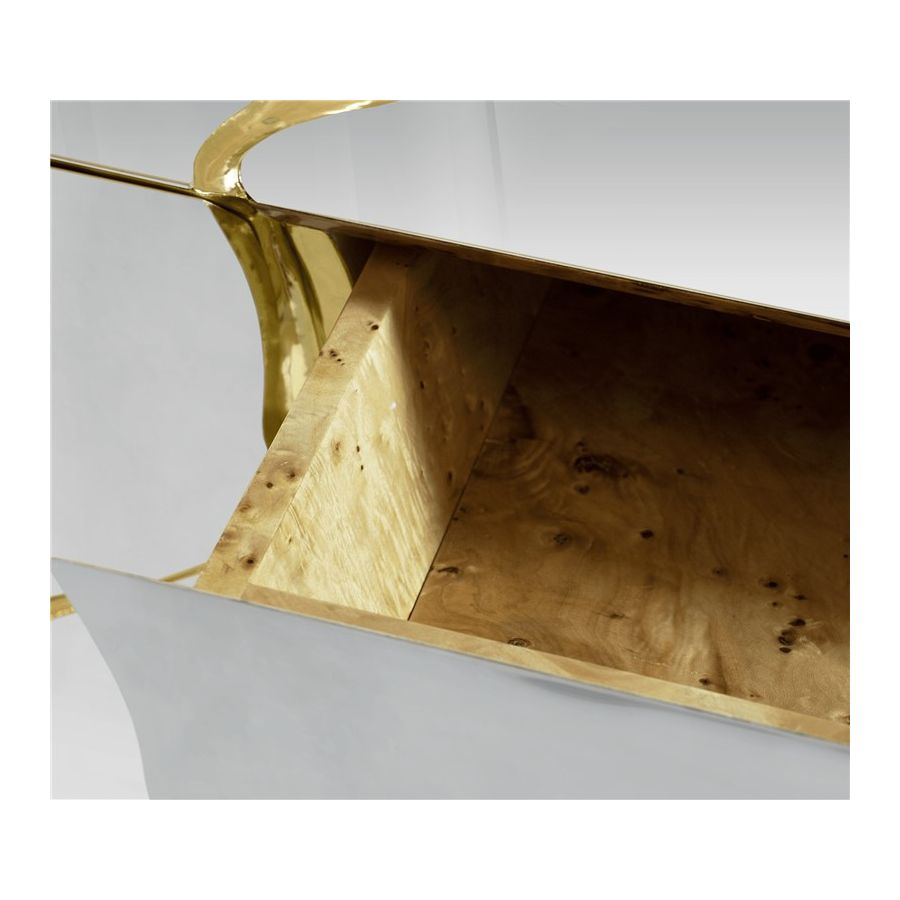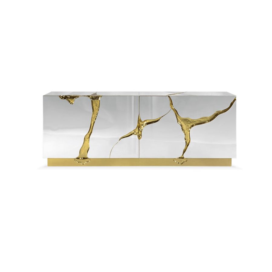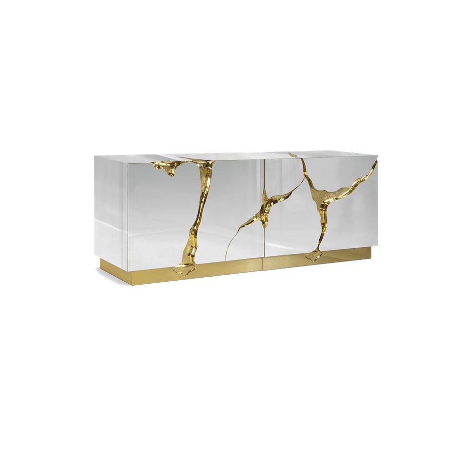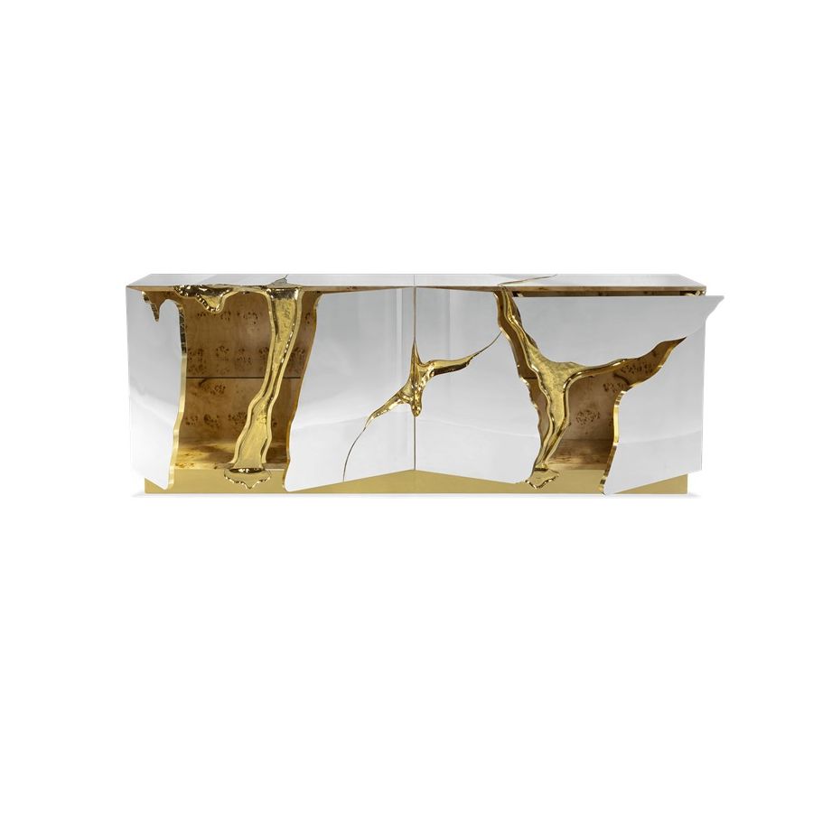 Lapiaz sideboard takes exceptional craftsmanship and design to a new realm. Finding beauty in the most unexpected places, this contemporary design piece is inspired by authentic karst formations. Its organic features are achieved through the manual fitting of polished brass, and a sharp finish in polished stainless steel that portrays a perfect mirror. Different-shaped doors and drawer open to a distinct poplar root wood veneer interior. The hammered gold details and the mirrored façade conveys both dynamics and elegance, a beautiful duality between power and refinement to bring a new contemporary verve into interior design. A functional artwork piece born from cold and freshly cracked to showing off the world rich, golden details.