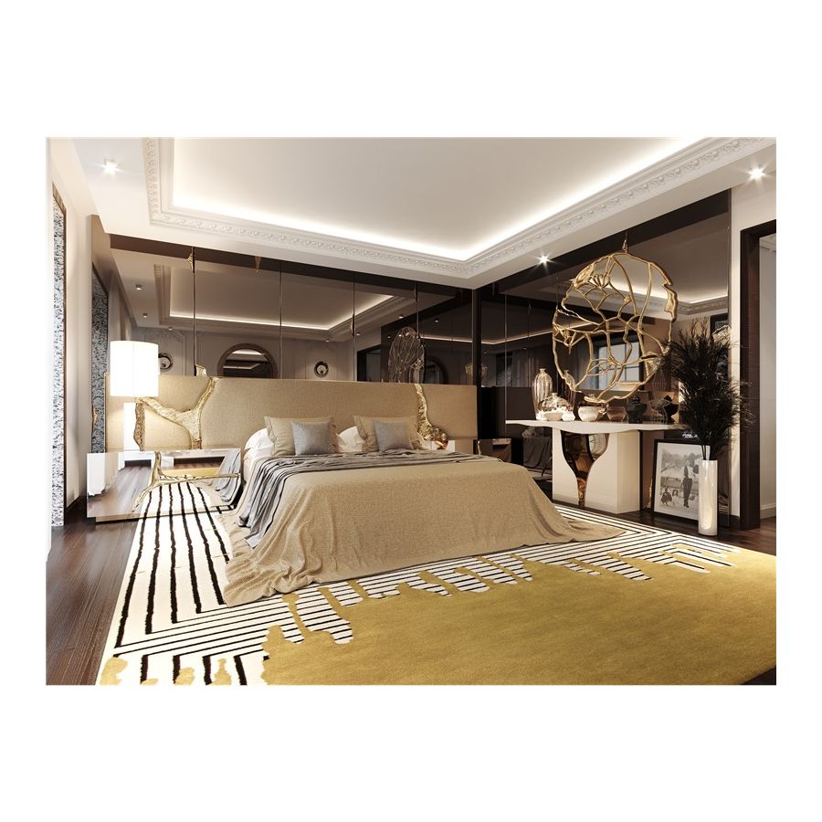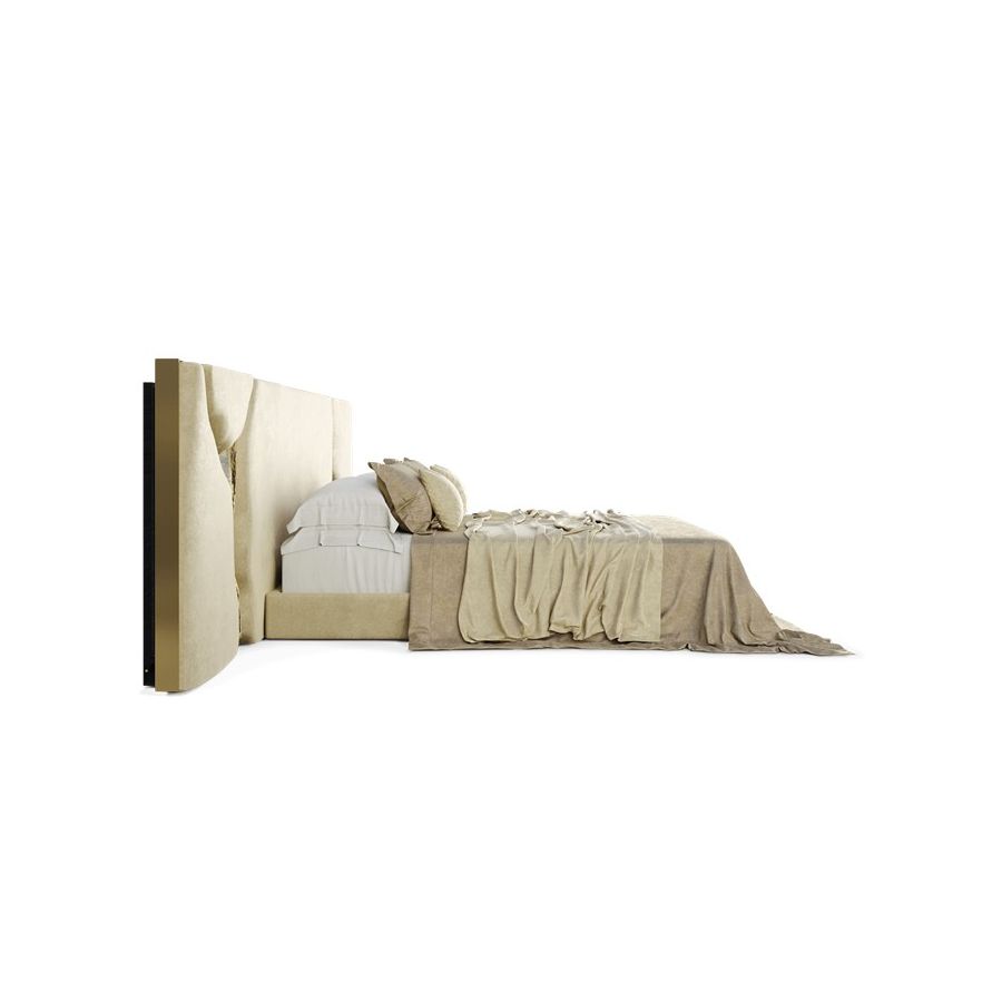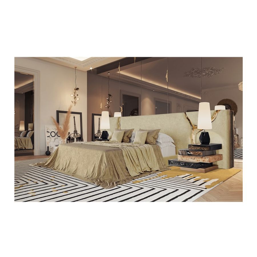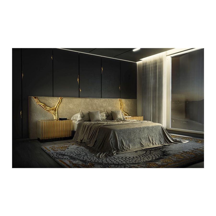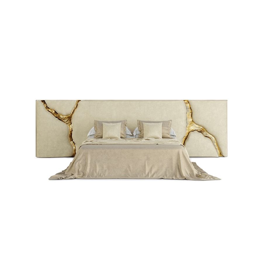 Lapiaz headboard takes exceptional craftsmanship and contemporary design to a new realm. The organic features of this upholstered headboard are achieved through the manual fitting of gold-polished brass into the velvet structure. A platform bed can be added under request and it can accommodate a range of mattress types.