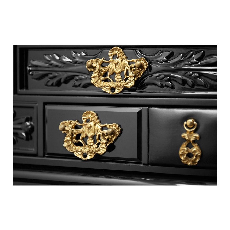 The base is composed by mahogany. The box is made by tempered glass with a frontal opening for the drawers. The structure is made in wood lacquered in black with a high gloss varnish; the drawers are handcrafted and contain wadding and a grey mirror. Handles are made through foundry process.