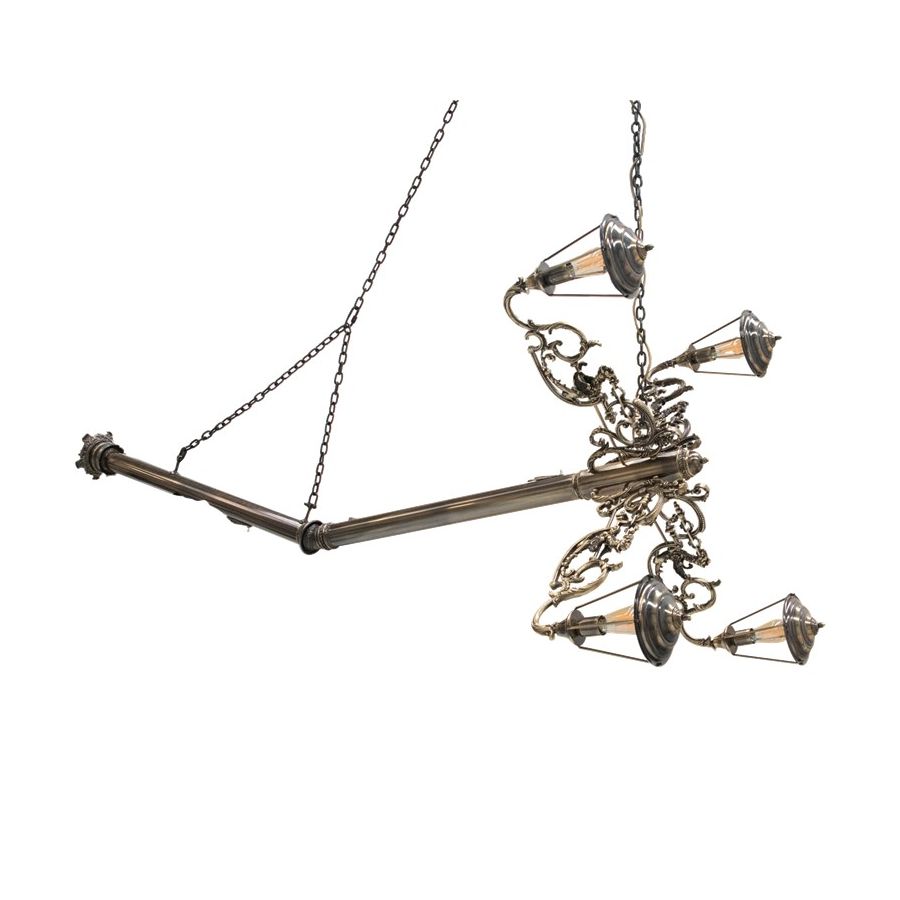 The mystic of late XIX century boulevards are brought home by the masterpiece Lumière suspension lamp. A confluence of Victorian street lights and architectural tectonic form, the Lumiére exemplifies the contemporary dualities of art and functionality. Hanged by two chains, a striking broken pole lies as an antique fixture with four intricate edge detailing arms topped by elegant pane lanterns hand-sculpted by casting molds. Born from the rich tradition of iron forging and skilled goldsmiths, this majestic chandelier is a soulful piece with classic distinction for outstanding private residences to the greatest contract settings. A ground-breaking collectible design for present-day luxe and timeless statement.