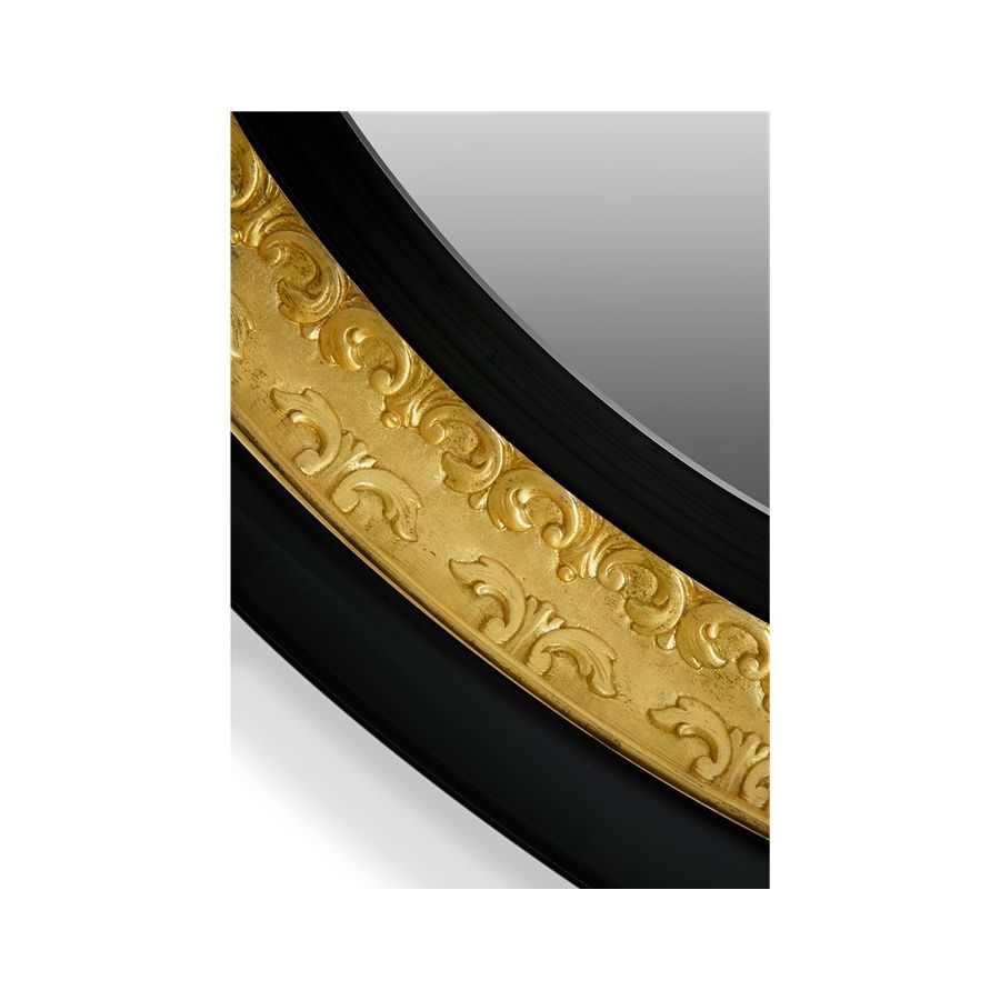Mirror with a frame in mahogany lacquered in black with a high gloss varnish. Between the frame and the mirror, you find carved details lined with golden leaf. Clear plane mirror.