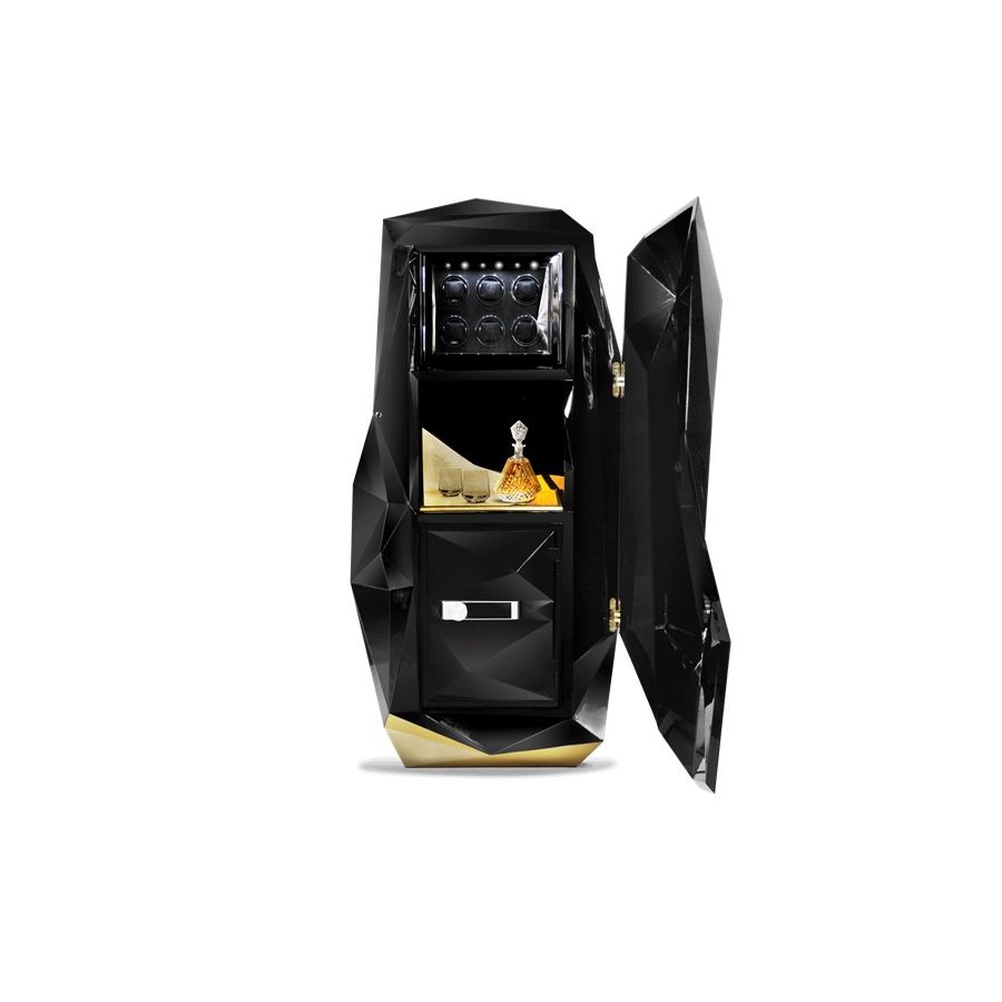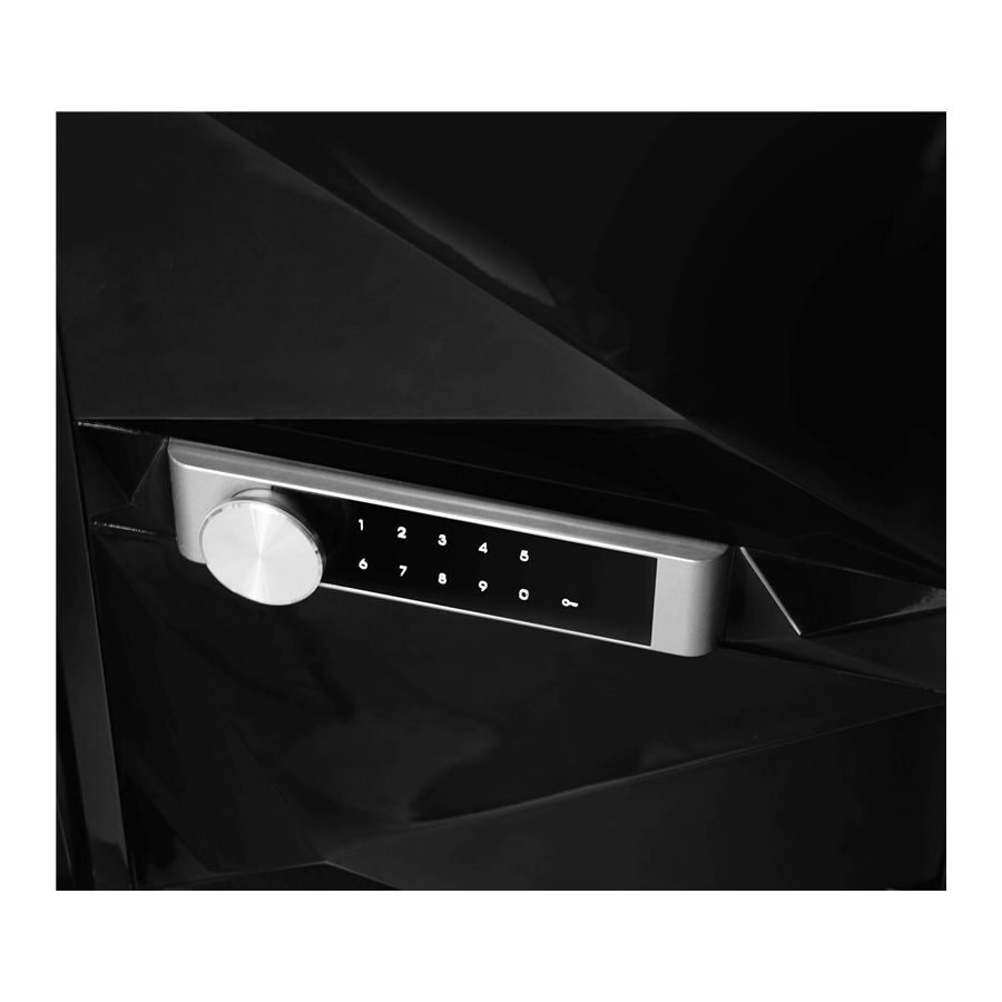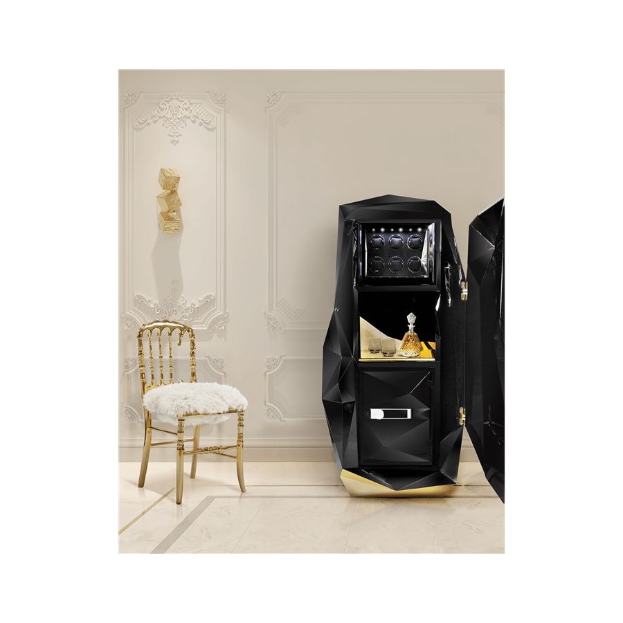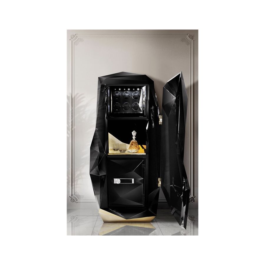 The Diamond floor safe reinterprets the quintessential diamond shape throughout contemporary design, a beautiful outcome of architectural thinking with elegant faceted lines. With a structure built in wood and finished in fine oriental black lacquer with a high gloss varnish coat, its hidden door conceals a six module watch winder box, a certified safe with a touch sensitive illuminated keypad, and a gold plated liquor pull-out tray.
