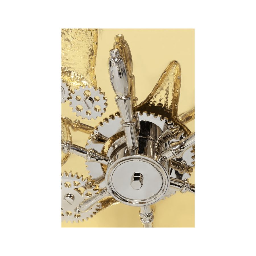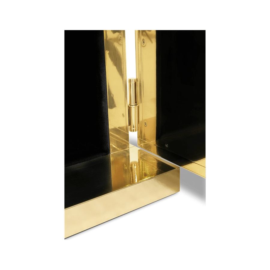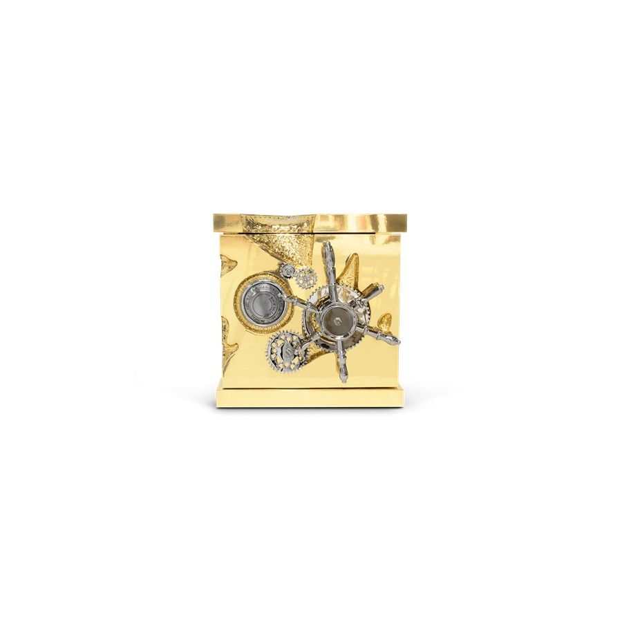 A small and portable version of the Millionaire Safe, the Millionaire Jewelry Safe is a statement piece influenced by the California Gold Rush and designed to cause an impression. Built in a gold-plated polished brass frame with dents that spark both interest and imagination, referencing the vault robbery attempts in the old west. Nestled in a turned brass gear-wheel mechanism, an imposing safe handle obeys the will of is master through a secret dial lock combination. The overlay door makes room for an open space lined in velvet to keep the most treasurable items, making it perfect to store valuable accessories, business items or other luxury lifestyle assets while causing an impression.