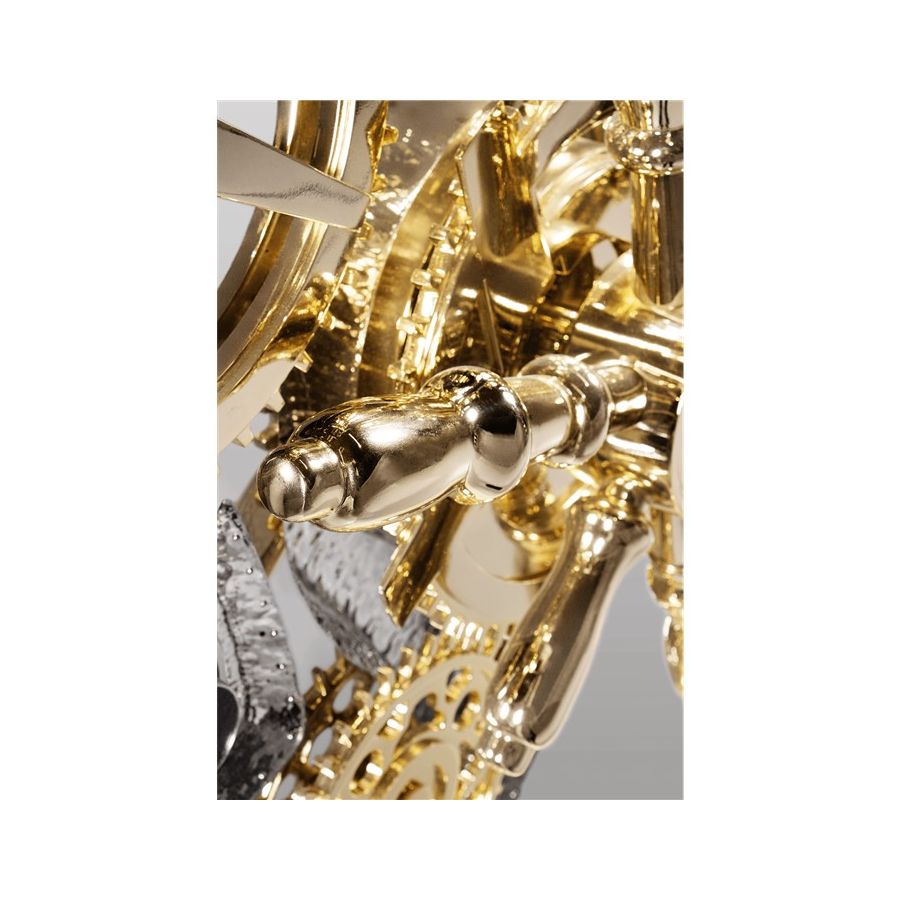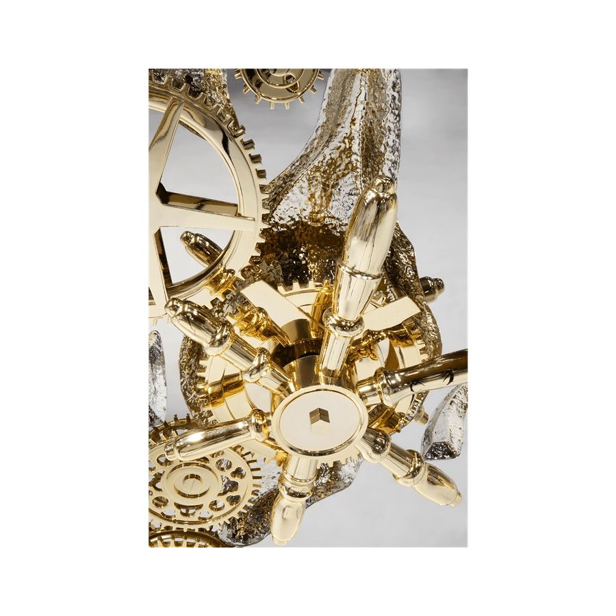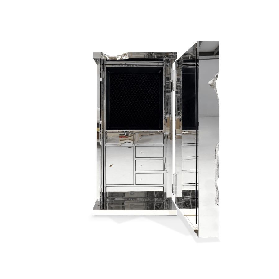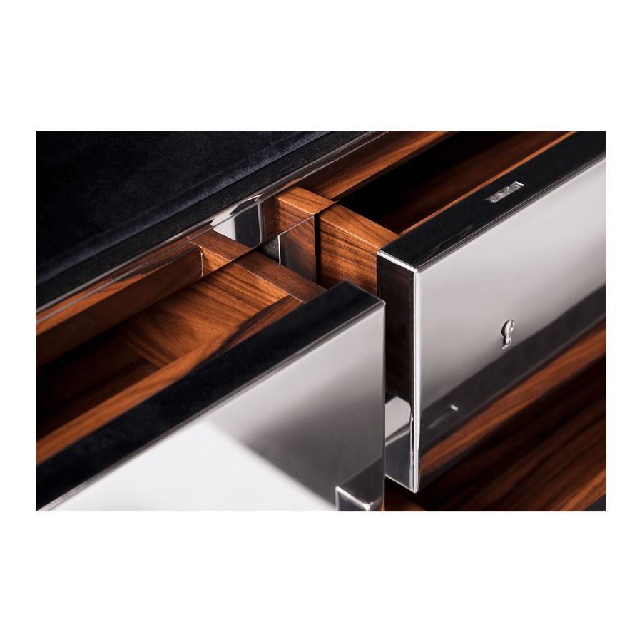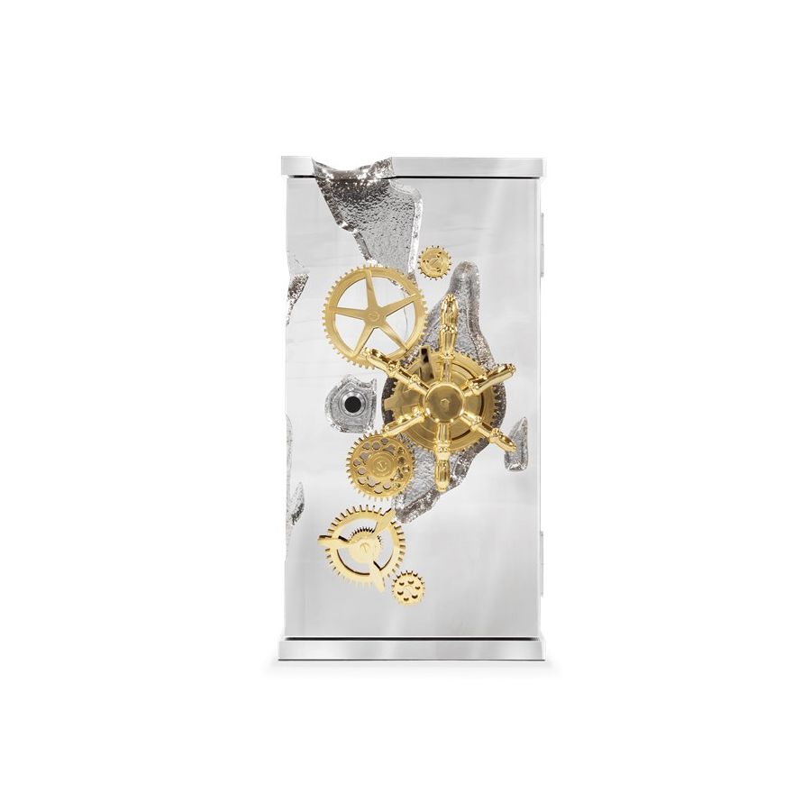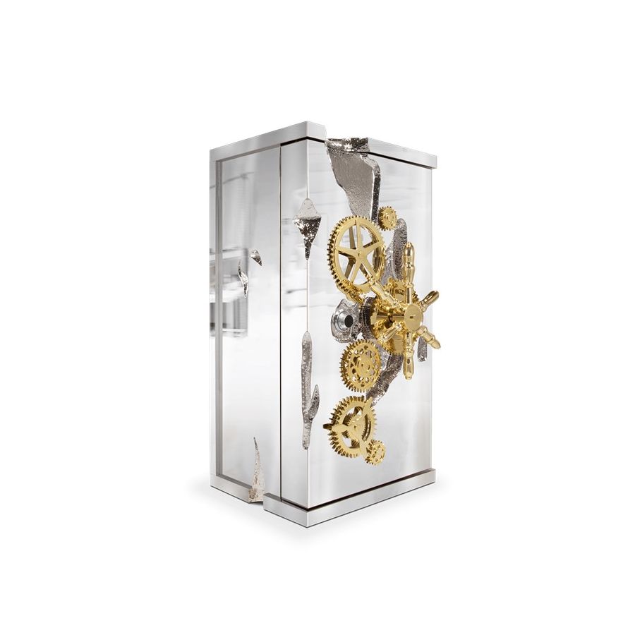 Influenced by the California Gold Rush, the Millionaire Safe is a statement piece designed to cause an impression. Built in a Mahogany structure and gold-plated polished brass frame with several dents, it sparks both interest and imagination reminding the vault robbery attempts in the old west. Nestled in a turned brass silver plated gear-wheel mechanism, an imposing safe handle obeys the will of is master through a secret dial lock combination. The overlay door makes room for an open space lined in velvet to keep liquors or other luxury lifestyle items, and a set of lockable drawers and door. Watch winders, shelves, an extra locking system and other features are able to customize.